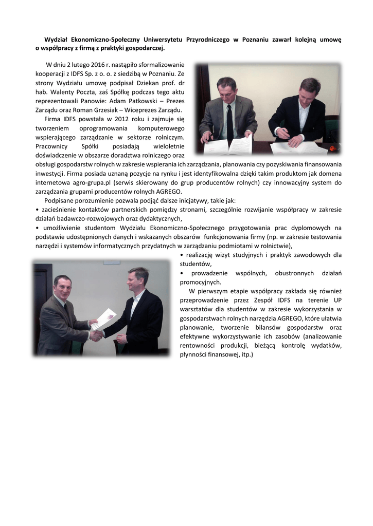 Wydział Ekonomiczno-Społeczny Uniwersytetu Przyrodniczego w Poznaniu zawarł kolejną umowę o współpracy z firmą z praktyki gospodarczej. W dniu 2 lutego 2016 r. nastąpiło sformalizowanie kooperacji z IDFS Sp. z o. o. z siedzibą w Poznaniu. Ze strony Wydziału umowę podpisał Dziekan prof. dr hab. Walenty Poczta, zaś Spółkę podczas tego aktu reprezentowali Panowie: Adam Patkowski – Prezes Zarządu oraz Roman Grzesiak – Wiceprezes Zarządu. Firma IDFS powstała w 2012 roku i zajmuje się tworzeniem oprogramowania komputerowego wspierającego zarządzanie w sektorze rolniczym. Pracownicy Spółki posiadają wieloletnie doświadczenie w obszarze doradztwa rolniczego oraz obsługi gospodarstw rolnych w zakresie wspierania ich zarządzania, planowania czy pozyskiwania finansowania inwestycji. Firma posiada uznaną pozycje na rynku i jest identyfikowalna dzięki takim produktom jak domena internetowa agro-grupa.pl (serwis skierowany do grup producentów rolnych) czy innowacyjny system do zarządzania grupami producentów rolnych AGREGO. Podpisane porozumienie pozwala podjąć dalsze inicjatywy, takie jak: • zacieśnienie kontaktów partnerskich pomiędzy stronami, szczególnie rozwijanie współpracy w zakresie działań badawczo-rozwojowych oraz dydaktycznych, • umożliwienie studentom Wydziału Ekonomiczno-Społecznego przygotowania prac dyplomowych na podstawie udostępnionych danych i wskazanych obszarów funkcjonowania firmy (np. w zakresie testowania narzędzi i systemów informatycznych przydatnych w zarządzaniu podmiotami w rolnictwie), • realizację wizyt studyjnych i praktyk zawodowych dla studentów, • prowadzenie wspólnych, obustronnych działań promocyjnych. W pierwszym etapie współpracy zakłada się również przeprowadzenie przez Zespół IDFS na terenie UP warsztatów dla studentów w zakresie wykorzystania w gospodarstwach rolnych narzędzia AGREGO, które ułatwia planowanie, tworzenie bilansów gospodarstw oraz efektywne wykorzystywanie ich zasobów (analizowanie rentowności produkcji, bieżącą kontrolę wydatków, płynności finansowej, itp.)