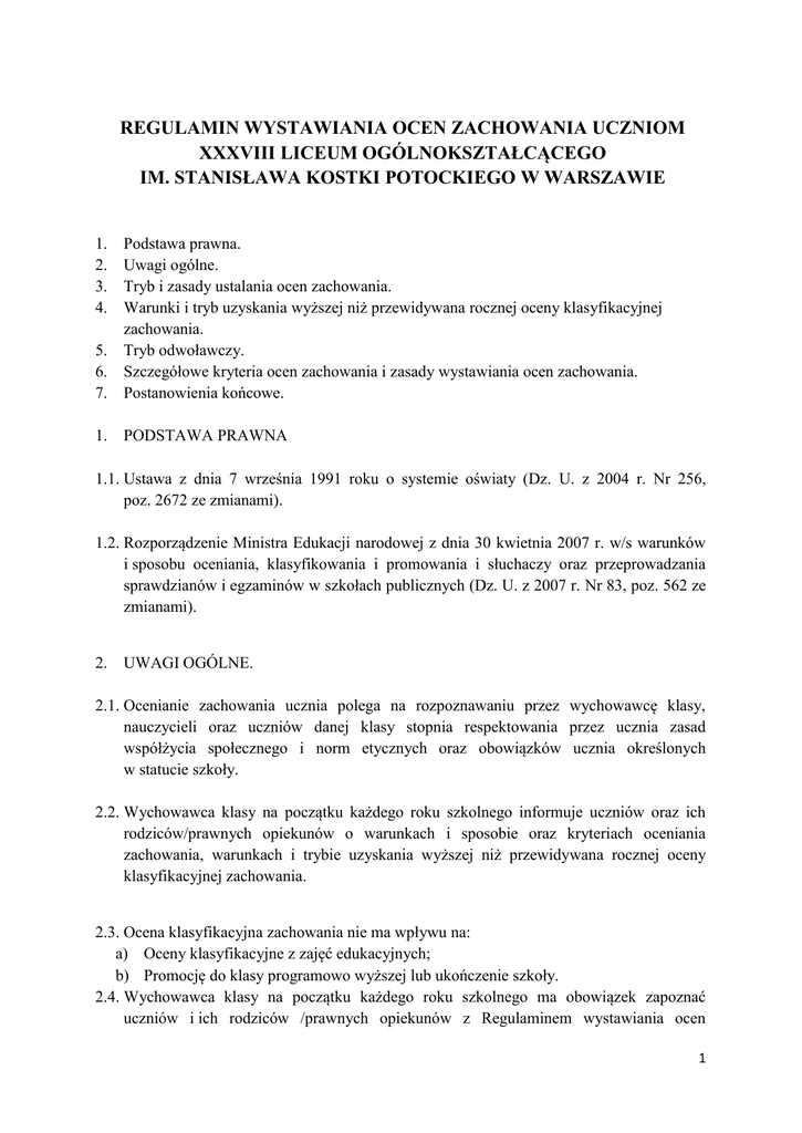 REGULAMIN WYSTAWIANIA OCEN ZACHOWANIA UCZNIOM XXXVIII LICEUM OGÓLNOKSZTAŁCĄCEGO IM. STANISŁAWA KOSTKI POTOCKIEGO W WARSZAWIE 1. 2. 3. 4. 5. 6. 7. Podstawa prawna. Uwagi ogólne. Tryb i zasady ustalania ocen zachowania. Warunki i tryb uzyskania wyższej niż przewidywana rocznej oceny klasyfikacyjnej zachowania. Tryb odwoławczy. Szczegółowe kryteria ocen zachowania i zasady wystawiania ocen zachowania. Postanowienia końcowe. 1. PODSTAWA PRAWNA 1.1. Ustawa z dnia 7 września 1991 roku o systemie oświaty (Dz. U. z 2004 r. Nr 256, poz. 2672 ze zmianami). 1.2. Rozporządzenie Ministra Edukacji narodowej z dnia 30 kwietnia 2007 r. w/s warunków i sposobu oceniania, klasyfikowania i promowania i słuchaczy oraz przeprowadzania sprawdzianów i egzaminów w szkołach publicznych (Dz. U. z 2007 r. Nr 83, poz. 562 ze zmianami). 2. UWAGI OGÓLNE. 2.1. Ocenianie zachowania ucznia polega na rozpoznawaniu przez wychowawcę klasy, nauczycieli oraz uczniów danej klasy stopnia respektowania przez ucznia zasad współżycia społecznego i norm etycznych oraz obowiązków ucznia określonych w statucie szkoły. 2.2. Wychowawca klasy na początku każdego roku szkolnego informuje uczniów oraz ich rodziców/prawnych opiekunów o warunkach i sposobie oraz kryteriach oceniania zachowania, warunkach i trybie uzyskania wyższej niż przewidywana rocznej oceny klasyfikacyjnej zachowania. 2.3. Ocena klasyfikacyjna zachowania nie ma wpływu na: a) Oceny klasyfikacyjne z zajęć edukacyjnych; b) Promocję do klasy programowo wyższej lub ukończenie szkoły. 2.4. Wychowawca klasy na początku każdego roku szkolnego ma obowiązek zapoznać uczniów i ich rodziców /prawnych opiekunów z Regulaminem wystawiania ocen 1 zachowania. Uczniowie zostają zapoznani z Regulaminem na pierwszym spotkaniu z wychowawcą (godzina wychowawcza), zaś rodzice – na pierwszym zebraniu w semestrze. W przypadku wprowadzenia zmian w Regulaminie wystawiania ocen zachowania do obowiązków wychowawcy należy zapoznanie uczniów i ich rodziców /prawnych opiekunów ze zmianami w najbliższym możliwym terminie. Informacja o poinformowaniu uczniów i rodziców musi być wpisana do dziennika lekcyjnego danej klasy. 3. TRYB I ZASADY USTALANIA OCEN ZACHOWANIA 3.1. Ocenę klasyfikacyjną zachowania ustala wychowawca klasy po zasięgnięciu opinii nauczycieli, uczniów danej klasy oraz ocenianego ucznia. 3.2. Wychowawca klasy pozyskuje systematycznie opinie o zachowaniu uczniów na podstawie uwag (notatek o uczniu) odnotowanych w dzienniku elektronicznym. 3.3. Ocena zachowania ma charakter jawny dla ucznia i jego rodziców /prawnych opiekunów. 3.4. Na wniosek ucznia lub jego rodziców /prawnych opiekunów wychowawca ma obowiązek pisemnego uzasadnienia ustalonej oceny. 3.5. Na 3 tygodnie przed posiedzeniem klasyfikacyjnym Rady Pedagogicznej wychowawca informuje ucznia i jego rodziców o przewidywanej dla niego rocznej (semestralnej) ocenie klasyfikacyjnej zachowania. 3.6. Semestralną i roczną ocenę klasyfikacyjną zachowania ustala się według następującej skali: a. wzorowe, b. bardzo dobre, c. dobre, d. poprawne, e. nieodpowiednie, f. naganne. z zastrzeżeniem punktu 3.7. Regulaminu. 3.7. Przy ustalaniu semestralnej lub rocznej oceny klasyfikacyjnej zachowania ucznia, u którego stwierdzono zaburzenia lub odchylenia rozwojowe uwzględnia się wpływ stwierdzonych zaburzeń lub odchyleń na jego zachowanie na podstawie orzeczenia o potrzebie kształcenia specjalnego albo indywidualnego nauczania lub opinii publicznej poradni psychologiczno – pedagogicznej, w tym publicznej poradni specjalistycznej. 2 3.8. Dokumentacja, dotycząca punktu 3.7. Regulaminu wystawiania oceny klasyfikacyjnej zachowania jest przechowywana przez pedagoga szkolnego. 3.9. Ocenę zachowania ucznia ustala się uwzględniając w szczególności: 3.9.1. wywiązywanie się z obowiązków ucznia; 3.9.2. postępowanie zgodne z dobrem społeczności szkolnej; 3.9.3. dbałość o honor i tradycje szkoły; 3.9.4. dbałość o piękno mowy ojczystej; 3.9.5. dbałość o bezpieczeństwo i zdrowie własne oraz innych osób; 3.9.6. godne, kulturalne zachowanie się w szkole i poza nią; 3.9.7. postawę etyczną i kulturę osobistą; w tym okazywanie szacunku innym osobom; 3.9.8. zaangażowanie społeczne. 3.10. Ocenianiu podlega dbałość o wygląd zewnętrzny ucznia na terenie szkoły oraz wycieczek. 3.10.1. Na egzaminach, uroczystościach, akademiach i apelach szkolnych uczeń zobowiązany jest do pojawiania się w stroju galowym. Za strój galowy uważa się: a) damski: granatowa lub czarna spódnica do kolan lub dłuższa, biała koszula lub bluzka oraz eleganckie buty, delikatny makijaż; b) męski: biała koszula, czarne lub granatowe spodnie oraz eleganckie buty. 3.10.2. Na terenie szkoły, podczas zajęć i uroczystości uczniom zabrania się noszenia nakryć głowy, przezroczystych ubrań, szortów, ostrego makijażu. Uczeń jest również zobowiązany do zmiany butów. W budynku szkolnym dopuszcza się baleriny, tenisówki, trampki, espadryle i kapcie. 3.11. Godziny nieobecności na zajęciach edukacyjnych oraz spóźnienia mogą być usprawiedliwione przez wychowawcę: 3.11.1. na podstawie pisemnej notatki rodziców/prawnych opiekunów lub innych uprawnionych do tego osób, np. znajdującej się w zeszycie korespondencji; 3.11.2. na podstawie pisemnej notatki, dostarczonej drogą poczty e- mailowej lub dziennika elektronicznego, z tym jednak zastrzeżeniem, iż usprawiedliwienie takie musi być potwierdzone osobiście przez rodzica /prawnego opiekuna na najbliższym spotkaniu z wychowawcą klasy. 3.11.3. Nauczyciel może nie uwzględnić usprawiedliwienia (spełniającego warunki, określone w punkcie 3.10.1.) lub odmówić zwolnienia ucznia z zajęć, jeśli nie została podana przez rodziców/prawnych opiekunów przyczyna nieobecności lub zwolnienia ucznia z zajęć. 3.11.4. Wychowawca klasy może nie uwzględnić usprawiedliwienia nieobecności równ