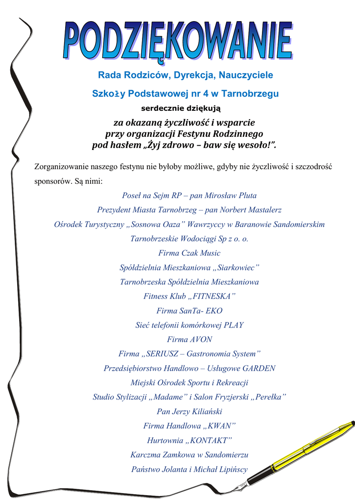 Rada Rodziców, Dyrekcja, Nauczyciele Szkoły Podstawowej nr 4 w Tarnobrzegu serdecznie dziękują za okazaną życzliwość i wsparcie przy organizacji Festynu Rodzinnego pod hasłem „Żyj zdrowo – baw się wesoło!”. Panu Zorganizowanie naszego festynu nie byłoby możliwe, gdyby nie życzliwość i szczodrość sponsorów. Są nimi: Poseł na Sejm RP – pan Mirosław Pluta Prezydent Miasta Tarnobrzeg – pan Norbert Mastalerz Ośrodek Turystyczny „Sosnowa Oaza” Wawrzyccy w Baranowie Sandomierskim Tarnobrzeskie Wodociągi Sp z o. o. Firma Czak Music Spółdzielnia Mieszkaniowa „Siarkowiec” Tarnobrzeska Spółdzielnia Mieszkaniowa Fitness Klub „FITNESKA” Firma SanTa- EKO Sieć telefonii komórkowej PLAY Firma AVON Firma „SERIUSZ – Gastronomia System” Przedsiębiorstwo Handlowo – Usługowe GARDEN Dyrektor szkoły Miejski Ośrodek Sportu i Rekreacji Studio Stylizacji „Madame” i Salon Fryzjerski „Perełka” Pan Jerzy Kiliański Firma Handlowa „KWAN” Hurtownia „KONTAKT” Karczma Zamkowa w Sandomierzu Państwo Jolanta i Michał Lipińscy Dziękujemy przedstawicielom: Komendy Miejskiej Policji w Tarnobrzegu Zakładu Linii Kolejowych w Lublinie i Straży Ochrony Kolei Stowarzyszenia na Rzecz Ekorozwoju Wsi Cygany Gorzyckiego Klubu Karate Kyokushin Tarnobrzeskiej Szkoły Tai Chi "Nan Bei - Biały Żuraw" SEED- BALL POLSKA A także Drogim Rodzicom, którzy wykonali piękne prace na stoisko z rękodziełem, przekazywali fanty na loterię, przygotowali ciasta i zdrowe przekąski, obsługiwali stoiska oraz w inny sposób włączyli się w organizację naszej imprezy. Głęboko wierzymy, że okazywana przez Państwa siła serca i przyjazna dłoń, będą nas wspierać w dalszej pracy podejmowanej dla dobra dziecka.