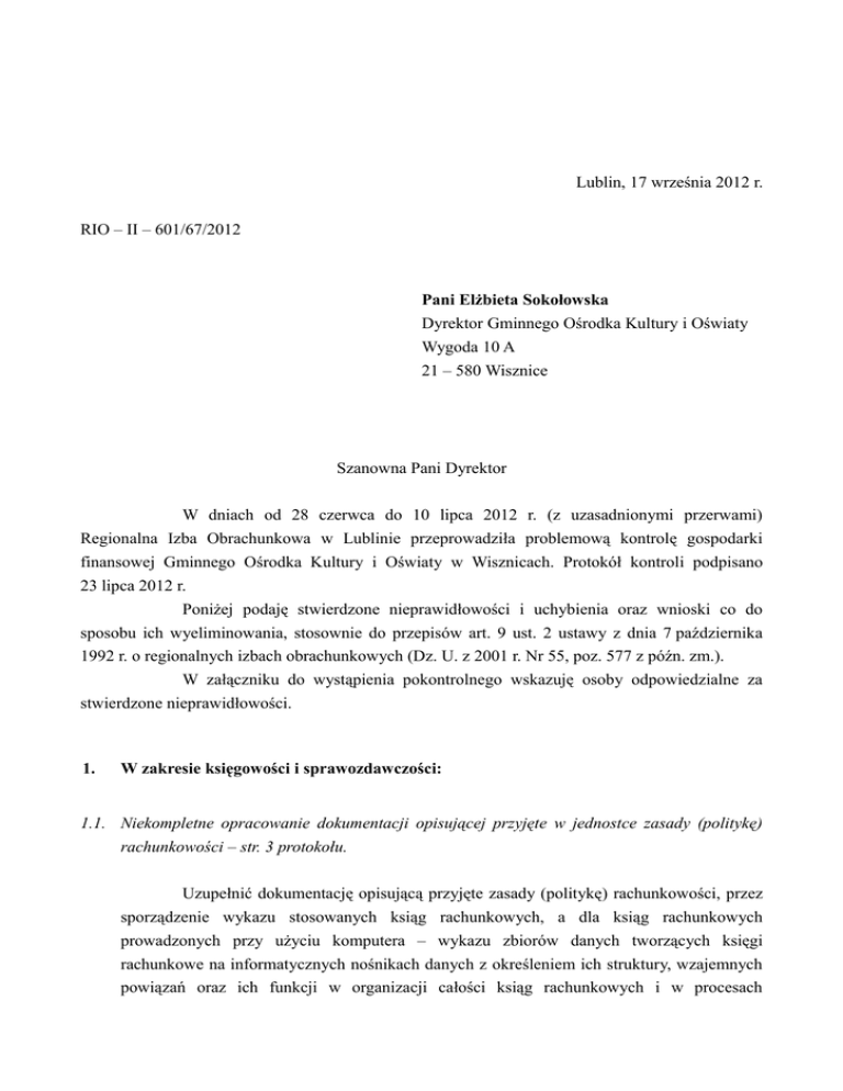 Lublin, 17 września 2012 r. RIO – II – 601/67/2012 Pani Elżbieta Sokołowska Dyrektor Gminnego Ośrodka Kultury i Oświaty Wygoda 10 A 21 – 580 Wisznice Szanowna Pani Dyrektor W dniach od 28 czerwca do 10 lipca 2012 r. (z uzasadnionymi przerwami) Regionalna Izba Obrachunkowa w Lublinie przeprowadziła problemową kontrolę gospodarki finansowej Gminnego Ośrodka Kultury i Oświaty w Wisznicach. Protokół kontroli podpisano 23 lipca 2012 r. Poniżej podaję stwierdzone nieprawidłowości i uchybienia oraz wnioski co do sposobu ich wyeliminowania, stosownie do przepisów art. 9 ust. 2 ustawy z dnia 7 października 1992 r. o regionalnych izbach obrachunkowych (Dz. U. z 2001 r. Nr 55, poz. 577 z późn. zm.). W załączniku do wystąpienia pokontrolnego wskazuję osoby odpowiedzialne za stwierdzone nieprawidłowości. 1. W zakresie księgowości i sprawozdawczości: 1.1. Niekompletne opracowanie dokumentacji opisującej przyjęte w jednostce zasady (politykę) rachunkowości – str. 3 protokołu. Uzupełnić dokumentację opisującą przyjęte zasady (politykę) rachunkowości, przez sporządzenie wykazu stosowanych ksiąg rachunkowych, a dla ksiąg rachunkowych prowadzonych przy użyciu komputera – wykazu zbiorów danych tworzących księgi rachunkowe na informatycznych nośnikach danych z określeniem ich struktury, wzajemnych powiązań oraz ich funkcji w organizacji całości ksiąg rachunkowych i w procesach przetwarzania danych, stosownie do przepisów art. 10 ust. 1 pkt 3 lit. b ustawy z dnia 29 września 1994 r. o rachunkowości (Dz. U. z 2009 r. Nr 152, poz. 1223 z późn. zm.). Ustalenie i bieżące aktualizowanie dokumentacji opisującej przyjęte przez jednostkę zasady (politykę) rachunkowości należy – w myśl przepisów art. 10 ust. 2 ustawy o rachunkowości – do obowiązków kierownika jednostki. 1.2. Nieoznaczenie dziennika oraz zestawienia obrotów i sald kont księgi głównej jednostki (prowadzonych przy użyciu komputera) datą ich sporządzenia – str. 3 protokołu. Księgi rachunkowe prowadzone przy użyciu komputera wyraźnie oznaczać co do daty ich sporządzenia, stosownie do przepisów art. 13 ust. 4 pkt 2 ustawy o rachunkowości. 1.3. Niezamieszczanie w dzienniku jednostki (prowadzonym przy użyciu komputera) danych pozwalających na ustalenie osoby odpowiedzialnej za treść zapisu – str. 4 protokołu. W księgach rachunkowych, prowadzonych przy użyciu komputera, zamieszczać dane pozwalające na ustalenie osoby odpowiedzialnej za treść zapisu, stosownie do przepisów art. 14 ust. 4 ustawy o rachunkowości. 1.4. Ewidencjonowanie operacji gospodarczych na koncie 210, nieprzewidzianym do stosowania w zakładowym planie kont. Ujmowanie na koncie 201 „Rozrachunki z odbiorcami i dostawcami” należności i zobowiązań jednostki, w sytuacji gdy w zakładowym planie kont przewidziano prowadzenie odrębnych kont, tj. dla należności – konta 201 „Należności od odbiorców”, a dla zobowiązań - konta 202 „Rozrachunki z dostawcami” – str. 4, 5 protokołu. Zapisów operacji gospodarczych występujących w jednostce dokonywać na kontach przewidzianych do stosowania w zakładowym planie kont, w związku z przepisami art. 10 ust. 1 pkt 3 lit. „a” ustawy o rachunkowości. Jeżeli zamieszczona w zakładowym planie kont liczba kont syntetycznych jest niewystarczająca w stosunku do potrzeb prowadzenia prawidłowej ewidencji – uzupełnić zakładowy plan kont o konta dodatkowe, zgodne co do treści ekonomicznej z odpowiednimi kontami planu kont, w myśl przepisów § 15 ust. 1 rozporządzenia Ministra Finansów z dnia 5 lipca 2010 r. w sprawie szczególnych zasad rachunkowości oraz planów kont dla budżetu państwa, budżetów jednostek samorządu terytorialnego, jednostek budżetowych, samorządowych zakładów budżetowych, państwowych funduszy celowych oraz państwowych jednostek budżetowych mających siedzibę poza granicami Rzeczypospolitej Polskiej (Dz. U. Nr 128, poz. 861 z późn. zm.), zwanego w dalszej części tego wystąpienia „rozporządzeniem Ministra Finansów z dnia 5 lipca 2010 r.” lub dostosować postanowienia zakładowego planu kont do przyjętej w jednostce praktyki. 1.5. Niezachowanie na przełomie roku 2011 i 2012 ciągłości bilansowej w zakresie konta 201 „Rozrachunki z odbiorcami i dostawcami” wskutek zamknięcia tego konta na koniec 2011 r. tzw. „per saldem” (do bilansu otwarcia 2012 r. wprowadzono prawidłowe salda należności i zobowiązań tego konta) – str. 5 protokołu. Wykazane w księgach rachunkowych na dzień ich zamknięcia stany aktywów i pasywów ujmować - w tej samej wysokości - w otwartych na następny rok obrotowy księgach rachunkowych, stosownie do przepisów art. 5 ust. 1 ustawy o rachunkowości. Na kontach rozrachunkowych wykazywać rzeczywiste stany należności i zobowiązań, nie dokonując ich wzajemnych kompensat, w związku z przepisami art. 7 ust. 3 tej ustawy i zasadami funkcjonowania konta 201 „Rozrachunki z odbiorcami i dostawcami”, określonymi w załączniku Nr 3 do rozporządzenia Ministra Finansów z dnia 5 lipca 2010 r. 1.6. Nieterminowe regulowanie zobowiązań – str. 6 protokołu. Wydatków publicznych dokonywać w terminach wynikających z wcześniej zaciągniętych zobowiązań, stosownie do przepisów art. 44 ust. 3 pkt 3 ustawy z dnia 27 sierpnia 2009 r. o finansach publicznych (Dz. U. Nr 157, poz. 1240 z późn. zm.). 1.7. Nieegzekwowanie należności Gminnego Ośrodka Kultury i Oświaty w Wisznicach z tytułu wynajmu lokalu, sali i sprzętu, wynikających z wystawionych faktur – str. 7, 8 protokołu. Podejmować konsekwentne czynności zmierzające do wyegzekwowania zaległych należności jednostki. Do podmiotów zalegających z uiszczeniem należności kierować wezwania do zapłaty z określeniem terminu zapłaty, a po jego bezskutecznym upływie rozważać kierowanie spraw na drogę postępowania sądowego, na podstawie przepisów 