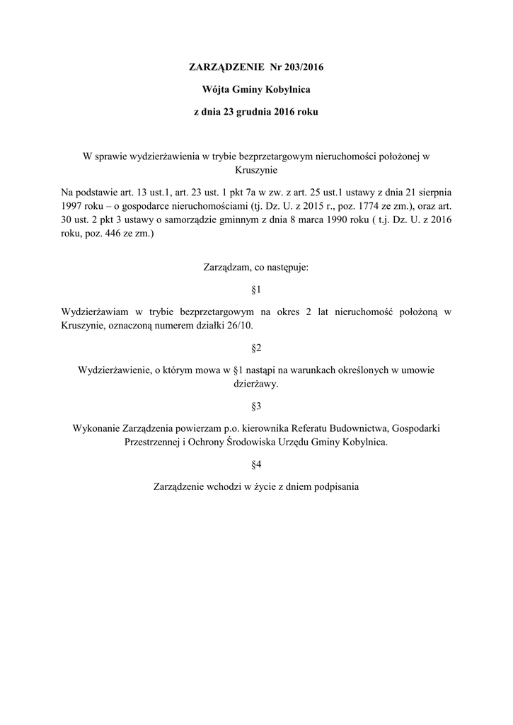 ZARZĄDZENIE Nr 203/2016 Wójta Gminy Kobylnica z dnia 23 grudnia 2016 roku W sprawie wydzierżawienia w trybie bezprzetargowym nieruchomości położonej w Kruszynie Na podstawie art. 13 ust.1, art. 23 ust. 1 pkt 7a w zw. z art. 25 ust.1 ustawy z dnia 21 sierpnia 1997 roku – o gospodarce nieruchomościami (tj. Dz. U. z 2015 r., poz. 1774 ze zm.), oraz art. 30 ust. 2 pkt 3 ustawy o samorządzie gminnym z dnia 8 marca 1990 roku ( t.j. Dz. U. z 2016 roku, poz. 446 ze zm.) Zarządzam, co następuje: §1 Wydzierżawiam w trybie bezprzetargowym na okres 2 lat nieruchomość położoną w Kruszynie, oznaczoną numerem działki 26/10. §2 Wydzierżawienie, o którym mowa w §1 nastąpi na warunkach określonych w umowie dzierżawy. §3 Wykonanie Zarządzenia powierzam p.o. kierownika Referatu Budownictwa, Gospodarki Przestrzennej i Ochrony Środowiska Urzędu Gminy Kobylnica. §4 Zarządzenie wchodzi w życie z dniem podpisania