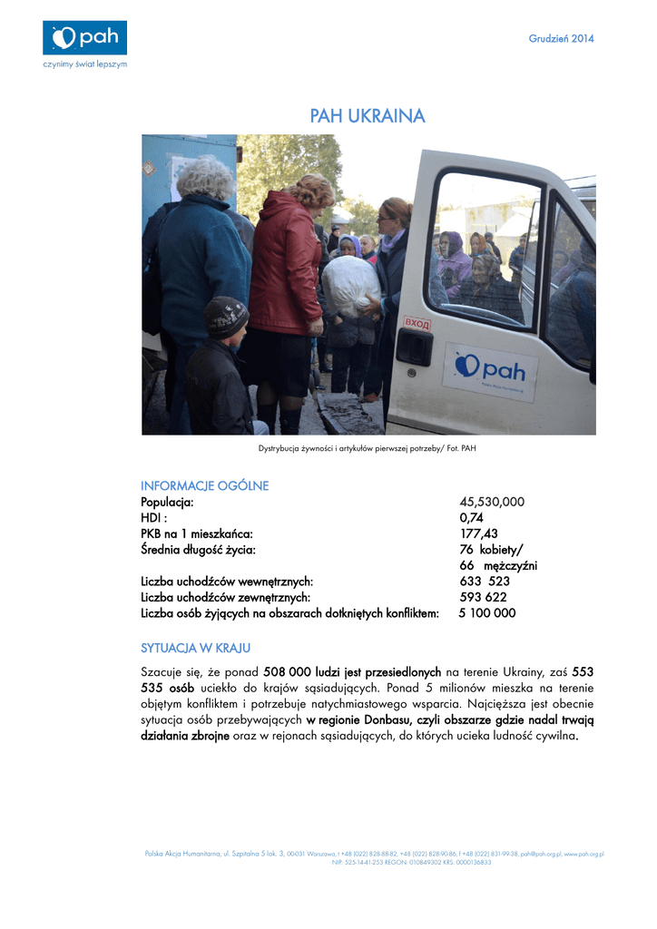 Grudzień 2014 PAH UKRAINA Dystrybucja żywności i artykułów pierwszej potrzeby/ Fot. PAH INFORMACJE OGÓLNE Populacja: HDI : PKB na 1 mieszkańca: Średnia długość życia: Liczba uchodźców wewnętrznych: Liczba uchodźców zewnętrznych: Liczba osób żyjących na obszarach dotkniętych konfliktem: 45,530,000 0,74 177,43 76 kobiety/ 66 mężczyźni 633 523 593 622 5 100 000 SYTUACJA W KRAJU Szacuje się, że ponad 508 000 ludzi jest przesiedlonych na terenie Ukrainy, zaś 553 535 osób uciekło do krajów sąsiadujących. Ponad 5 milionów mieszka na terenie objętym konfliktem i potrzebuje natychmiastowego wsparcia. Najcięższa jest obecnie sytuacja osób przebywających w regionie Donbasu, czyli obszarze gdzie nadal trwają działania zbrojne oraz w rejonach sąsiadujących, do których ucieka ludność cywilna. Polska Akcja Humanitarna, ul. Szpitalna 5 lok. 3, 00-031 Warszawa, t +48 (022) 828-88-82, +48 (022) 828-90-86, f +48 (022) 831-99-38, [email protected], www.pah.org.pl NIP: 525-14-41-253 REGON: 010849302 KRS: 0000136833 Grudzień 2014 POTRZEBY HUMANITARNE Rozpoznanie potrzeb przeprowadzone przez pracowników PAH wykazało, że problemem cywili jest brak dostępu do opieki medycznej oraz żywności, a także brak odpowiednich warunków, aby mogli przetrwać nadchodzącą zimę. Przesiedlona ludność potrzebuje pomocy w zakresie dostępu do żywności, środków czystości i higieny osobistej. W wyniku walk zaopatrzenie sklepów jest ograniczone, nie funkcjonują instytucje i organy administracji. Mieszkańcy dotkniętych regionów nie otrzymują pensji, rent i emerytur, co uniemożliwia im zdobycie nawet podstawowych produktów. Ograniczony jest także dostęp do ochrony zdrowia. Część szpitali i mniejszych placówek ochrony zdrowia nie funkcjonuje, pozostałe mają problemy z zaopatrzeniem i brakiem personelu, a liczba pacjentów rośnie. Część wewnętrznie przesiedlonych osób przebywa w tymczasowych schronieniach na tzw. terenach wyzwolonych obwodów donieckiego i ługańskiego. Większość budynków nie nadaje się do użytku w czasie zimy. Konieczna jest ich adaptacja oraz przygotowanie do zimy. ZREALIZOWANE DZIAŁANIA Podczas trzech pobytów na wschodzie Ukrainy dotarliśmy z pomocą do ponad 15 tysięcy osób przemieszczonych wewnątrz kraju. Pracowaliśmy w obwodach donieckim i ługańskim, w miejscowościach: Zolotoje, Szczurewo, Debalcewo, Gorłowka, Kramatorsk, Slowiansk, Rubieżnoje, Swietagorsk, Berdiansk i Dnieprodzierżynsk. 1. SEKTOR ŻYWNOŚCIOWY Zakupiliśmy i rozdystrybuowaliśmy żywność dla 1700 uchodźców wewnętrznych, którzy schronili się w miejscowości Zołotoje. Są to głównie kobiety i dzieci. Zakupiliśmy i rozdystrybuowaliśmy żywność dla 160 uchodźców wewnętrznych w Berdiansku i Dnieprodzierżyńsku. 2. SEKTOR NIEŻYWNOŚCIOWY Przekazaliśmy sprzęt AGD służący do przygotowywania posiłków ośrodkom w Szczurowe, Bierdiańsku, Kramatorsku oraz w Swiatogorsku. W ośrodkach tych przebywa łącznie 461 uchodźców wewnętrznych. Przekazaliśmy ciepłą odzież, koce i śpiwory dla 1200 uchodźców wewnętrznych w Szczurowie i Zolotoje oraz 50 dzieci w Druzkowce. Sfinansowaliśmy uszycie 100 kompletów bielizny pościelowej dla Szpitala Psychiatrycznego w Słowiansku, gdzie przebywają obecnie 584 pacjentki oraz dla szpitala położniczego, w którym mieści się 4000 pacjentek. Polska Akcja Humanitarna, ul. Szpitalna 5 lok. 3, 00-031 Warszawa, t +48 (022) 828-88-82, +48 (022) 828-90-86, f +48 (022) 831-99-38, [email protected], www.pah.org.pl NIP: 525-14-41-253 REGON: 010849302 KRS: 0000136833 Grudzień 2014 Przekazaliśmy środki czystości i higieny osobistej dla 1990 uchodźców wewnętrznych w Zolotoje, Rubieżnem i Kramatorsku, miesięczny zapas pampersów dla 140 dzieci w domu Dziecka Antoszka w Kramatorsku oraz odżywki dla 40 dzieci – lokalnych podopiecznych opieki społecznej w Zołotoje. Zapewniliśmy materiały do ocieplenia okien łącznie dla 200 osób w Krasnogorłówce (miasto leżące na pograniczu strefy ATO) oraz do świetlicy, mogącej przyjąć do 50 dzieci w Swiatogorsku. Dodatkowo przekazaliśmy drewno na opał dla 60 uchodźców w Kramatorsku. W miejscowości Rubeżnoje (miasto leżące na pograniczu strefy ATO) zapewniliśmy pomoce do zajęć pozalekcyjnych dla łącznie 85 uczniów. Przekazaliśmy również przybory szkolne i sportowe dla 450 uczniów z dwóch lokalnych szkół w Zołotoje. 3. SEKTOR MEDYCZNY Zaopatrzyliśmy w leki, środki opatrunkowe i podstawowe artykuły chirurgiczne szpital w miejscowości Debalcewo, do którego trafiają ranni z obwodu donieckiego i ługańskiego. Obecnie leczy się tam ok. 350 osób. Przekazaliśmy lekarstwa, środki opatrunkowe i sprzęt medyczny (aparat do EKG) Med-punktowi w Szczurewo, który udziela pomocy ok. 500 osobom. Kupiliśmy leki dla 20 mieszkańców miejscowości Gorłowka, gdzie wciąż toczą się walki. Kupiliśmy leki i środki medyczne, które trafiły do 86 mieszkańców Krasnogorłówki oraz do 87 uchodźców i mieszkańców miast Brianka, Pierwomajsk (leżących w strefie ATO). Kupiliśmy aparat do leczenia odmrożeń dla szpitala w Kramatorsku, w którym leczy się około 3000 osób Przekazaliśmy apteczki dla szkół w miejscowości Zołotoje, w których uczy się 450 dzieci. KOLEJNE POTRZEBY W regionach, w których przebywali pracownicy PAH nadal jest potrzebna pomoc. Uchodźcom wewnętrznym trzeba zapewnić dostęp do opieki medycznej i żywności oraz pomóc im przetrwać zimę, poprzez zakup ciepłej odzieży i pościeli. Polska Akcja Humanitarna, ul. Szpitalna 5 lok. 3, 00-031 Warszawa, t +48 (022) 828-88-82, +48 (022) 828-90-86, f +48 (022) 831-99-38, [email protected], www.pah.org.pl NIP: 525-14-41-253 REGON: 010849302 KRS: 0000136833