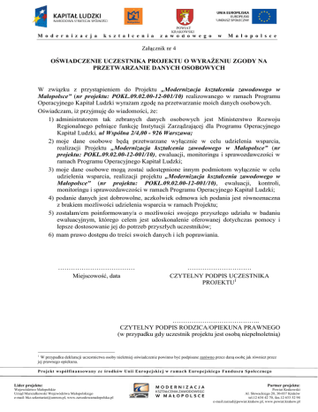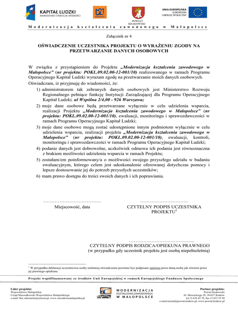 POWIAT KRAKOWSKI M o d e r n i z a c j a k s z t a ł c e n i a z a w o d o w e g o w M a ł o p o l s c e Załącznik nr 4 OŚWIADCZENIE UCZESTNIKA PROJEKTU O WYRAŻENIU ZGODY NA PRZETWARZANIE DANYCH OSOBOWYCH W związku z przystąpieniem do Projektu „Modernizacja kształcenia zawodowego w Małopolsce” (nr projektu: POKL.09.02.00-12-001/10) realizowanego w ramach Programu Operacyjnego Kapitał Ludzki wyrażam zgodę na przetwarzanie moich danych osobowych. Oświadczam, iż przyjmuję do wiadomości, że: 1) administratorem tak zebranych danych osobowych jest Ministerstwo Rozwoju Regionalnego pełniące funkcję Instytucji Zarządzającej dla Programu Operacyjnego Kapitał Ludzki, ul Wspólna 2/4,00 - 926 Warszawa; 2) moje dane osobowe będą przetwarzane wyłącznie w celu udzielenia wsparcia, realizacji Projektu „Modernizacja kształcenia zawodowego w Małopolsce” (nr projektu: POKL.09.02.00-12-001/10), ewaluacji, monitoringu i sprawozdawczości w ramach Programu Operacyjnego Kapitał Ludzki; 3) moje dane osobowe mogą zostać udostępnione innym podmiotom wyłącznie w celu udzielenia wsparcia, realizacji projektu „Modernizacja kształcenia zawodowego w Małopolsce” (nr projektu: POKL.09.02.00-12-001/10), ewaluacji, kontroli, monitoringu i sprawozdawczości w ramach Programu Operacyjnego Kapitał Ludzki; 4) podanie danych jest dobrowolne, aczkolwiek odmowa ich podania jest równoznaczna z brakiem możliwości udzielenia wsparcia w ramach Projektu; 5) zostałam/em poinformowany/a o możliwości swojego przyszłego udziału w badaniu ewaluacyjnym, którego celem jest udoskonalenie oferowanej dotychczas pomocy i lepsze dostosowanie jej do potrzeb przyszłych uczestników; 6) mam prawo dostępu do treści swoich danych i ich poprawiania. ……………………………… Miejscowość, data ………………………… CZYTELNY PODPIS UCZESTNIKA PROJEKTU1 ………………………………….. CZYTELNY PODPIS RODZICA/OPIEKUNA PRAWNEGO (w przypadku gdy uczestnik projektu jest osobą niepełnoletnią) 1 W przypadku deklaracji uczestnictwa osoby nieletniej oświadczenie powinno być podpisane zarówno przez daną osobę jak również przez jej prawnego opiekuna. P ro je kt ws półf i na nsowa ny z e śro d kó w Un ii E uro pe j s ki e j w ra ma c h E uro pe j s ki ego Fu nd u sz u S połe cz nego Lider projektu: Województwo Małopolskie Urząd Marszałkowski Województwa Małopolskiego e-mail: [email protected], www.zawodowamalopolska.pl Partner projektu: Powiat Krakowski Al. Słowackiego 20, 30-037 Kraków tel.12 634 42 70, fax.12 633 52 94 e-mail:[email protected], www.powiat.krakow.pl