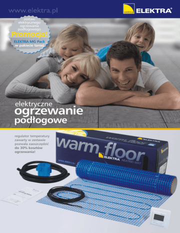 zestaw elektrycznego ogrzewania podłogowego Promocja! ELEKTRA MG Pack w pakiecie taniej elektryczne ogrzewanie podłogowe regulator temperatury zawarty w zestawie pozwala zaoszczędzić do 30% kosztów ogrzewania! Dane techniczne: Regulator Temperatury ELEKTRA Ekocontrol 100 lub 160 W/m2 230 V ~ 50/60 Hz ~ 3 mm –5oC +105oC 2 x 4 m; 2 x 1,0 mm2 Maty grzejne ELEKTRA z regulatorem programowalnym w zestawie umożliwiają szybką instalację ogrzewania podłogowego. Mogą służyć jako podstawowy system grzewczy lub być uzupełnieniem już istniejącego. Maty grzejne ELEKTRA mogą być wykorzystywane pod każdym typem podłogi przystosowanym do ogrzewania podłogowego, tzn. pod podłogą dobrze oddającą ciepło, np. terakota, posadzka kamienna, jak równiez wykładzina dywanowa. Polecamy ją również jako skuteczny system dogrzewający. W przypadku dobrej izolacji termicznej pod podłogą z powodzeniem może być również wykorzystana jako system podstawowy. Jest to najszybszy, najprostszy, najefektywniejszy sposób dogrzania pomieszczeń lub tylko wybranych miejsc - przy minimalnym nakładzie pracy. Ceny pakietów promocyjnych ELEKTRA MG Pack*: typ wymiary [m x m] cena netto [zł] Moc jednostkowa - 100W/m2 100-240V, 50/60 Hz 250V/16A 5-35°C 5-45°C 86 x 86 x 16 mm biały LCD 2-polowy Regulator temperatury ELEKTRA Ekocontrol łączy w sobie zalety regulatorów elektronicznych z „inteligencją” cyfrowego układu sterującego. Możliwość programowania temperatury w cyklu dzień/tydzień. Możliwość odczytywania na ciekłokrystalicznym wyświetlaczu danych takich jak: temperatura rzeczywista pomieszczenia, uprzednio zaprogramowana temperatura komfortowa i ekonomiczna. Urządzenie współpracuje z dwoma czujnikami temperatury (wbudowanym powietrznym i zewnętrznym podłogowym) umożliwiając pracę w trybie pomiaru temperatury powietrza, temperatury podłogi lub pracę z limitującym czujnikiem podłogowym. Dzięki możliwości programowania system ogrzewania podłogowego ELEKTRA zapewnia maksimum komfortu przy minimalnych kosztach zużycia energii elektrycznej, jest przy tym całkowicie bezobsługowy. typ wymiary [m x m] cena netto [zł] Moc jednostkowa - 160W/m2 MG Pack 100/1,0 0,5 x 2,0 468,00 MG Pack 160/1,0 0,5 x 2,0 494,00 MG Pack 100/1,5 0,5 x 3,0 498,00 MG Pack 160/1,5 0,5 x 3,0 546,00 MG Pack 100/2,0 0,5 x 4,0 568,00 MG Pack 160/2,0 0,5 x 4,0 614,00 MG Pack 100/2,5 0,5 x 5,0 608,00 MG Pack 160/2,5 0,5 x 5,0 662,00 MG Pack 100/3,0 0,5 x 6,0 648,00 MG Pack 160/3,0 0,5 x 6,0 730,00 MG Pack 100/3,5 0,5 x 7,0 668,00 MG Pack 160/3,5 0,5 x 7,0 772,00 MG Pack 100/4,5 0,5 x 9,0 768,00 MG Pack 160/4,0 0,5 x 8,0 830,00 MG Pack 100/5,0 0,5 x 10,0 808,00 MG Pack 160/5,0 0,5 x 10,0 929,00 MG Pack 100/6,0 0,5 x 12,0 848,00 MG Pack 160/6,0 0,5 x 12,0 1 003,00 MG Pack 100/8,0 0,5 x 16,0 928,00 MG Pack 160/7,0 0,5 x 14,0 1 013,00 MG Pack 100/9,0 0,5 x 18,0 968,00 MG Pack 160/8,0 0,5 x 16,0 1 108,00 MG Pack 100/10,0 0,5 x 20,0 1 008,00 MG Pack 160/9,0 0,5 x 18,0 1 176,00 MG Pack 100/12,0 0,5 x 24,0 1 083,00 MG Pack 160/10,0 0,5 x 20,0 1 255,00 * Promocja ważna do wyczerpania zapasów. ELEKTRA ul. K. Kamińskiego 4, 05-850 Ożarów Mazowiecki telefon 22 843 32 82, fax 22 843 47 52 e-mail: [email protected] www.elektra.pl 03/14 4000 A5 (1) a > Napięcie zasilania: Obciążalność styków: Zakres kontroli - temperatury powietrza: - temperatury podłogi: Wymiary: Kolor: Wyświetlacz: Wyłącznik: ESG (PL) 152 Moc jednostkowa: Napięcie zasilania: Grubość maty: Min. temperatura instalowania: Max. temperatura pracy: Przewody przyłączeniowe: Grupa V5 > Mata Grzejna ELEKTRA MG