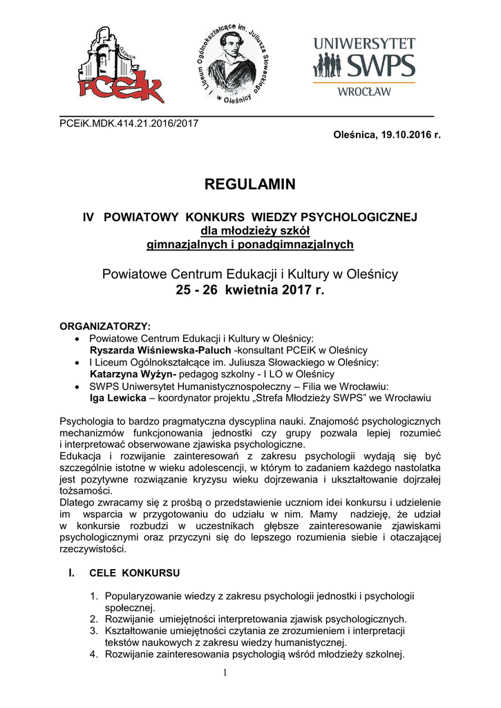 __________________________________________________ PCEiK.MDK.414.21.2016/2017 Oleśnica, 19.10.2016 r. REGULAMIN IV POWIATOWY KONKURS WIEDZY PSYCHOLOGICZNEJ dla młodzieży szkół gimnazjalnych i ponadgimnazjalnych Powiatowe Centrum Edukacji i Kultury w Oleśnicy 25 - 26 kwietnia 2017 r. ORGANIZATORZY: Powiatowe Centrum Edukacji i Kultury w Oleśnicy: Ryszarda Wiśniewska-Paluch -konsultant PCEiK w Oleśnicy I Liceum Ogólnokształcące im. Juliusza Słowackiego w Oleśnicy: Katarzyna Wyżyn- pedagog szkolny - I LO w Oleśnicy SWPS Uniwersytet Humanistycznospołeczny – Filia we Wrocławiu: Iga Lewicka – koordynator projektu „Strefa Młodzieży SWPS” we Wrocławiu Psychologia to bardzo pragmatyczna dyscyplina nauki. Znajomość psychologicznych mechanizmów funkcjonowania jednostki czy grupy pozwala lepiej rozumieć i interpretować obserwowane zjawiska psychologiczne. Edukacja i rozwijanie zainteresowań z zakresu psychologii wydają się być szczególnie istotne w wieku adolescencji, w którym to zadaniem każdego nastolatka jest pozytywne rozwiązanie kryzysu wieku dojrzewania i ukształtowanie dojrzałej tożsamości. Dlatego zwracamy się z prośbą o przedstawienie uczniom idei konkursu i udzielenie im wsparcia w przygotowaniu do udziału w nim. Mamy nadzieję, że udział w konkursie rozbudzi w uczestnikach głębsze zainteresowanie zjawiskami psychologicznymi oraz przyczyni się do lepszego rozumienia siebie i otaczającej rzeczywistości. I. CELE KONKURSU 1. Popularyzowanie wiedzy z zakresu psychologii jednostki i psychologii społecznej. 2. Rozwijanie umiejętności interpretowania zjawisk psychologicznych. 3. Kształtowanie umiejętności czytania ze zrozumieniem i interpretacji tekstów naukowych z zakresu wiedzy humanistycznej. 4. Rozwijanie zainteresowania psychologią wśród młodzieży szkolnej. 1 5. Poznawanie roli psychologii w życiu współczesnego człowieka. 6. Rozwijanie dociekliwości poznawczej. II. ZAKRES TEMATYCZNY KONKURSU 1. 2. 3. 4. 5. III. Konformizm. Wpływ na zachowanie Spostrzeganie społeczne Uprzedzenia. Stereotypy. Emocje. Samodoskonalenie. Psychologia reklamy. LITERATURA DO PRZYGOTOWANIA 1. Aronson, E., Wilson, T.D., Akert, R.M. „Psychologia społeczna” – rozdziały: 4, 8, 13 Poznań, Zysk i S-ka Wydawnictwo, 2006. 2. Berger, M., „Potęga marki”. Charaktery.7/2015, s. 70-75. 3. Brzezińska, M., „Tyrania niecierpliwości” .Charaktery.2/2012, s.18-27. 4. Pająk, P., „Podróż w nieznane”. Charaktery.10/2013, s.18-27. 5. Zimbardo, P., Johnson, R., Mccann, V,. „Szalone etykiety”. Charaktery 2/2011, s. 38-41. IV. PRZEBIEG KONKURSU 1. Szkolny Organizator Konkursu (zainteresowany zorganizowaniem konkursu w swojej szkole nauczyciel, pedagog szkolny, psycholog) zgłasza ilość i skład zespołów dwuosobowych (każda szkoła może zgłosić do 2 zespołów) 2. Termin nadsyłania zgłoszeń do konkursu upływa dn. 24.03.2017 r. 3. Zgłoszenia przyjmowane są wyłącznie na załączonej karcie zgłoszeniowej, którą należy przesłać na adres [email protected] V. TERMIN, MIEJSCE I ZADANIA KONKURSU 1. Finał konkursu odbędzie się: a) Gimnazja – 25 kwietnia 2017 r., o godzinie 10.00, PCEiK Oleśnica b) Szkoły Ponadgimnazjalne – 26 kwietnia 2017 r., o godzinie 10.00, PCEiK Oleśnica 2. Zadaniem uczestników będzie: a) wypełnienie w parach testu jednokrotnego wyboru z zakresu tematycznego podanego w regulaminie konkursu, przygotowanej prezentacji multimedialnej związanej z tematyką konkursu, w oparciu o podaną literaturę (czas przedstawienia prezentacji dla jednej dwuosobowej drużyny wynosi do 5 minut). b) przedstawienie VI. KOMISJA KONKURSOWA 1. Wykonanie zadań zostanie ocenione przez Komisję Konkursową powołaną przez Dyrektora PCEiK. 2. Komisja Konkursowa wyłoni trzy najlepsze drużyny w dwóch kategoriach: 2 a) szkoły gimnazjalne b) szkoły ponadgimnazjalne VII. NAGRODY Nagrody za miejsca wg obowiązującej Procedury zostaną wręczone 8 czerwca 2017 r. o godz. 10. w Sali Widowiskowej BiFK podczas Gali PCEiK 2017 r. VIII. POSTANOWIENIA KOŃCOWE 1. Udział w konkursie każdego uczestnika jest dobrowolny i oznacza przyjęcie w pełni niniejszego regulaminu. 2. Osoby łamiące zasady określone w niniejszym regulaminie zostaną wykluczone z udziału w wyżej wspomnianym konkursie. 3. Odpłatność w wysokości 8 zł od ucznia obowiązuje w przypadku szkół z miast i gmin powiatu oleśnickiego, które nie zawarły porozumienia z PCEiK w sprawie doradztwa metodycznego i doskonalenia zawodowego nauczycieli. 4. W załączniku Nr 1- Karta zgłoszeniowa. 5. Uczestnicy konkursu wyrażają zgodę na wykorzystanie danych osobowych zgodnie z ustawą z dnia 29 sierpnia 1997 r. o ochronie danych osobowych (Dz. U. z 2002 r. nr 101, poz. 926 z późn. zm.) UWAGA Organizatorzy zastrzegają sobie prawo do rezygnacji z przeprowadzenia konkursu w przypadku, gdy liczba chętnych do udziału w nim będzie za mała. Informacja zostanie przekazana zainteresowanym osobom w terminie do 3 kwietnia 2017 roku. Informacji zainteresowanym osobom udzielają: Katarzyna Wyżyn, tel. 695 938 639 Ryszarda Wiśniewska-Paluch, tel. 604 486 919 3 4