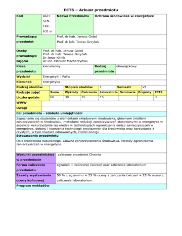 ECTS – Arkusz przedmiotu Kod AGH- Nazwa Przedmiotu Ochrona środowiska w energetyce SEN1KC631-s Prowadzący Prof. dr hab. Janusz Gołaś przedmiot Prof. dr hab. Teresa Grzybek Osoby zajęcia Prof. dr hab. Janusz Gołaś Prof. dr hab. Teresa Grzybek Dr Jerzy Klinik Dr inż. Mariusz Macherzyński Klasa kierunkowy prowadzące Rodzaj przedmiotu obowiązkowy przedmiotu Wydział Energetyki i Paliw Kierunek energetyka Rodzaj studiów Stopień studiów I Semestr Rodzaje zajęć Suma Wykłady Ćwiczenia Laboratoria Seminaria Liczba godzin 60 30 15 15 VI Projekty ECTS 3 WWW Uwagi Cel przedmiotu - zdobyte umiejętności Zapoznanie się studentów z elementami składowymi środowiska, głównymi źródłami zanieczyszczeń w środowisku, metodami redukcji zanieczyszczeń stosowanymi w energetyce w aspekcie wykorzystania tej wiedzy w technologiach ograniczania emisji zanieczyszczeń w energetyce, doboru i tworzenia technologii przyjaznych dla środowiska oraz korzystania z czystych, w tym również odnawialnych, źródeł energii Streszczenie przedmiotu Opis środowiska naturalnego. Główne zanieczyszczenia środowiska. Metody ograniczenia zanieczyszczeń w energetyce. Warunki uczestnictwa zaliczony przedmiot Chemia w przedmiocie Forma zaliczenia egzamin + zaliczenie ćwiczeń oraz zaliczenie laboratorium przedmiotu Zasady wystawiania 50 % z egzaminu + 25 % oceny z zaliczenia ćwiczeń + 25 % oceny z oceny końcowej zaliczenia laboratorium Program wykładów 15 godz. wykładu, prof. Janusz Gołaś Opis środowiska naturalnego, jego zasięgu i głównych elementów składowych: atmosfery, litosfery, hydrosfery. Biosfera, jej skład, zasięg i rola w środowisku. Skład zewnętrznych warstw planety Ziemii. Cykle geochemiczne węgla, azotu, tlenu w środowisku. Zachowanie i migracja materii w środowisku. Charakterystyka grup zanieczyszczeń i ich głównych źrodeł emisji. Zanieczyszczenia organiczne (chlorofluorowęglowodory CFC, polichlorowane bifenyle PCB, wielopierścieniowe węglowodory aromatyczne WWA, Dioksyny, Benzen-Toluen-Ksylen BTX, trwałe związki organiczne POC, lotne związki organiczne VOC) i nieorganiczne ( m.in. metale ciężkie jak rtęć, ołów, kadm, arsen i ich związki). Efekty obecności zanieczyszczeń w środowisku. Wody naturalne, ujmowanie, uzdatnianie, technologie oczyszczania wody. Zanieczyszczenia wód naturalnych. Ścieki komunalne i przemysłowe. Skład chemiczny gleb i osadów. Profil glebowy. Chemia niższych warstw atmosfery, zanieczyszczenia powietrza (CO, CO 2, SO2, NOx, H2O, CH4) i źrółdła ich emisji. Cząsteczki stałe w powietrzu, pyły. Zjawiska kwaśnych deszczy, efektu cieplarnianego, smogów, tworzenia i okresowego zaniku warstwy ozonowej. Rola bioprocesów oddychania i fotosyntezy. Odsiarczanie paliw i spalin, katalityczne konwertery i dopalacze spalin. Hałas, uciążliwość hałasu, metody ograniczenia i ochrony przed hałasem. Procesy wytwarzania energii i ich konsekwencje środowiskowe. Klasyfikacja surowców energetycznych. Biomasa i jej rola w energetyce. Energetyka jądrowa i jej oddziaływanie na środowisko. Zanieczyszczenia promieniotwórcze. 15 godz. wykładu, prof. Teresa Grzybek Metody ograniczenia zanieczyszczeń pyłowych i gazowych. Odpylanie spalin (cyklony, filtry, elektrofiltry). Odsiarczanie paliw. Odsiarczanie w procesie spalania. Odsiarczanie gazów odlotowych. Ograniczenie emisji tlenków azotu przez poprawę procesów spalania. Metody redukcji tlenków azotu w gazach odlotowych (redukcja termiczna; metody katalityczne SCR, NCR). Metody równoczesnego usuwania S02 i NOx' Oczyszczanie wody do celów przemysłowych (woda w obiegach chłodzących, woda do celów kotłowych; wymagania jakościowe; oczyszczanie - dekarbonizacja, demineralizacja, jonity, metody membranowe). Gospodarka ściekami i osadami. Charakterystyka i właściwości odpadów. Ścieki powstające podczas oczyszczania wody. Odpady z instalacji odsiarczania spalin. Popioły lotne i żużle. Składowanie odpadów energetycznych. Wykorzystanie popiołów lotnych, żużli oraz odpadów z odsiarczania spalin. Program ćwiczeń laboratoryjnych i ćwiczeń Laboratorium: 1) PODSTAWOWE PARAMETRY WÓD I NORMY DOTYCZĄCE WÓD I ŚCIEKÓW: analiza zawartości NO3-, NO2-, PO43-,NH4+, Fe, CO2, NH3. Twardość całkowita i węglanowa, pH. Odniesienie uzyskanych wyników do aktualnych norm środowiskowych. 2) OZNACZENIE ZAWARTOŚCI POPIOŁU W WYBRANYCH KLASACH ZIARNOWYCH WĘGLA: analiza ziarnowa, metodyka oznaczania popiołu, albo 3) METALE CIĘŻKIE W ŚRODOWISKU: analiza rtęci całkowitej w odpadach, pyłach i popiołach. 4) WYCIECZKA TECHNOLOGICZNA: elektrownia Jaworzno III 5) WYCIECZKA TECHNOLOGICZNA: oczyszczalnia ścieków MPWiK w Krakowie „Kujawy” lub „Płaszów” Ćwiczenia: Regulacje prawne dotyczące ochrony środowiska w energetyce, pozwolenia zintegrowane (IPCC). Obliczenia opłat za korzystanie ze środowiska przy uwzględnieniu zmiany surowca i/lub parametrów procesowych. Wymagania normatywne dotyczące dopuszczalnych emisji i imisji zanieczyszczeń. Odpylanie –obliczenia stopnia odpylania i parametrów urządzeń technologicznych. Obliczenia stężeń zanieczyszczeń ze spalania paliw stałych w strumieniach gazów. Odsiarczanie spalin – obliczenia stopnia odsiarczania i zużycia sorbentu. Gospodarka wodno-ściekowa – obliczenia zgodności stopnia czystości ścieków z parametrami normatywnymi. Przygotowanie wody technologicznej – obliczenie dawki reagenta w procesie dekarbonizacji oraz parametrów urządzeń technologicznych. Strefy ochronne – projektowanie. Bibliografia 1. J.Kucowski, D.Klaudyn, M.Przekwas, Energetyka a ochrona środowiska, Wyd. Naukowo-Techniczne, WWa, wyd. IV, 1997 2. Gajdzik B., Wyciślik A., Wybrane aspekty ochrony środowiska i zarządzania środowiskowego, Wydawnictwo Politechniki Śląskiej, 2007 3. Bartkiewicz B., Oczyszczanie ścieków przemysłowych, Wydawnictwo Naukowe PWN, Warszawa, 2006 4. Rosik-Dulewska C., Po