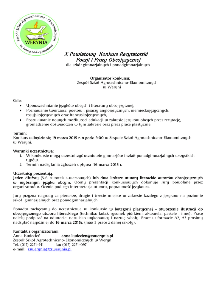 X Powiatowy Konkurs Recytatorski Poezji i Prozy Obcojęzycznej dla szkół gimnazjalnych i ponadgimnazjalnych Organizator konkursu: Zespół Szkół Agrotechniczno-Ekonomicznych w Weryni Cele: Upowszechnianie języków obcych i literatury obcojęzycznej, Poznawanie twórczości poetów i pisarzy anglojęzycznych, niemieckojęzycznych, rosyjskojęzycznych oraz francuskojęzycznych, Poszukiwanie nowych możliwości edukacji w zakresie języków obcych przez recytację, gromadzenie doświadczeń w tym zakresie oraz przez prace plastyczne. Termin: Konkurs odbędzie się 19 marca 2015 r. o godz. 9:00 w Zespole Szkół Agrotechniczno-Ekonomicznych w Weryni. Warunki uczestnictwa: 1. W konkursie mogą uczestniczyć uczniowie gimnazjów i szkół ponadgimnazjalnych wszystkich typów. 2. Termin nadsyłania zgłoszeń upływa 16 marca 2015 r. Uczestnicy prezentują: Jeden dłuższy (5-6 zwrotek 4-wersowych) lub dwa krótsze utwory literackie autorów obcojęzycznych w wybranym języku obcym. Oceny prezentacji konkursowych dokonuje Jury powołane przez organizatorów. Ocenie podlega interpretacja utworu, poprawność językowa. Jury przyzna nagrody za pierwsze, drugie i trzecie miejsce w zakresie każdego z języków na poziomie szkół gimnazjalnych oraz ponadgimnazjalnych. Ponadto zachęcamy do uczestnictwa w konkursie w kategorii plastycznej – stworzenie ilustracji do obcojęzycznego utworu literackiego (technika: kolaż, rysunek piórkiem, akwarela, pastele i inne). Pracę należy podpisać na odwrocie: nazwisko wykonawcy i nazwę szkoły. Prace w formacie A2, A3 prosimy nadsyłać najpóźniej do 16 marca 2015r. (max 3 prace z danej szkoły). Kontakt z organizatorami: Anna Kwiecień [email protected] Zespół Szkół Agrotechniczno-Ekonomicznych w Weryni Tel. (017) 2271-441 fax (017) 2271-097 e-mail: [email protected] Zespół Szkół Agrotechniczno-Ekonomicznych im. Komisji Edukacji Narodowej w Weryni Werynia 501 36-100 Kolbuszowa tel. (017) 22 71 441 Karta uczestnictwa X Powiatowy Konkurs Recytatorski Poezji i Prozy Obcojęzycznej dla szkół gimnazjalnych i ponadgimnazjalnych Szkoła: ………………………………………………………………………………………………… Język angielski Uczniowie: 1. ………………………………………………………… 2. ………………………………………………………… 3. ………………………………………………………… Opiekun (-kto przygotował uczniów): …………………. Język francuski Uczniowie: 1. ………………………………………………………… 2. ………………………………………………………… 3. ………………………………………………………… Opiekun: …………………………………………………….. Język niemiecki Uczniowie: 1. ………………………………………………………… 2. ………………………………………………………… 3. ………………………………………………………… Opiekun: …………………………………………………….. Język rosyjski Uczniowie: 1. ………………………………………………………… 2. ………………………………………………………… 3. ………………………………………………………… Opiekun: …………………………………………………….. Kategoria plastyczna: Uczniowie: 1. ………………………………………………………… 2. ………………………………………………………… 3. ………………………………………………………… Opiekun (kto przygotował uczniów):…………………… Dane osobowe będą przetwarzane wyłącznie na potrzeby w/w konkursu.