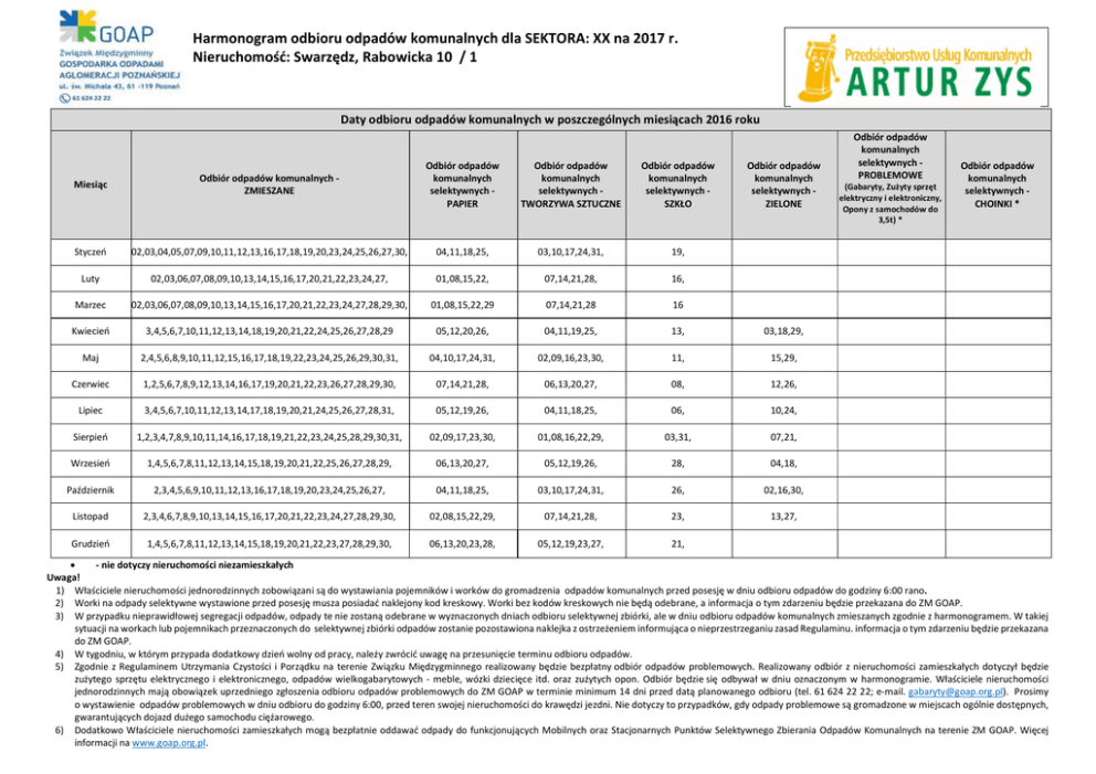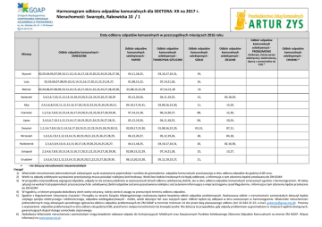 Harmonogram odbioru odpadów komunalnych dla SEKTORA: XX na 2017 r. Nieruchomość: Swarzędz, Rabowicka 10 / 1 Daty odbioru odpadów komunalnych w poszczególnych miesiącach 2016 roku Miesiąc Odbiór odpadów komunalnych ZMIESZANE Odbiór odpadów komunalnych selektywnych PAPIER Odbiór odpadów komunalnych selektywnych TWORZYWA SZTUCZNE Odbiór odpadów komunalnych selektywnych SZKŁO Odbiór odpadów komunalnych selektywnych ZIELONE Styczeń 02,03,04,05,07,09,10,11,12,13,16,17,18,19,20,23,24,25,26,27,30, 04,11,18,25, 03,10,17,24,31, 19, Luty 02,03,06,07,08,09,10,13,14,15,16,17,20,21,22,23,24,27, 01,08,15,22, 07,14,21,28, 16, Marzec 02,03,06,07,08,09,10,13,14,15,16,17,20,21,22,23,24,27,28,29,30, 01,08,15,22,29 07,14,21,28 16 Kwiecień 3,4,5,6,7,10,11,12,13,14,18,19,20,21,22,24,25,26,27,28,29 05,12,20,26, 04,11,19,25, 13, 03,18,29, Maj 2,4,5,6,8,9,10,11,12,15,16,17,18,19,22,23,24,25,26,29,30,31, 04,10,17,24,31, 02,09,16,23,30, 11, 15,29, Czerwiec 1,2,5,6,7,8,9,12,13,14,16,17,19,20,21,22,23,26,27,28,29,30, 07,14,21,28, 06,13,20,27, 08, 12,26, Lipiec 3,4,5,6,7,10,11,12,13,14,17,18,19,20,21,24,25,26,27,28,31, 05,12,19,26, 04,11,18,25, 06, 10,24, Sierpień 1,2,3,4,7,8,9,10,11,14,16,17,18,19,21,22,23,24,25,28,29,30,31, 02,09,17,23,30, 01,08,16,22,29, 03,31, 07,21, Wrzesień 1,4,5,6,7,8,11,12,13,14,15,18,19,20,21,22,25,26,27,28,29, 06,13,20,27, 05,12,19,26, 28, 04,18, Październik 2,3,4,5,6,9,10,11,12,13,16,17,18,19,20,23,24,25,26,27, 04,11,18,25, 03,10,17,24,31, 26, 02,16,30, Listopad 2,3,4,6,7,8,9,10,13,14,15,16,17,20,21,22,23,24,27,28,29,30, 02,08,15,22,29, 07,14,21,28, 23, 13,27, Grudzień 1,4,5,6,7,8,11,12,13,14,15,18,19,20,21,22,23,27,28,29,30, 06,13,20,23,28, 05,12,19,23,27, 21, Odbiór odpadów komunalnych selektywnych PROBLEMOWE (Gabaryty, Zużyty sprzęt elektryczny i elektroniczny, Opony z samochodów do 3,5t) * Odbiór odpadów komunalnych selektywnych CHOINKI * - nie dotyczy nieruchomości niezamieszkałych Uwaga! 1) Właściciele nieruchomości jednorodzinnych zobowiązani są do wystawiania pojemników i worków do gromadzenia odpadów komunalnych przed posesję w dniu odbioru odpadów do godziny 6:00 rano. 2) Worki na odpady selektywne wystawione przed posesję musza posiadać naklejony kod kreskowy. Worki bez kodów kreskowych nie będą odebrane, a informacja o tym zdarzeniu będzie przekazana do ZM GOAP. 3) W przypadku nieprawidłowej segregacji odpadów, odpady te nie zostaną odebrane w wyznaczonych dniach odbioru selektywnej zbiórki, ale w dniu odbioru odpadów komunalnych zmieszanych zgodnie z harmonogramem. W takiej sytuacji na workach lub pojemnikach przeznaczonych do selektywnej zbiórki odpadów zostanie pozostawiona naklejka z ostrzeżeniem informująca o nieprzestrzeganiu zasad Regulaminu. informacja o tym zdarzeniu będzie przekazana do ZM GOAP. 4) W tygodniu, w którym przypada dodatkowy dzień wolny od pracy, należy zwrócić uwagę na przesunięcie terminu odbioru odpadów. 5) Zgodnie z Regulaminem Utrzymania Czystości i Porządku na terenie Związku Międzygminnego realizowany będzie bezpłatny odbiór odpadów problemowych. Realizowany odbiór z nieruchomości zamieszkałych dotyczył będzie zużytego sprzętu elektrycznego i elektronicznego, odpadów wielkogabarytowych - meble, wózki dziecięce itd. oraz zużytych opon. Odbiór będzie się odbywał w dniu oznaczonym w harmonogramie. Właściciele nieruchomości jednorodzinnych mają obowiązek uprzedniego zgłoszenia odbioru odpadów problemowych do ZM GOAP w terminie minimum 14 dni przed datą planowanego odbioru (tel. 61 624 22 22; e-mail. [email protected]). Prosimy o wystawienie odpadów problemowych w dniu odbioru do godziny 6:00, przed teren swojej nieruchomości do krawędzi jezdni. Nie dotyczy to przypadków, gdy odpady problemowe są gromadzone w miejscach ogólnie dostępnych, gwarantujących dojazd dużego samochodu ciężarowego. 6) Dodatkowo Właściciele nieruchomości zamieszkałych mogą bezpłatnie oddawać odpady do funkcjonujących Mobilnych oraz Stacjonarnych Punktów Selektywnego Zbierania Odpadów Komunalnych na terenie ZM GOAP. Więcej informacji na www.goap.org.pl.