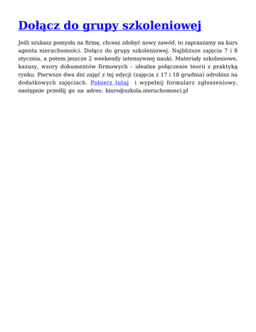 Dołącz do grupy szkoleniowej Jeśli szukasz pomysłu na firmę, chcesz zdobyć nowy zawód, to zapraszamy na kurs agenta nieruchomości. Dołącz do grupy szkoleniowej. Najbliższe zajęcia 7 i 8 stycznia, a potem jeszcze 2 weekendy intensywnej nauki. Materiały szkoleniowe, kazusy, wzory dokumentów firmowych – idealne połączenie teorii z praktyką rynku. Pierwsze dwa dni zajęć z tej edycji (zajęcia z 17 i 18 grudnia) odrobisz na dodatkowych zajęciach. Pobierz tutaj i wypełnij formularz zgłoszeniowy, następnie prześlij go na adres: [email protected]