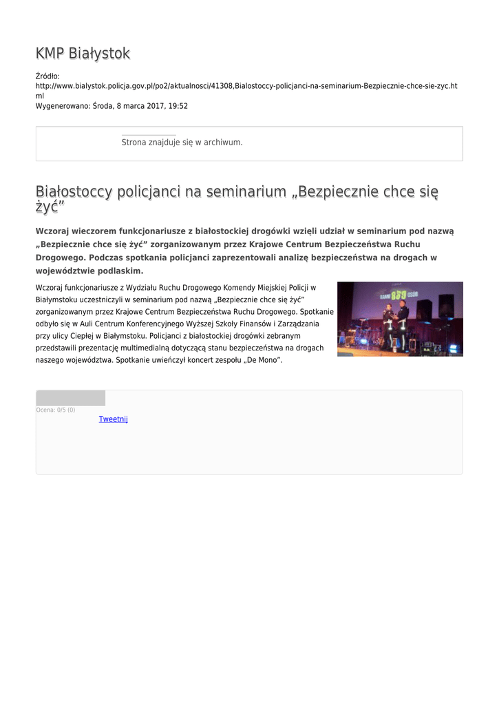 KMP Białystok Źródło: http://www.bialystok.policja.gov.pl/po2/aktualnosci/41308,Bialostoccy-policjanci-na-seminarium-Bezpiecznie-chce-sie-zyc.ht ml Wygenerowano: Środa, 8 marca 2017, 19:52 Strona znajduje się w archiwum. Białostoccy policjanci na seminarium „Bezpiecznie chce się żyć” Wczoraj wieczorem funkcjonariusze z białostockiej drogówki wzięli udział w seminarium pod nazwą „Bezpiecznie chce się żyć” zorganizowanym przez Krajowe Centrum Bezpieczeństwa Ruchu Drogowego. Podczas spotkania policjanci zaprezentowali analizę bezpieczeństwa na drogach w województwie podlaskim. Wczoraj funkcjonariusze z Wydziału Ruchu Drogowego Komendy Miejskiej Policji w Białymstoku uczestniczyli w seminarium pod nazwą „Bezpiecznie chce się żyć” zorganizowanym przez Krajowe Centrum Bezpieczeństwa Ruchu Drogowego. Spotkanie odbyło się w Auli Centrum Konferencyjnego Wyższej Szkoły Finansów i Zarządzania przy ulicy Ciepłej w Białymstoku. Policjanci z białostockiej drogówki zebranym przedstawili prezentację multimedialną dotyczącą stanu bezpieczeństwa na drogach naszego województwa. Spotkanie uwieńczył koncert zespołu „De Mono”. Ocena: 0/5 (0) Tweetnij