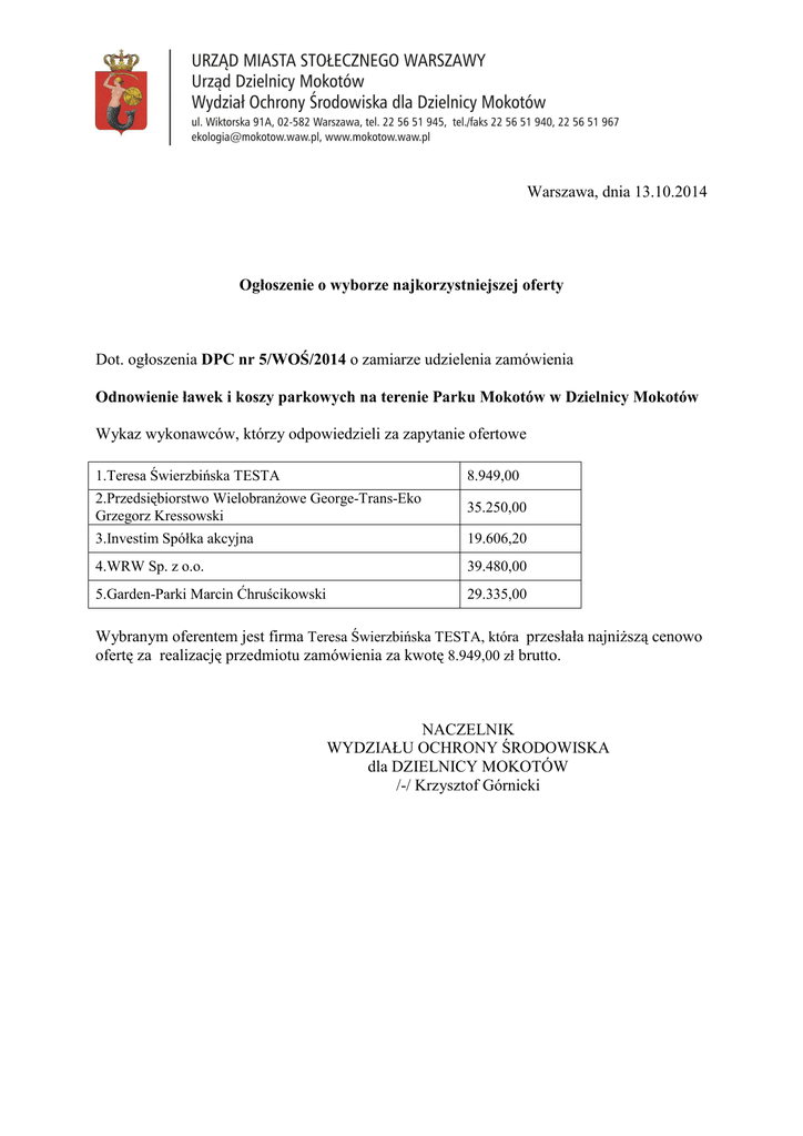 Warszawa, dnia 13.10.2014 Ogłoszenie o wyborze najkorzystniejszej oferty Dot. ogłoszenia DPC nr 5/WOŚ/2014 o zamiarze udzielenia zamówienia Odnowienie ławek i koszy parkowych na terenie Parku Mokotów w Dzielnicy Mokotów Wykaz wykonawców, którzy odpowiedzieli za zapytanie ofertowe 1.Teresa Świerzbińska TESTA 8.949,00 2.Przedsiębiorstwo Wielobranżowe George-Trans-Eko Grzegorz Kressowski 35.250,00 3.Investim Spółka akcyjna 19.606,20 4.WRW Sp. z o.o. 39.480,00 5.Garden-Parki Marcin Ćhruścikowski 29.335,00 Wybranym oferentem jest firma Teresa Świerzbińska TESTA, która przesłała najniższą cenowo ofertę za realizację przedmiotu zamówienia za kwotę 8.949,00 zł brutto. NACZELNIK WYDZIAŁU OCHRONY ŚRODOWISKA dla DZIELNICY MOKOTÓW /-/ Krzysztof Górnicki