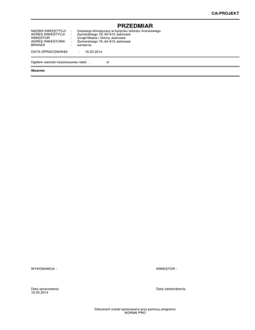 CA-PROJEKT NAZWA INWESTYCJI ADRES INWESTYCJI INWESTOR ADRES INWESTORA BRANŻA DATA OPRACOWANIA : : : : : PRZEDMIAR Instalacja klimatyzacji w bydynku referatu finansowego Żymierskiego 79; 64-915 Jastrowie Urząd Miasta i Gminy Jastrowie Żymierskiego 79; 64-915 Jastrowie sanitarna : 16.05.2014 Ogółem wartość kosztorysowa robót : zł Słownie: WYKONAWCA : INWESTOR : Data opracowania 16.05.2014 Data zatwierdzenia Dokument został opracowany przy pomocy programu NORMA PRO referat finansowy KSIĄŻKA PRZEDMIARÓW Lp. Podst Opis i wyliczenia 1 Klimatyzacja - referat finansowy 1 KNR 4-01 Przebicie otworów w ścianach z cegieł o grub. 1 ceg. na zaprawie wapiennej d.1 0333-02 1 j.m. szt. Zamurowanie przebić w ścianach z cegieł o grub. 1 ceg. szt. 1 szt. 3 KNR 4-01 d.1 0410-08 demontaż i ponowny montaż poszycia sufitu podwieszanego - analogia m2 3 m2 4 KNR 7-24 d.1 0130-01 Motaż klimatyzatora - jednostka wewnętrzna - MITSUBISHI HEAVY INDUSTRIES typ FDK36KXE6 - analogia 3 szt. Motaż klimatyzatora - jednostka wewnętrzna - MITSUBISHI HEAVY INDUSTRIES typ FDK22KXE6 - analogia 1 szt. 6 KNR 7-24 d.1 0130-01 Motaż klimatyzatora - jednostka wewnętrzna - MITSUBISHI HEAVY INDUSTRIES typ FDTC36KXE6B - analogia 3 szt. 7 KNR 7-24 d.1 0307-08 Montaż pompki skroplin - analogia szt. 7 szt. 8 KNR 7-24 d.1 0130-04 Motaż klimatyzatora - jednostka zewnętrzna - MITSUBISHI HEAVY INDUSTRIES typ FDC224KXE6 - analogia 1 szt. 9 KNR 2-02 d.1 1214-03 Montaż konstrukcji wsporczej jednostki zewnętrznej - analogia szt. 1 szt. szt. szt. szt. szt. 10 KNR-W 2-15 Rurociągi miedziane preizolowane, Tubolit Split/DuoSplit, 1/4", na ścianach d.1 0405-01 bud. niemieszkalnych, lutowanie twarde 18 m 11 KNR-W 2-15 Rurociągi miedziane preizolowane, Tubolit Split/DuoSplit, 3/8", na ścianach d.1 0405-01 bud. niemieszkalnych, lutowanie twarde 19,5 m 12 KNR-W 2-15 Rurociągi miedziane preizolowane, Tubolit Split/DuoSplit, 1/2", na ścianach d.1 0405-02 bud. niemieszkalnych, lutowanie twarde 16 m 13 KNR-W 2-15 Rurociągi miedziane preizolowane, Tubolit Split/DuoSplit, 5/8", na ścianach d.1 0405-03 bud. niemieszkalnych, lutowanie twarde 11,3 m 14 KNR-W 2-15 Rurociągi miedziane preizolowane, Tubolit Split/DuoSplit, 3/4", na ścianach d.1 0405-04 bud. niemieszkalnych, lutowanie twarde 3,2 m 15 KNR 2-15 d.1 0604-04 Trójnik miedziany typ DIS-180-1 - analogia szt. 2 szt. 16 KNR 2-15 d.1 0604-04 Trójnik miedziany typ DIS-22-1 - analogia szt. 4 szt. 17 KNR 0-34 d.1 0201-04 Uzupełnienie izolacji na połączeniach rur Tubolit Split/DuoSplit, izolacja matami Thermaflex A/C, gr 13 mm - analogia 2 m2 18 KNR-W 2-15 Rurociągi z PVC kanalizacyjne o śr. 25 mm na ścianach w budynkach mieszd.1 0207-05 kalnych o połączeniach klejonych 22 -2- Norma PRO Wersja 4.01, Marzec 2003 r. Razem szt. 2 KNR 4-01 d.1 0323-03 5 KNR 7-24 d.1 0130-01 Poszcz m m m m m m2 1,000 RAZEM 1,000 1,000 RAZEM 1,000 3,000 RAZEM 3,000 3,000 RAZEM 3,000 1,000 RAZEM 1,000 3,000 RAZEM 3,000 7,000 RAZEM 7,000 1,000 RAZEM 1,000 1,000 RAZEM 1,000 18,000 RAZEM 18,000 19,500 RAZEM 19,500 16,000 RAZEM 16,000 11,300 RAZEM 11,300 3,200 RAZEM 3,200 2,000 RAZEM 2,000 4,000 RAZEM 4,000 2,000 RAZEM 2,000 m m 22,000 referat finansowy Lp. KSIĄŻKA PRZEDMIARÓW Podst Opis i wyliczenia j.m. 19 KNR-W 2-15 Rurociągi z PVC kanalizacyjne o śr. 32 mm na ścianach w budynkach mieszd.1 0207-05 kalnych o połączeniach klejonych 16 m 20 KNNR 5 d.1 0209-01 Montaż instalacji zasilającej klimatyzatory m 50 m 21 KNR 7-24 d.1 0501-03 Przedmuch.sprężonym azotem urządzeń i instal.chłodniczych wewn kpl. 1 kpl. 22 KNR 7-24 d.1 0507-03 Uzupełnienie czynnika chłodniczego - freon R - 410A kpl. 1 kpl. 23 KNR 7-24 d.1 0516-02 Uruchomienie instalacji - analogia kpl. 1 kpl. 24 KNR 7-24 d.1 0505-03 Próba szczelności kpl. 1 kpl. -3- Norma PRO Wersja 4.01, Marzec 2003 r. m Poszcz RAZEM Razem 22,000 16,000 RAZEM 16,000 50,000 RAZEM 50,000 1,000 RAZEM 1,000 1,000 RAZEM 1,000 1,000 RAZEM 1,000 1,000 RAZEM 1,000 referat finansowy ZESTAWIENIE MATERIAŁÓW L p. Nazwa 1. 2. 3. 4. 5. 6. 7. 8. 9. 10. 11. 12. 13. 14. 15. jednostra wewnętrzna FDK36KXE6 jednostra wewnętrzna FDK22KXE6 jednostra wewnętrzna FDTC36KXE6B pompka skroplin jednostka zewnętrzna FDC224KXE6 czynnik R410A elementy stalowe pianka poliuretanowa płyty gk rury miedziane o śr. zewnętrznej 1/4'' rury miedziane o śr. zewnętrznej 3/8'' rury miedziane o śr. zewnętrznej 1/2'' rury miedziane o śr. zewnętrznej 5/8'' rury miedziane o śr. zewnętrznej 3/4'' rury PCV kanalizacyjne kielichowe o śr. 32 mm rury PCV kanalizacyjne kielichowe o śr. 25 mm kształtki kanalizacyjne z PCW o śr. 32 mm kształtki kanalizacyjne z PCW o śr. 25 mm trójniki miedziane gładkie równoprzelotowe - śr. 18 mm uchwyty do rurociągów z PCV o śr. 32 mm uchwyty do rurociągów z PCV o śr. 25 mm uchwyty metalowe z wkładką gumową do rur miedzianych o śr. zewnętrznej 10 mm uchwyty metalowe z wkładką gumową do rur miedzianych o śr. zewnętrznej 12 mm uchwyty metalowe z wkładką gumową do rur miedzianych o śr. zewnętrznej 15 mm uchwyty metalowe z wkładką gumową do rur miedzianych o śr. zewnętrznej 18 mm uchwyty metalowe z wkładką gumową do rur miedzianych o śr. zewnętrznej 10 mm' mata (płyta) Thermasheet FR gr. 13 mm klej Thermaflex 474 przewody kabelkowe materiały pomocnicze 16. 17. 18. 19. 20. 21. 22. 23. 24. 25. 26. 27. 28. 29. 30. Jm Ilość Il inw. Il wyk. szt szt szt szt szt kg kg szt m2 m m m m m m 3,0000 1,0000 3,0000 7,0000 1,0000 3,2000 12,0000 3,0000 3,3000 18,7200 20,2800 16,6400 11,7520 3,3280 15,3600 3,0000 1,0000 3,0000 7,0000 1,0000 3,2000 12,0000 3,0000 3,3000 18,7200 20,2800 16,6400 11,7520 3,3280 15,3600 m 21,1200 21,1200 szt 19,2000 19,2000 szt 26,4000 26,4000 szt 6,0000 6,0000 szt 16,0000 16,0000 szt 22,0000 22,0000 szt 19,6950 19,6950 szt 14,2400 14,2400 szt 10,0570 10,0570 szt 2,3680 2,3680 szt 18,1800 18,1800 m2 2,3800 2,3800 dm3 m zł 0,1880 52,0000 0,1880 52,0000 Cena jedn. RAZEM Słownie: -4- Norm