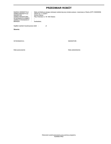 PRZEDMIAR ROBÓT NAZWA INWESTYCJI ADRES INWESTYCJI INWESTOR ADRES INWESTORA WYKONAWCA ROBÓT ADRES WYKONAWCY BRANŻA : : : : : : : Mała architektura służąca rekreacji codziennej przy ścieżce pieszo- rowerowej w Olecku [CPV 45200000] Olecko dz. nr 3234/1 Gmina Olecko Plac Wolności 3, 19- 400 Olecko budowlana; Ogółem wartość kosztorysowa robót : zł Słownie: WYKONAWCA : INWESTOR : Data opracowania Data zatwierdzenia Dokument został opracowany przy pomocy programu NORMA PRO Teren rekreacyjny-Etap I Lp. Podstawa Teren rekreacyjny 1 1.1 1 KNR 2-01 d.1. 0119-03 1 2 KNR 2-31 d.1. 0101-01 1 3 KNR 2-01 d.1. 0202-01 1 0214-04 PRZEDMIAR Opis i wyliczenia ETAP I - 2014 rok TORY DLA ROLKARZY I ROWERZYSTÓW Roboty pomiarowe przy liniowych robotach ziemnych - trasa drogi w terenie równinnym km km Mechaniczne wykonanie koryta na całej szerokości jezdni i chodników w gruncie kat.I-IV głębok. 20 cm m2 <tor dla rowerzystów - pumptrack>70.0 *2.2 <tor dla rolkarzy>190.0*2.0 m2 m2 m3 7 KNR 2-31 d.1. 0105-03 1 m2 m2 9 KNR 2-31 d.1. 0314-03 1 10 KNR 2-31 d.1. 0314-04 1 11 d.1. kalk. własna 1 1.2 12 KNR 2-01 d.1. 0121-02 2 13 KNR 2-31 d.1. 0101-01 2 0.260 154.000 380.000 RAZEM 534.000 106.800 RAZEM 106.800 154.000 380.000 RAZEM 534.000 380.000 107.800 RAZEM 487.800 -380.000 107.800 RAZEM -272.200 46.200 RAZEM 46.200 46.200 RAZEM 46.200 304.000 RAZEM 304.000 304.000 RAZEM 304.000 1.000 RAZEM 1.000 0.015 RAZEM 0.015 150.000 RAZEM 150.000 Podbudowa z krusz.naturalnego jednowarstwowa z domieszk.ulepszaj.z kruszywa m2 łamanego 18 % - grub.warstwy po zagęszcz. 15 cm m2 m2 Podbudowa z krusz.naturalnego jednowarstwowa z domieszk.ulepszaj.z kruszywa m2 łamanego 18 % - za każdy dalszy 1 cm grub.warstwy po zagęszcz. Krotność = 5 <tor dla rolkarzy>-190.0*2.0 m2 <tor dla rowerzystów - pumptrack>70.0 *2.2*70% m2 Podsypka piaskowa z zagęszczeniem mechanicznym - 3 cm grub.warstwy po za- m2 gęszcz. <tor dla rowerzystów - pumptrack>70.0 *2.2*30% 8 KNR 2-31 d.1. 0105-02 1 0.070 0.190 RAZEM Mechanicze zagęszczenie warstwy odsączającej na poszerzeniach - grub.warstwy m2 po zag. 10 cm <tor dla rolkarzy>190.0*2.0 <tor dla rowerzystów - pumptrack>70.0 *2.2*70% 6 KNR 2-31 d.1. 0115-02 1 Razem Roboty ziemne wykon.koparkami przedsiębiernymi o poj.łyżki 0.40 m3 w gr.kat.I-II m3 z transp.urobku samochod.samowyładowczymi na odległość 3 km <tor dla rowerzystów - pumptrack>70.0 *2.2 <tor dla rolkarzy>190.0*2.0 5 KNR 2-31 d.1. 0115-01 1 Poszcz km <tor dla rolkarzy i rowerzystów - pumptrack>70/1000 <tor dla rolkarzy>190/1000 poz.2*0.2 4 KNR 2-31 d.1. 0104-03 1 j.m. m2 Podsypka piaskowa z zagęszczeniem ręcznym - za każdy dalszy 1 cm grub.warst- m2 wy po zagęszcz. Krotność = 7 <tor dla rowerzystów - pumptrack>70.0 *2.2*30% m2 Nawierzchnia z mieszanki asfaltu lanego grysowo-żwirowej - warstwa ścieralna o grub. 2 cm m2 <tor dla rolkarzy>190.0*1.6 m2 Nawierzchnia z mieszanki asfaltu lanego grysowo-żwirowej - warstwa ścieralna za każdy dalszy 1 cm grub. m2 <tor dla rolkarzy>190.0*1.6 m2 Dostawa i montaż -tor dla rowerzystów - długości 70 m. prefabrykowany, wykona- szt ny ze sklejki i drewna modrzewiowego, nawierzchnia jezdna z włókna szklanego tor musi posiadać certyfiak dopuszczenia do użykowania i spełniać normy bezpieczeństwa UE "EN" dla placów zabaw 1 szt URZĄDZENIE SPRAWNOŚCIOWE DO WSPINANIA Roboty pomiarowe przy powierzchniowych robotach ziemnych - koryta pod nawierzchnie placów postojowych ha <urządzenie sprawnościowe>150/10000 ha Mechaniczne wykonanie koryta na całej szerokości jezdni i chodników w gruncie kat.I-IV głębok. 20 cm m2 <urządzenie sprawnościowe>150 m2 -2- Norma PRO Wersja 4.27 Licencja: 3593 dla UM Olecko Teren rekreacyjny-Etap I Lp. Podstawa 14 KNR 2-01 d.1. 0202-01 2 0214-04 PRZEDMIAR Opis i wyliczenia j.m. Roboty ziemne wykon.koparkami przedsiębiernymi o poj.łyżki 0.40 m3 w gr.kat.I-II m3 z transp.urobku samochod.samowyładowczymi na odległość 3 km m3 poz.13*0.2 15 KNR 2-31 d.1. 0104-03 2 m2 18 d.1. kalk. własna 2 30.000 RAZEM 30.000 150.000 RAZEM 150.000 150.000 RAZEM 150.000 150.000 RAZEM 150.000 1.000 RAZEM 1.000 Podsypka piaskowa z zagęszczeniem mechanicznym - 3 cm grub.warstwy po za- m2 gęszcz. m2 <urządzenie sprawnościowe>150 17 KNR 2-31 d.1. 0105-02 2 Razem Mechanicze zagęszczenie warstwy odsączającej na poszerzeniach - grub.warstwy m2 po zag. 10 cm <urządzenie sprawnościowe>150 16 KNR 2-31 d.1. 0105-03 2 Poszcz Podsypka piaskowa z zagęszczeniem ręcznym - za każdy dalszy 1 cm grub.warst- m2 wy po zagęszcz. Krotność = 7 <urządzenie sprawnościowe>150 m2 Dostawa i montaż - urządzenie do sprawnościowe do wspinaczki - piramida TIszt TAN [Nr kat 204] + Ślizg [Nr kat 204a] + Szyb [Nr kat 204f] wg katalogu firmy MAGICNETS lub równoważne - urządzenie musi posiadać certyfiak dopuszczenia do użykowania i spełniać normy bezpieczeństwa UE "EN" dla placów zabaw 1 szt -3- Norma PRO Wersja 4.27 Licencja: 3593 dla UM Olecko