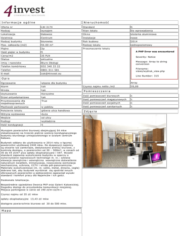 Informacje ogólne Nieruchomość Oferta nr LW-3174 Standard 5 Rodzaj wynajem Stan lokalu Do wprowadzenia Lokalizacja Katowice Okna stolarka aluminiowa Dzielnica Centrum Instalacje nowe Rodzaj budynku biurowiec Rok budowy 2014 Pow. całkowita [m2] 54.00 m² Rodzaj lokalu jednopoziomowy Piętro 3p Przeznaczenie lokalu Ilość pięter w budynku 5 Cena/m2 35 PLN Status aktualna Imię i nazwisko Biuro Obsługi Telefon komórkowy 032 340 33 22 Telefon 0801 011 581 E-mail [email protected] A PHP Error was encountered Severity: Notice Message: Array to string conversion Filename: views/wydruk_view.php Line Number: 315 Opis Array Ogrzewanie własne dla budynku Alarm tak Czynsz najmu netto /m2 Winda tak Pomieszczenia Usytuowanie Korzystne Drzwi antywłamaniowe tak Przystosowania dla niepełnosprawnych True Ilość pomieszczeń biurowych 1 Ilość pomieszczeń magazynowych 1 Ilość pomieszczeń socjalnych 1 1 Możliwość parkowania w pobliżu Ilość pomieszczeń sanitarnych Położenie lokalu główna ulica handlowa Zdjęcia Witryna wystawowa duża Wejście od ulicy Podłogi wykładzina Ilość kondygnacji 5 Wynajem powierzchni biurowej obejmującej 54 mkw zlokalizowanej na trzecim piętrze sześcio-kondygnacyjnego budynku biurowego umiejscowionego w ścisłym centrum Katowic. Budynek oddany do użytkowania w 2014 roku o łącznej powierzchni użytkowej 2440 mkw. Do dyspozycji najemcy są otwarte lub zamknięte, dedykowane aneksy biurowe, z kontrolą dostępu, o powierzchni od 30 – 500m², w cenach od 35 do 44 zł/m² plus opłaty eksploatacyjne i VAT. Wysoki standard zapewnia wykończenie budynku w oparciu o wykorzystanie najnowszych technologii m. in.: szklana elewacja zewnętrzna i wewnętrzna wewnętrzne doświetlenie naturalnym światłem, klimatyzacja, nowoczesna wentylacja mechaniczna, ochrona, CCTV i winda pół-panoramiczna. Materiały wykończeniowe (m. in: szkło, metal, drewno, cegła) dobrano tak, aby budynek wyróżniał się spośród innych oferowanych powierzchni a jednocześnie zapewniał wysoki standard i komfort pracy dla Najemców i ich gości. Doskonała lokalizacja. Bezpośrednie sąsiedztwo Dworca PKP oraz Galerii Katowickiej. Dogodny dostęp do przystanków komunikacji miejskiej. Miejsca parkingowe w cenie od 190 zł/m-ce/m-c Czynsz najmu od 35 zł/ mkw opłaty eksploatacyjne 13,43 zł/ mkw dostępne powierzchnie biurowe od 30 do 500 mkw. Mapa 35,00 40-951 Katowice, Mickiewicza 15 tel. 032/ 340 33 22, [email protected]