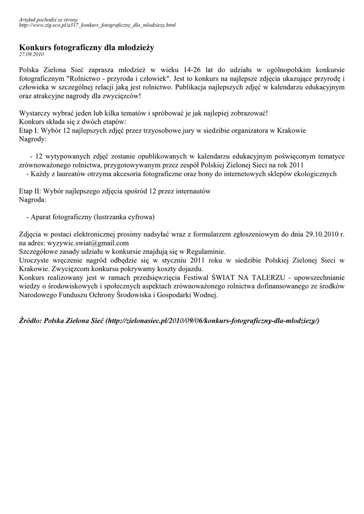 Artykuł pochodzi ze strony http://www.zig.eco.pl/a317_konkurs_fotograficzny_dla_mlodziezy.html Konkurs fotograficzny dla młodzieży 27.09.2010 Polska Zielona Sieć zaprasza młodzież w wieku 14-26 lat do udziału w ogólnopolskim konkursie fotograficznym "Rolnictwo - przyroda i człowiek". Jest to konkurs na najlepsze zdjęcia ukazujące przyrodę i człowieka w szczególnej relacji jaką jest rolnictwo. Publikacja najlepszych zdjęć w kalendarzu edukacyjnym oraz atrakcyjne nagrody dla zwycięzców! Wystarczy wybrać jeden lub kilka tematów i spróbować je jak najlepiej zobrazować! Konkurs składa się z dwóch etapów: Etap I: Wybór 12 najlepszych zdjęć przez trzyosobowe jury w siedzibie organizatora w Krakowie Nagrody: - 12 wytypowanych zdjęć zostanie opublikowanych w kalendarzu edukacyjnym poświęconym tematyce zrównoważonego rolnictwa, przygotowywanym przez zespół Polskiej Zielonej Sieci na rok 2011 - Każdy z laureatów otrzyma akcesoria fotograficzne oraz bony do internetowych sklepów ekologicznych Etap II: Wybór najlepszego zdjęcia spośród 12 przez internautów Nagroda: - Aparat fotograficzny (lustrzanka cyfrowa) Zdjęcia w postaci elektronicznej prosimy nadsyłać wraz z formularzem zgłoszeniowym do dnia 29.10.2010 r. na adres: [email protected] Szczegółowe zasady udziału w konkursie znajdują się w Regulaminie. Uroczyste wręczenie nagród odbędzie się w styczniu 2011 roku w siedzibie Polskiej Zielonej Sieci w Krakowie. Zwycięzcom konkursu pokrywamy koszty dojazdu. Konkurs realizowany jest w ramach przedsięwzięcia Festiwal ŚWIAT NA TALERZU - upowszechnianie wiedzy o środowiskowych i społecznych aspektach zrównoważonego rolnictwa dofinansowanego ze środków Narodowego Funduszu Ochrony Środowiska i Gospodarki Wodnej. Źródło: Polska Zielona Sieć (http://zielonasiec.pl/2010/09/06/konkurs-fotograficzny-dla-mlodziezy/)