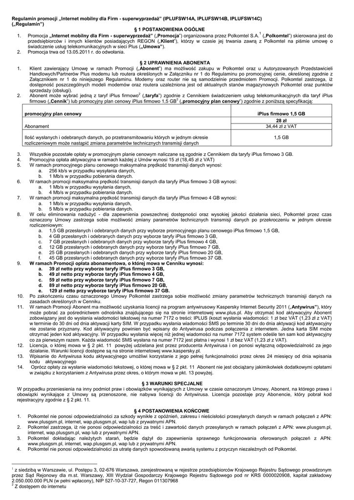 Regulamin promocji „Internet mobilny dla Firm - superwyprzedaż” (IPLUFSW14A, IPLUFSW14B, IPLUFSW14C) („Regulamin”) § 1 POSTANOWIENIA OGÓLNE 1 1. Promocja „Internet mobilny dla Firm - superwyprzedaż” („Promocja”) organizowana przez Polkomtel S.A. („Polkomtel”) skierowana jest do przedsiębiorców i innych klientów posiadających REGON („Klient”), którzy w czasie jej trwania zawrą z Polkomtel na piśmie umowę o świadczenie usług telekomunikacyjnych w sieci Plus („Umowa”). 2. Promocja trwa od 13.05.2011 r. do odwołania. 1. 2. § 2 UPRAWNIENIA ABONENTA Klient zawierający Umowę w ramach Promocji („Abonent”) ma możliwość zakupu w Polkomtel oraz u Autoryzowanych Przedstawicieli Handlowych/Partnerów Plus modemu lub routera określonych w Załączniku nr 1 do Regulaminu po promocyjnej cenie, określonej zgodnie z Załącznikiem nr 1 do niniejszego Regulaminu. Modemy oraz router nie są samodzielnie przedmiotem Promocji. Polkomtel zastrzega, iż dostępność poszczególnych modeli modemów oraz routera uzależniona jest od aktualnych stanów magazynowych Polkomtel oraz punktów sprzedaży (obsługi). Abonent może wybrać jedną z taryf iPlus firmowo2 („taryfa”) zgodnie z Cennikiem świadczeniem usług telekomunikacyjnych dla taryf iPlus firmowo („Cennik”) lub promocyjny plan cenowy iPlus firmowo 1,5 GB2 („promocyjny plan cenowy”) zgodnie z poniższą specyfikacją: promocyjny plan cenowy Abonament Ilość wysłanych i odebranych danych, po przetransmitowaniu których w jednym okresie rozliczeniowym może nastąpić zmiana parametrów technicznych transmisji danych 3. 4. 5. 6. 7. 8. 9. 10. 11. 12. 13. 14. iPlus firmowo 1,5 GB 28 zł 34,44 zł z VAT 1,5 GB Wszystkie pozostałe opłaty w promocyjnym planie cenowym naliczane są zgodnie z Cennikiem dla taryfy iPlus firmowo 3 GB. Promocyjna opłata aktywacyjna w ramach każdej z Umów wynosi 15 zł (18,45 zł z VAT) W ramach promocyjnego planu cenowego maksymalna prędkość transmisji danych wynosi: a. 256 kb/s w przypadku wysyłania danych, b. 1 Mb/s w przypadku pobierania danych. W ramach promocji maksymalna prędkość transmisji danych dla taryfy iPlus firmowo 3 GB wynosi: a. 1 Mb/s w przypadku wysyłania danych, b. 4 Mb/s w przypadku pobierania danych. W ramach promocji maksymalna prędkość transmisji danych dla taryfy iPlus firmowo 4 GB wynosi: a. 1 Mb/s w przypadku wysyłania danych, b. 5 Mb/s w przypadku pobierania danych. W celu eliminowania nadużyć - dla zapewnienia powszechnej dostępności oraz wysokiej jakości działania sieci, Polkomtel przez czas oznaczony Umowy zastrzega sobie możliwość zmiany parametrów technicznych transmisji danych po przekroczeniu w jednym okresie rozliczeniowym: a. 1,5 GB przesłanych i odebranych danych przy wyborze promocyjnego planu cenowego iPlus firmowo 1,5 GB, b. 4 GB przesłanych i odebranych danych przy wyborze taryfy iPlus firmowo 3 GB, c. 7 GB przesłanych i odebranych danych przy wyborze taryfy iPlus firmowo 4 GB, d. 12 GB przesłanych i odebranych danych przy wyborze taryfy iPlus firmowo 7 GB, e. 25 GB przesłanych i odebranych danych przy wyborze taryfy iPlus firmowo 20 GB, f. 45 GB przesłanych i odebranych danych przy wyborze taryfy iPlus firmowo 37 GB. W ramach Promocji opłata abonamentowa, o której mowa w Cenniku wynosi: a. 39 zł netto przy wyborze taryfy iPlus firmowo 3 GB, b. 49 zł netto przy wyborze taryfy iPlus firmowo 4 GB, c. 59 zł netto przy wyborze taryfy iPlus firmowo 7 GB, d. 89 zł netto przy wyborze taryfy iPlus firmowo 20 GB, e. 129 zł netto przy wyborze taryfy iPlus firmowo 37 GB. Po zakończeniu czasu oznaczonego Umowy Polkomtel zastrzega sobie możliwość zmiany parametrów technicznych transmisji danych na zasadach określonych w Cenniku. W ramach Promocji Abonent ma możliwość uzyskania licencji na program antywirusowy Kaspersky Internet Security 2011 („Antywirus”), który może pobrać za pośrednictwem odnośnika znajdującego się na stronie internetowej www.plus.pl. Aby otrzymać kod aktywacyjny Abonent zobowiązany jest do wysłania wiadomości tekstowej na numer 7172 o treści: IPLUS (koszt wysłania wiadomości: 1 zł bez VAT (1,23 zł z VAT) w terminie do 30 dni od dnia aktywacji karty SIM. W przypadku wysłania wiadomości SMS po terminie 30 dni do dnia aktywacji kod aktywacyjny nie zostanie przyznany. Kod aktywacyjny powinien być wpisany do Antywirusa podczas połączenia z internetem. Jedna karta SIM może otrzymać jeden kod aktywacyjny. W przypadku wysłania więcej niż jednej wiadomości na numer 7172 system odeśle ten sam kod aktywacyjny co za pierwszym razem. Każda wiadomość SMS wysłana na numer 7172 jest płatna i wynosi 1 zł bez VAT (1,23 zł z VAT). Licencja, o której mowa w § 2 pkt. 11 powyżej udzielana jest przez producenta Antywirusa i on ponosi wyłączną odpowiedzialność za jego działanie. Warunki licencji dostępne są na stronie internetowej www.kaspersky.pl. Wpisanie do Antywirusa kodu aktywacyjnego umożliwi korzystanie z jego pełnej funkcjonalności przez okres 24 miesięcy od dnia wpisania kodu aktywacyjnego Oprócz opłaty za wysłanie wiadomości tekstowej, o której mowa w § 2 pkt. 11 Abonent nie jest obciążany jakimikolwiek dodatkowymi opłatami w związku z korzystaniem z Antywirusa przez okres, o którym mowa w pkt. 13 powyżej. § 3 WARUNKI SPECJALNE W przypadku przeniesienia na inny podmiot praw i obowiązków wynikających z Umowy w czasie oznaczonym Umowy, Abonent, na którego prawa i obowiązki wynikające z Umowy są przenoszone, nie nabywa licencji do Antywirusa. Licencja pozostaje przy Abonencie, który pobrał kod rejestracyjny zgodnie z § 2 pkt. 11. 1. 2. 3. 4. § 4 POSTANOWIENIA KOŃCOWE Polkomtel nie ponosi odpowiedzialności za szkody wynikłe z opóźnień, zakresu i nieścisłości przesyłanych danych w ramach połączeń z APN: www.plusgsm.pl, internet, wap.plusgsm.pl, wap lub z prywatnymi APN. Polkomtel zastrzega, iż nie p