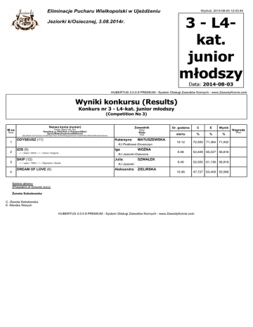 Eliminacje Pucharu Wielkopolski w Ujeżdżeniu Wydruk: 2014-08-04 12:43:44 3 - L4kat. junior młodszy Jeziorki k/Osiecznej, 3.08.2014r. Data: 2014-08-03 HUBERTUS 2.0.0.9 PREMIUM - System Obsługi Zawodów Konnych - www.ZawodyKonne.com Wyniki konkursu (Results) Konkurs nr 3 - L4-kat. junior młodszy (Competition No 3) Nazwa konia (numer) Zawodnik Horse (Show reg. No) Rasa/Kraj ur./Płeć/Rok ur./Paszport/Maść Ojciec/Matka/Hodowca/Właściciel M-ce Rank Rider Klub Club Stud Book init./Country of birth/Sex/Year of birth/Passport/Color Code/Father/Mother/Breeder/Owner 1 2 3 4 ODYSEUSZ (11) Katarzyna MATUSZEWSKA KJ Podkowa Gruszczyn IZIS (5) Iga - / - / klacz / 2004 / - / - / Avero / Izogona SKIP (12) DREAM OF LOVE (6) KJ Jeziorki-Osieczna Julia - / - / ogier / 1995 / - / - / Pigmalion / Skada WOŹNA SZWAŁEK KJ Jeziorki Aleksandra ZIELIŃSKA Or. godzina C E Wynik startu % % % 10.12 72,500 71,364 71,932 9.46 53,409 60,227 56,818 9.40 52,500 61,136 56,818 10.06 47,727 63,409 55,568 Sędzia główny (President of Ground Jury): Żaneta Sokołowska C -Żaneta Sokołowska E -Monika Warych HUBERTUS 2.0.0.9 PREMIUM - System Obsługi Zawodów Konnych - www.ZawodyKonne.com Nagroda Prize