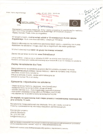 From: rqq"g|' projekrr.r moznawziqcudziafvvl2-miesigcznym S KursieJqzyka AngielskiegoKurstrwadwasemestry i obejmuje rrii|ir<cji. Zajgcia odbywajq s,ienaplatformie jgzykowej dzigkiczemuuczestnicy niemuszq doje2dza0 naezkolenie i mogquclri iiq w cogoanv.n cir siebiegodzinach. wchwiliobecnej truva nabSrdo grupyna miesiqcwrzesieri. Zapiszsiqjuz teraznastronie: wufs/-. DobraZuza.pl prdbna'znajduie siqw zakradce KURSyna stroniewrrvw lStcja DobraZuza.pl Kursanci ponoszqtylkooplatqadministracyj"q * r.*""i" 6;i;* 12-miesigczne szkolenie. Zapisynaszkolenie dla Firm: Zapotrzebowania na szkorenia grupowedlafirmprosimy przesfacna maila -kontatrtu [email protected] nalwq instytucjii danedo orazimionai nazwiska uczestn ikowszkolenia. g osoo,opiataadministractlinaza Dlagruppowyze1 szkolenie wynosiZgzf od osoby. Zgloszeniaindywidualne na szkolenie: - ne stronQplatfornryJqzykowej rnnrvw. DobraZuza.pt $/etUZ ' -,f3lgenie kliknij naikonkqxiJnSy1drrg"oorewep pieru.rszy ku"s- KursAngiets,<ielo brytyjska) lwymowa - !/Vfierz Pcdopisenznajdziesz iKonkQ (Lns. lircln FnoeNn i KUp -,Abyzapisac sienaszkolente t<tit<nij na ikonkeKUpKURS. Ze wzglgduna ograniczonqilo$cmiejscprosimyo wczeEniejszq rezeryacjedla grup po$rytej10 os6b. Na szkolenie mogqzapisywac sig instytucje, firmyjak i osobyprywatne, Frostmy o przekazan ie tet informic1i i*ry"tXi r rui'n:i*,"uo*anym. Koordyhator projektu JolantaGlowacka Tet.510353358 bok@dobrazuza pi JeSliniechcesz r prz '*erdi uniiEuropejskiej kursowi szkolef nl - ""ru oorinuniil;;;.inr. llviadomodc wirsianaBvez Dofinansowane.info zgodniez reguraminem z semrisu.