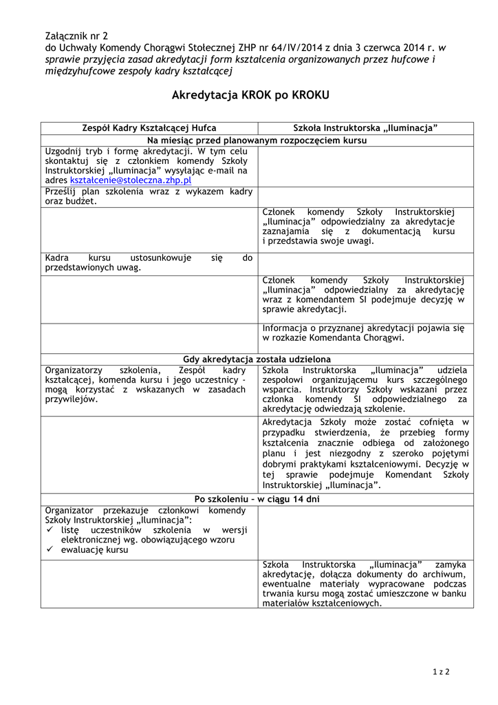 Załącznik nr 2 do Uchwały Komendy Chorągwi Stołecznej ZHP nr 64/IV/2014 z dnia 3 czerwca 2014 r. w sprawie przyjęcia zasad akredytacji form kształcenia organizowanych przez hufcowe i międzyhufcowe zespoły kadry kształcącej Akredytacja KROK po KROKU Zespół Kadry Kształcącej Hufca Szkoła Instruktorska „Iluminacja” Na miesiąc przed planowanym rozpoczęciem kursu Uzgodnij tryb i formę akredytacji. W tym celu skontaktuj się z członkiem komendy Szkoły Instruktorskiej „Iluminacja” wysyłając e-mail na adres kształ[email protected] Prześlij plan szkolenia wraz z wykazem kadry oraz budżet. Członek komendy Szkoły Instruktorskiej „Iluminacja” odpowiedzialny za akredytacje zaznajamia się z dokumentacją kursu i przedstawia swoje uwagi. Kadra kursu ustosunkowuje przedstawionych uwag. się do Członek komendy Szkoły Instruktorskiej „Iluminacja” odpowiedzialny za akredytację wraz z komendantem SI podejmuje decyzję w sprawie akredytacji. Informacja o przyznanej akredytacji pojawia się w rozkazie Komendanta Chorągwi. Gdy akredytacja została udzielona Organizatorzy szkolenia, Zespół kadry Szkoła Instruktorska „Iluminacja” udziela kształcącej, komenda kursu i jego uczestnicy zespołowi organizującemu kurs szczególnego mogą korzystać z wskazanych w zasadach wsparcia. Instruktorzy Szkoły wskazani przez przywilejów. członka komendy SI odpowiedzialnego za akredytację odwiedzają szkolenie. Akredytacja Szkoły może zostać cofnięta w przypadku stwierdzenia, że przebieg formy kształcenia znacznie odbiega od założonego planu i jest niezgodny z szeroko pojętymi dobrymi praktykami kształceniowymi. Decyzję w tej sprawie podejmuje Komendant Szkoły Instruktorskiej „Iluminacja”. Po szkoleniu – w ciągu 14 dni Organizator przekazuje członkowi komendy Szkoły Instruktorskiej „Iluminacja”: ü listę uczestników szkolenia w wersji elektronicznej wg. obowiązującego wzoru ü ewaluację kursu Szkoła Instruktorska „Iluminacja” zamyka akredytację, dołącza dokumenty do archiwum, ewentualne materiały wypracowane podczas trwania kursu mogą zostać umieszczone w banku materiałów kształceniowych. 1 z 2 Załącznik nr 2 do Uchwały Komendy Chorągwi Stołecznej ZHP nr 64/IV/2014 z dnia 3 czerwca 2014 r. w sprawie przyjęcia zasad akredytacji form kształcenia organizowanych przez hufcowe i międzyhufcowe zespoły kadry kształcącej Co Ty, Twoje środowisko i cała Chorągiew może zyskać akredytując formę kształcenia? 1 . Poszerzysz bank materiałów kształceniowych Chorągwi o nowe pomysły, z których Ty sam będziesz mógł w przyszłości skorzystać (powstanie bank materiałów kształceniowych Chorągwi). 2. Będziemy wiedzieć, że organizujesz szkolenie. Wiedząc - łatwiej pomóc. 3. Będziesz miał możliwość poznania opinii innych osób na temat programu własnego kursu. 4. Dołożysz cegiełkę do budowania stylu kształcenia w naszej Chorągwi, do rozwoju naszego wspólnego wzmacniania kadry. Staniesz się jego współautorem. 5. Będziesz budował wizerunek kadry kształcącej Chorągwi. 1) 2) 3) 4) 5) Zespół, który akredytuje formę kształcenia: może uzyskać szerokie wsparcie ze strony kadry Szkoły na podstawie uzgodnień poczynionych z komendantem formy kształcenia i Członkiem Komendy Chorągwi Stołecznej ds. kształcenia, akredytowana forma kształcenia będzie promowana za pomocą materiałów dystrybuowanych przez Szkołę Instruktorską „Iluminacja” i na stronie internetowej Chorągwi, ma gwarancję opublikowania informacji o udzielonej akredytacji dla kursu/warsztatów w rozkazie Komendanta Chorągwi, może używać logo Szkoły Instruktorskiej „Iluminacja” na plakietce/znaczku formy kształcenia, dyplomach i innych materiałach dotyczących danego szkolenia, może zostać zaproszony do grona instruktorów SI „Iluminacja”. 2 z 2