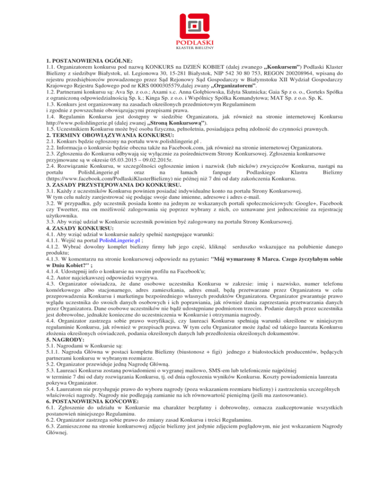 1. POSTANOWIENIA OGÓLNE: 1.1. Organizatorem konkursu pod nazwą KONKURS na DZIEŃ KOBIET (dalej zwanego „Konkursem”) Podlaski Klaster Bielizny z siedzibąw Białystok, ul. Legionowa 30, 15-281 Białystok, NIP 542 30 80 753, REGON 200208964, wpisaną do rejestru przedsiębiorców prowadzonego przez Sąd Rejonowy Sąd Gospodarczy w Białymstoku XII Wydział Gospodarczy Krajowego Rejestru Sądowego pod nr KRS 0000305579,dalej zwany „Organizatorem”. 1.2. Partnerami konkursu są: Ava Sp. z o.o.; Axami s.c. Anna Gołębiowska, Edyta Skutnicka; Gaia Sp z o. o., Gorteks Spółka z ograniczoną odpowiedzialnością Sp. k.; Kinga Sp. z o.o. i Wspólnicy Spółka Komandytowa; MAT Sp. z o.o. Sp. K. 1.3. Konkurs jest organizowany na zasadach określonych przedmiotowym Regulaminem i zgodnie z powszechnie obowiązującymi przepisami prawa. 1.4. Regulamin Konkursu jest dostępny w siedzibie Organizatora, jak również na stronie internetowej Konkursu http://www.polishlingerie.pl (dalej zwanej „Stroną Konkursową”). 1.5. Uczestnikiem Konkursu może być osoba fizyczna, pełnoletnia, posiadająca pełną zdolność do czynności prawnych. 2. TERMINY OBOWIĄZYWANIA KONKURSU: 2.1. Konkurs będzie ogłoszony na portalu www.polishlingerie.pl . 2.2. Informacja o konkursie będzie obecna także na Facebook.com, jak również na stronie internetowej Organizatora. 2.3. Zgłoszenia do Konkursu odbywają się wyłącznie za pośrednictwem Strony Konkursowej. Zgłoszenia konkursowe przyjmowane są w okresie 05.03.2015 – 09.02.2015r. 2.4. Rozwiązanie Konkursu, w szczególności ogłoszenie imion i nazwisk (lub nicków) zwycięzców Konkursu, nastąpi na portalu PolishLingerie.pl oraz na łamach fanpage Podlaskiego Klastra Bielizny (https://www.facebook.com/PodlaskiKlasterBielizny) nie późnej niż 7 dni od daty zakończenia Konkursu. 3. ZASADY PRZYSTĘPOWANIA DO KONKURSU. 3.1. Każdy z uczestników Konkursu powinien posiadać indywidualne konto na portalu Strony Konkursowej. W tym celu należy zarejestrować się podając swoje dane imienne, adresowe i adres e-mail. 3.2. W przypadku, gdy uczestnik posiada konto na jednym ze wskazanych portali społecznościowych: Google+, Facebook czy Tweetter, ma on możliwość zalogowania się poprzez wybrany z nich, co uznawane jest jednocześnie za rejestrację użytkownika. 3.3. Aby wziąć udział w Konkursie uczestnik powinien być zalogowany na portalu Strony Konkursowej. 4. ZASADY KONKURSU: 4.1. Aby wziąć udział w konkursie należy spełnić następujące warunki: 4.1.1. Wejść na portal PolishLingerie.pl ; 4.1.2. Wybrać dowolny komplet bielizny firmy lub jego część, kliknąć serduszko wskazujące na polubienie danego produktu; 4.1.3. W komentarzu na stronie konkursowej odpowiedz na pytanie: "Mój wymarzony 8 Marca. Czego życzyłabym sobie w Dniu Kobiet?" ; 4.1.4. Udostępnij info o konkursie na swoim profilu na Facebook'u; 4.2. Autor najciekawszej odpowiedzi wygrywa. 4.3. Organizator oświadcza, że dane osobowe uczestnika Konkursu w zakresie: imię i nazwisko, numer telefonu komórkowego albo stacjonarnego, adres zamieszkania, adres email, będą przetwarzane przez Organizatora w celu przeprowadzenia Konkursu i marketingu bezpośredniego własnych produktów Organizatora. Organizator gwarantuje prawo wglądu uczestnika do swoich danych osobowych i ich poprawiania, jak również dania zaprzestania przetwarzania danych przez Organizatora. Dane osobowe uczestników nie bądź udostępniane podmiotom trzecim. Podanie danych przez uczestnika jest dobrowolne, jednakże konieczne do uczestniczenia w Konkursie i otrzymania nagrody. 4.4. Organizator zastrzega sobie prawo weryfikacji, czy laureaci Konkursu spełniają warunki określone w niniejszym regulaminie Konkursu, jak również w przepisach prawa. W tym celu Organizator może żądać od takiego laureata Konkursu złożenia określonych oświadczeń, podania określonych danych lub przedłożenia określonych dokumentów. 5. NAGRODY: 5.1. Nagrodami w Konkursie są: 5.1.1. Nagroda Główna w postaci kompletu Bielizny (biustonosz + figi) jednego z białostockich producentów, będących partnerami konkursu w wybranym rozmiarze. 5.2. Organizator przewiduje jedną Nagrodę Główną. 5.3. Laureaci Konkursu zostaną powiadomieni o wygranej mailowo, SMS-em lub telefonicznie najpóźniej w terminie 7 dni od daty rozwiązania Konkursu, tj. od dnia ogłoszenia wyników Konkursu. Koszty powiadomienia laureata pokrywa Organizator. 5.4. Laureatom nie przysługuje prawo do wyboru nagrody (poza wskazaniem rozmiaru bielizny) i zastrzeżenia szczególnych właściwości nagrody. Nagrody nie podlegają zamianie na ich równowartość pieniężną (jeśli ma zastosowanie). 6. POSTANOWIENIA KOŃCOWE: 6.1. Zgłoszenie do udziału w Konkursie ma charakter bezpłatny i dobrowolny, oznacza zaakceptowanie wszystkich postanowień niniejszego Regulaminu. 6.2. Organizator zastrzega sobie prawo do zmiany zasad Konkursu i treści Regulaminu. 6.3. Zamieszczone na stronie konkursowej zdjęcie bielizny jest jedynie zdjęciem poglądowym, nie jest wskazaniem Nagrody Głównej.