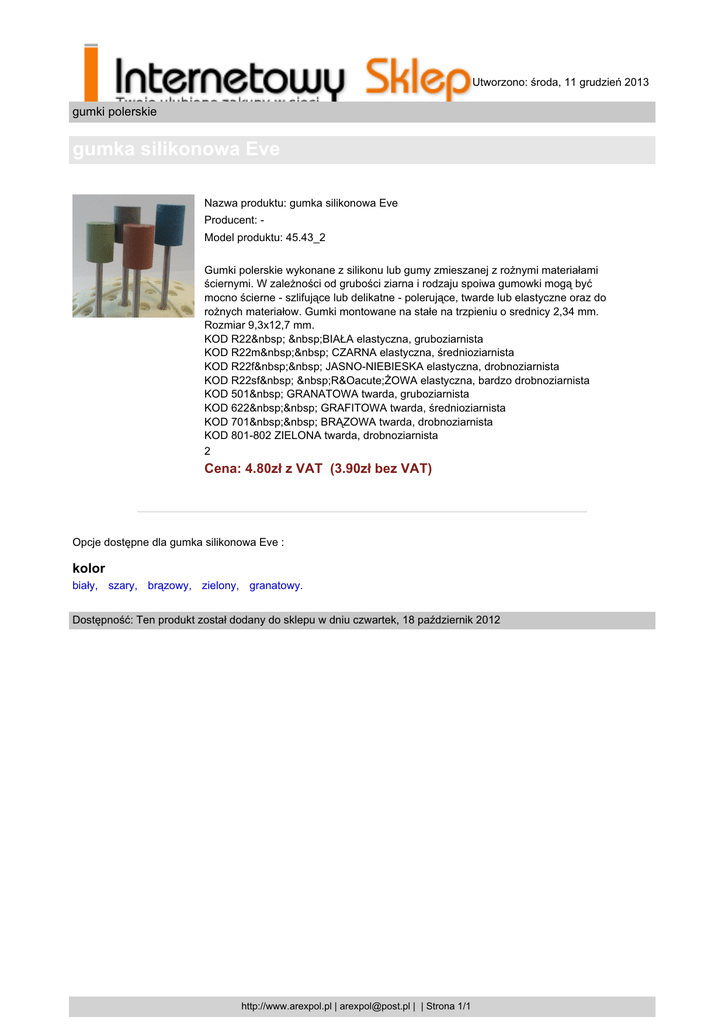 Utworzono: środa, 11 grudzień 2013 gumki polerskie gumka silikonowa Eve Nazwa produktu: gumka silikonowa Eve Producent: Model produktu: 45.43_2 Gumki polerskie wykonane z silikonu lub gumy zmieszanej z rożnymi materiałami ściernymi. W zależności od grubości ziarna i rodzaju spoiwa gumowki mogą być mocno ścierne - szlifujące lub delikatne - polerujące, twarde lub elastyczne oraz do rożnych materiałow. Gumki montowane na stałe na trzpieniu o srednicy 2,34 mm. Rozmiar 9,3x12,7 mm. KOD R22 BIAŁA elastyczna, gruboziarnista KOD R22m CZARNA elastyczna, średnioziarnista KOD R22f JASNO-NIEBIESKA elastyczna, drobnoziarnista KOD R22sf RÓŻOWA elastyczna, bardzo drobnoziarnista KOD 501 GRANATOWA twarda, gruboziarnista KOD 622 GRAFITOWA twarda, średnioziarnista KOD 701 BRĄZOWA twarda, drobnoziarnista KOD 801-802 ZIELONA twarda, drobnoziarnista 2 Cena: 4.80zł z VAT (3.90zł bez VAT) Opcje dostępne dla gumka silikonowa Eve : kolor biały, szary, brązowy, zielony, granatowy. Dostępność: Ten produkt został dodany do sklepu w dniu czwartek, 18 październik 2012 http://www.arexpol.pl | [email protected] | | Strona 1/1