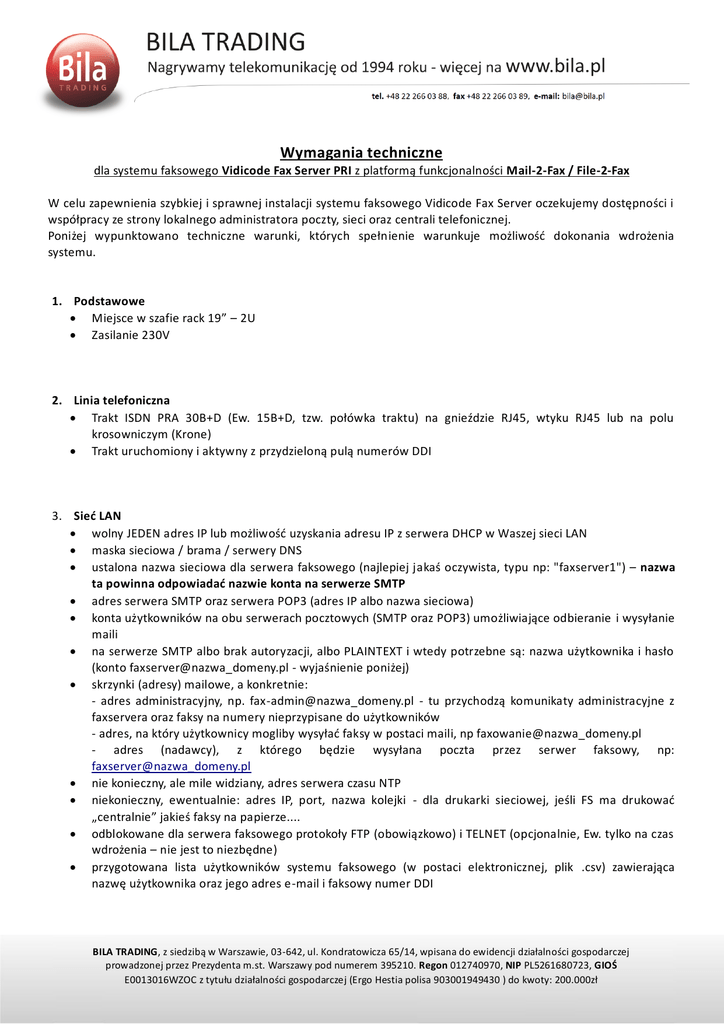 Wymagania techniczne dla systemu faksowego Vidicode Fax Server PRI z platformą funkcjonalności Mail-2-Fax / File-2-Fax W celu zapewnienia szybkiej i sprawnej instalacji systemu faksowego Vidicode Fax Server oczekujemy dostępności i współpracy ze strony lokalnego administratora poczty, sieci oraz centrali telefonicznej. Poniżej wypunktowano techniczne warunki, których spełnienie warunkuje możliwość dokonania wdrożenia systemu. 1. Podstawowe Miejsce w szafie rack 19” – 2U Zasilanie 230V 2. Linia telefoniczna Trakt ISDN PRA 30B+D (Ew. 15B+D, tzw. połówka traktu) na gnieździe RJ45, wtyku RJ45 lub na polu krosowniczym (Krone) Trakt uruchomiony i aktywny z przydzieloną pulą numerów DDI 3. Sieć LAN wolny JEDEN adres IP lub możliwość uzyskania adresu IP z serwera DHCP w Waszej sieci LAN maska sieciowa / brama / serwery DNS ustalona nazwa sieciowa dla serwera faksowego (najlepiej jakaś oczywista, typu np: "faxserver1") – nazwa ta powinna odpowiadać nazwie konta na serwerze SMTP adres serwera SMTP oraz serwera POP3 (adres IP albo nazwa sieciowa) konta użytkowników na obu serwerach pocztowych (SMTP oraz POP3) umożliwiające odbieranie i wysyłanie maili na serwerze SMTP albo brak autoryzacji, albo PLAINTEXT i wtedy potrzebne są: nazwa użytkownika i hasło (konto faxserver@nazwa_domeny.pl - wyjaśnienie poniżej) skrzynki (adresy) mailowe, a konkretnie: - adres administracyjny, np. fax-admin@nazwa_domeny.pl - tu przychodzą komunikaty administracyjne z faxservera oraz faksy na numery nieprzypisane do użytkowników - adres, na który użytkownicy mogliby wysyłać faksy w postaci maili, np faxowanie@nazwa_domeny.pl - adres (nadawcy), z którego będzie wysyłana poczta przez serwer faksowy, np: faxserver@nazwa_domeny.pl nie konieczny, ale mile widziany, adres serwera czasu NTP niekonieczny, ewentualnie: adres IP, port, nazwa kolejki - dla drukarki sieciowej, jeśli FS ma drukować „centralnie” jakieś faksy na papierze.... odblokowane dla serwera faksowego protokoły FTP (obowiązkowo) i TELNET (opcjonalnie, Ew. tylko na czas wdrożenia – nie jest to niezbędne) przygotowana lista użytkowników systemu faksowego (w postaci elektronicznej, plik .csv) zawierająca nazwę użytkownika oraz jego adres e-mail i faksowy numer DDI BILA TRADING, z siedzibą w Warszawie, 03-642, ul. Kondratowicza 65/14, wpisana do ewidencji działalności gospodarczej prowadzonej przez Prezydenta m.st. Warszawy pod numerem 395210. Regon 012740970, NIP PL5261680723, GIOŚ E0013016WZOC z tytułu działalności gospodarczej (Ergo Hestia polisa 903001949430 ) do kwoty: 200.000zł 4. Platforma funkcjonalności Mail-2-Fax Platforma może być zaimplementowana zarówno na fizycznym komputerze/serwerze jak i na maszynie wirtualnej. OS: Windows XP (od Home), Windows 7 (od Home Premium wzwyż), Windows Server od 2003 wzwyż. Zarówno wersje 32-bit, jak i 64-bit mogą być stosowane. Microsoft Office: generalnie dowolny, natomiast rekomendowany jest Office w najwyższej edycji, jaka może być gdzieś/u kogoś z użytkowników zainstalowana. Na dzień dzisiejszy, najlepszym wyborem jest wersja 2010. Zarówno wersje 32-bit jak i 64-bit mogą być stosowane. minimum dwurdzeniowy procesor Intel minimalne taktowanie procesora: 1,8GHz minimalna ilość pamięci RAM: 2GB (dla wersji 64bit: 4GB). konto administracyjne na czas instalacji konto użytkownika do startowania usługi FSEmail ustalone (zdefiniowane, wybrane) rodzaje załączników jakie użytkownicy będą mogli przesyłać mailem do przefaksowania, np. pdf, jpg, doc, xls ... itp. udostępnienie aplikacji niezbędnych do obsługi specyficznych załączników do maili, które mają być wysłane faksem leży po stronie Klienta (np. Microsoft Office) 5. Platforma funkcjonalności File-2-Fax Funkcjonalność File-2-Fax realizowana jest przez tę samą platformę, co funkcjonalność Mail-2-Fax, zatem wymagania są dokładnie identyczne, a dodatkowo: Katalog w sieci LAN udostępniony do zapisu dla uprawnionych do korzystania z funkcjonalności użytkowników 6. Synchronizacja użytkowników systemu faksowego z Active Directory Sprawdzanie uprawnień użytkowników systemu faksowego w bazie AD oraz synchronizacja bazy użytkowników systemu faksowego z AD wymaga platformy FSEmail (opisana w punkcie 4. powyżej). Dodatkowo, w zależności od oczekiwań Klienta oraz wielkości bazy AD i ilości użytkowników potrzebne może okazać się stworzenie specjalnej grupy w AD (np. faxgroup), w której członkostwo będzie warunkiem posiadania przez użytkowników uprawnień do usług faksowych. Jeśli dostęp do LDAP wymaga logowania niezbędne będą: domena/nazwa użytkownika oraz hasło do logowania Każdy z użytkowników, który ma mieć prawo wysyłania faksów z prezentacją własnym numerem DDI musi mieć przypisany numer DDI Każdy z użytkowników, który ma mieć prawo odbierania faksów na swojej skrzynce e -mail, musi mieć przypisany numer DDI oraz adres e-mail Użytkownicy, którzy mają mieć prawo do faksowania „anonimowego” (z głównym numerem puli DDI) mogą nie mieć zdefiniowanego numeru DDI, ale również muszą być członkami wspomnianej grupy w AD (faxgroup). Kilku użytkowników może mieć przypisany ten sam numer DDI w bazie AD. W takiej sytuacji wszyscy Ci użytkownicy będą otrzymywać na swoje skrzynki e-mail faksy odebrane na tym właśnie numerze. Wszyscy też będą wysyłać faksy z użyciem tego samego numeru DDI jako prezentacji i ewentualnie takim samym identyfikatorem faksowym FAX-ID BILA TRADING, z siedzibą w Warszawie, 03-642, ul. Kondratowicza 65/14, wpisana do ewidencji działalności gospodarczej prowadzonej przez Prezydenta m.st. Warszawy pod numerem 395210. Regon 012740970, NIP PL5261680723, GIOŚ E0013016WZOC z tytułu działalności gospodarczej (Ergo Hestia polisa 903001949430 ) do kwoty: 200.000zł