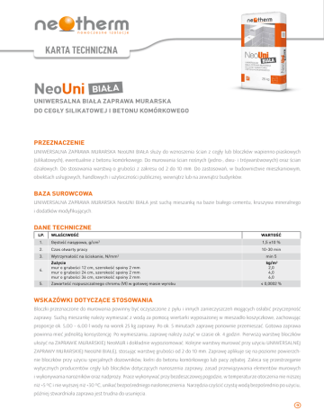 KARTA TECHNICZNA NeoUni BIAŁA UNIWERSALNA BIAŁA ZAPRAWA MURARSKA DO CEGŁY SILIKATOWEJ I BETONU KOMÓRKOWEGO PRZEZNACZENIE UNIWERSALNA ZAPRAWA MURARSKA NeoUNI BIAŁA służy do wznoszenia ścian z cegły lub bloczków wapienno-piaskowych (silikatowych), ewentualnie z betonu komórkowego. Do murowania ścian nośnych (jedno-, dwu- i trójwarstwowych) oraz ścian działowych. Do stosowania warstwą o grubości z zakresu od 2 do 10 mm. Do zastosowań, w budownictwie mieszkaniowym, obiektach usługowych, handlowych i użyteczności publicznej, wewnątrz lub na zewnątrz budynków. BAZA SUROWCOWA UNIWERSALNA ZAPRAWA MURARSKA NeoUNI BIAŁA jest suchą mieszanką na bazie białego cementu, kruszywa mineralnego i dodatków modyfikujących. DANE TECHNICZNE LP. WŁAŚCIWOŚĆ WARTOŚĆ 1. Gęstość nasypowa, g/cm 2. Czas otwarty pracy 3. Wytrzymałość na ściskanie, N/mm2 min 5 4. Zużycie mur o grubości 12 cm, szerokość spoiny 2 mm mur o grubości 24 cm, szerokość spoiny 2 mm mur o grubości 36 cm, szerokość spoiny 2 mm kg/m2 2,0 4,0 6,0 5. Zawartość rozpuszczalnego chromu (VI) w gotowej masie wyrobu 3 1,5 ±10 % 10-30 min ≤ 0,0002 % WSKAZÓWKI DOTYCZĄCE STOSOWANIA Bloczki przeznaczone do murowania powinny być oczyszczone z pyłu i innych zanieczyszczeń mogących osłabić przyczepność zaprawy. Suchą mieszankę należy wymieszać z wodą za pomocą wiertarki wyposażonej w mieszadło koszyczkowe, zachowując proporcje ok. 5,00 – 6,00 l wody na worek 25 kg zaprawy. Po ok. 5 minutach zaprawę ponownie przemieszać. Gotowa zaprawa powinna mieć jednolitą konsystencję. Po wymieszaniu, zaprawę należy zużyć w czasie ok. 4 godzin. Pierwszą warstwę bloczków ułożyć na ZAPRAWIE MURARSKIEJ NeoMUR i dokładnie wypoziomować. Kolejne warstwy murować przy użyciu UNIWERSALNEJ ZAPRAWY MURARSKIEJ NeoUNI BIAŁEJ, stosując warstwę grubości od 2 do 10 mm. Zaprawę aplikuje się na poziome powierzchnie bloczków przy użyciu specjalnych dozowników, kielni do betonu komórkowego lub pacy zębatej. Zaleca się przestrzeganie wytycznych producentów cegły lub bloczków dotyczących nanoszenia zaprawy, zasad przewiązywania elementów murowych i wykonywania narożników oraz nadproży. Prace wykonywać przy bezdeszczowej pogodzie, w temperaturze otoczenia nie niższej niż +5 ºC i nie wyższej niż +30 ºC, unikać bezpośredniego nasłonecznienia. Narzędzia czyścić czystą wodą bezpośrednio po użyciu, później stwardniała zaprawa jest trudna do usunięcia. MAGAZYNOWANIE Dostępne opakowania - worki papierowe 25 kg. Przewozić w oryginalnie zamkniętych opakowaniach, na paletach, składować w suchych, przewiewnych pomieszczeniach. Chronić przed zawilgoceniem. Okres przydatności zaprawy do użycia wynosi 12 miesięcy od daty produkcji umieszczonej w postaci nadruku na boku opakowania. GWARANCJA Opisana powyżej technologia wykonania prac budowlanych z zastosowaniem UNIWERSALNEJ ZAPRAWY MURARSKIEJ NEOUNI BIAŁEJ nie zwalnia z obowiązku wykonywania prac zgodnie z zasadami sztuki budowlanej i odnośnymi przepisami BHP. SPECYFIKACJA TECHNICZNA Zaprawa spełnia wymagania normy PN-EN 998-2:2012, zaprawa typu T. 14 Deklaracja Właściwości Użytkowych nr NT090-3-2/CPR PN-EN EN 998-2:2012 (EN 998-2:2010) UNIWERSALNA ZAPRAWA MURARSKA DO CEGŁY SILIKATOWEJ I BETONU KOMÓRKOWEGO NEOUNI BIAŁA T Zaprawa murarska wytwarzana w zakładzie według przepisu, do cienkich spoin, do stosowania wewnątrz i na zewnątrz, w elementach podlegających wymaganiom konstrukcyjnym, przeznaczona do murów zbrojonych i niezbrojonych, na ściany murowane, słupy i ściany działowe. Proporcje składników cement: wypełniacze 1:3, dodatki < 1% Klasa reakcji na ogień A1 Wytrzymałość na ściskanie ≥ 5,0 N/mm2 Początkowa wytrzymałość na ściskanie (wartość tabelaryczna) ≥ 0,30 N/mm2 Zawartość chlorków 0,1 % Cl 0,05 kg/m2min0,5 Absorpcja wody Współczynnik przepuszczania pary wodnej (wartość tabelaryczna), μ 15/35 EN 1745:2002, tab. A.12 Współczynnik przewodzenia ciepła (średnia wartość tabelaryczna P=50%) 0,83 W/mK (λ10,dry) EN 1745:2002, tab. A.12 Czas korekty ≤ 10 min Frakcja kruszywa ≤ 0,8 mm Trwałość - spadek wytrzymałości po cyklach zamrażania-rozmrażania ≤ 10 % Trwałość - ubytek masy po cyklach zamrażania-rozmrażania ≤3% Uwalnianie / zawartość substancji niebezpiecznych - patrz Karta Charakterystyki Data aktualizacji niniejszej Karty Technicznej: 2014-04-09 www.neotherm.pl PRODUCENT: Neotherm Sp. z o.o. spółka komandytowa ul. Gen. Mieczysława Boruty-Spiechowicza 68 43-300 Bielsko-Biała Zakład Produkcyjny Chmielów 39-442 Chmielów ul. Chemiczna 14 tel. 89 715 08 00, fax 89 715 08 01 [email protected] Zakład Produkcyjny Biskupiec 11-300 Biskupiec Kolonia III/5 tel. 89 715 08 00, fax 89 715 08 01 [email protected] Neoprofil Sp. jawna Zakład Produkcyjny Wrocław 54-103 Wrocław, ul. Brodzka 10 tel./fax 71 354 38 52 [email protected] Neotherm Sp. jawna Zakład Produkcyjny Myszków 42-300 Myszków, ul. Pułaskiego 6 tel. 34 313 32 89 [email protected]