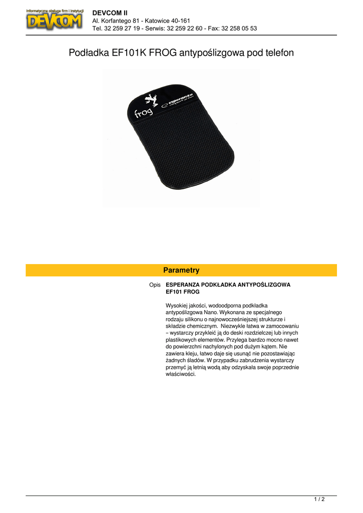 DEVCOM II Al. Korfantego 81 - Katowice 40-161 Tel. 32 259 27 19 - Serwis: 32 259 22 60 - Fax: 32 258 05 53 Podładka EF101K FROG antypoślizgowa pod telefon Parametry Opis ESPERANZA PODKŁADKA ANTYPOŚLIZGOWA EF101 FROG Wysokiej jakości, wodoodporna podkładka antypoślizgowa Nano. Wykonana ze specjalnego rodzaju silikonu o najnowocześniejszej strukturze i składzie chemicznym. Niezwykle łatwa w zamocowaniu – wystarczy przykleić ją do deski rozdzielczej lub innych plastikowych elementów. Przylega bardzo mocno nawet do powierzchni nachylonych pod dużym kątem. Nie zawiera kleju, łatwo daje się usunąć nie pozostawiając żadnych śladów. W przypadku zabrudzenia wystarczy przemyć ją letnią wodą aby odzyskała swoje poprzednie właściwości. 1/2 DEVCOM II Al. Korfantego 81 - Katowice 40-161 Tel. 32 259 27 19 - Serwis: 32 259 22 60 - Fax: 32 258 05 53 Uwaga: Zdjęcia z telefonem prezentują możliwości produktu, telefon na zdjęciach nie wchodzi w skład sprzedawanego produktu. Materiał Silikon Kolor Czarny Wymiary 150 x 90 mm Pozostałe parametry - Nie zawiera kleju - Odporna na wysokie temperatury i promienie UV - Do gadżetów takich jak: telefony komórkowe, klucze, okulary, odtwarzacze MP3/4, nawigacji i innych drobnych przedmiotów 2/2 Powered by TCPDF (www.tcpdf.org)