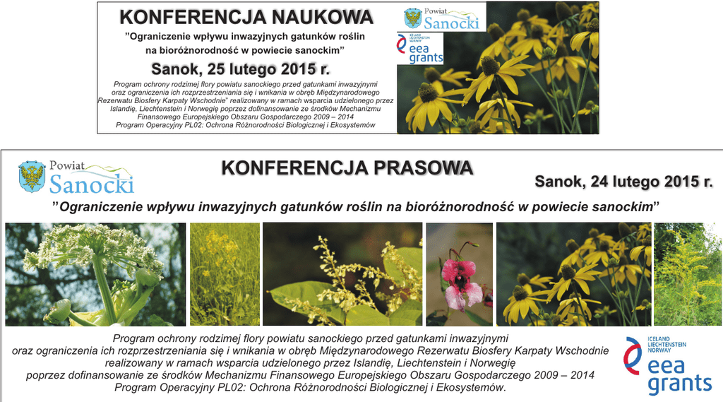 KONFERENCJA NAUKOWA ”Ograniczenie wp³ywu inwazyjnych gatunków roœlin na bioró¿norodnoœæ w powiecie sanockim” Sanok, 25 lutego 2015 r. Program ochrony rodzimej flory powiatu sanockiego przed gatunkami inwazyjnymi oraz ograniczenia ich rozprzestrzeniania siê i wnikania w obrêb Miêdzynarodowego Rezerwatu Biosfery Karpaty Wschodnie” realizowany w ramach wsparcia udzielonego przez Islandiê, Liechtenstein i Norwegiê poprzez dofinansowanie ze œrodków Mechanizmu Finansowego Europejskiego Obszaru Gospodarczego 2009 – 2014 Program Operacyjny PL02: Ochrona Ró¿norodnoœci Biologicznej i Ekosystemów KONFERENCJA PRASOWA Sanok, 24 lutego 2015 r. ”Ograniczenie wp³ywu inwazyjnych gatunków roœlin na bioró¿norodnoœæ w powiecie sanockim” Program ochrony rodzimej flory powiatu sanockiego przed gatunkami inwazyjnymi oraz ograniczenia ich rozprzestrzeniania siê i wnikania w obrêb Miêdzynarodowego Rezerwatu Biosfery Karpaty Wschodnie realizowany w ramach wsparcia udzielonego przez Islandiê, Liechtenstein i Norwegiê poprzez dofinansowanie ze œrodków Mechanizmu Finansowego Europejskiego Obszaru Gospodarczego 2009 – 2014 Program Operacyjny PL02: Ochrona Ró¿norodnoœci Biologicznej i Ekosystemów.