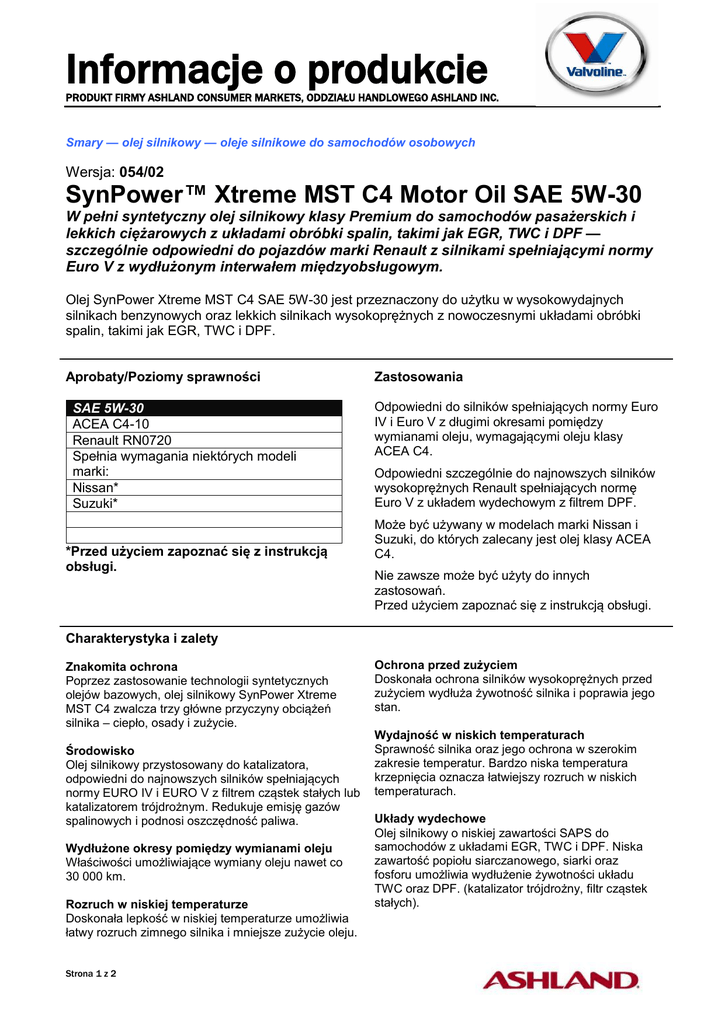Informacje o produkcie PRODUKT FIRMY ASHLAND CONSUMER MARKETS, ODDZIAŁU HANDLOWEGO ASHLAND INC. Smary — olej silnikowy — oleje silnikowe do samochodów osobowych Wersja: 054/02 SynPower™ Xtreme MST C4 Motor Oil SAE 5W-30 W pełni syntetyczny olej silnikowy klasy Premium do samochodów pasażerskich i lekkich ciężarowych z układami obróbki spalin, takimi jak EGR, TWC i DPF — szczególnie odpowiedni do pojazdów marki Renault z silnikami spełniającymi normy Euro V z wydłużonym interwałem międzyobsługowym. Olej SynPower Xtreme MST C4 SAE 5W-30 jest przeznaczony do użytku w wysokowydajnych silnikach benzynowych oraz lekkich silnikach wysokoprężnych z nowoczesnymi układami obróbki spalin, takimi jak EGR, TWC i DPF. Aprobaty/Poziomy sprawności SAE 5W-30 ACEA C4-10 Renault RN0720 Spełnia wymagania niektórych modeli marki: Nissan* Suzuki* *Przed użyciem zapoznać się z instrukcją obsługi. Zastosowania Odpowiedni do silników spełniających normy Euro IV i Euro V z długimi okresami pomiędzy wymianami oleju, wymagającymi oleju klasy ACEA C4. Odpowiedni szczególnie do najnowszych silników wysokoprężnych Renault spełniających normę Euro V z układem wydechowym z filtrem DPF. Może być używany w modelach marki Nissan i Suzuki, do których zalecany jest olej klasy ACEA C4. Nie zawsze może być użyty do innych zastosowań. Przed użyciem zapoznać się z instrukcją obsługi. Charakterystyka i zalety Znakomita ochrona Poprzez zastosowanie technologii syntetycznych olejów bazowych, olej silnikowy SynPower Xtreme MST C4 zwalcza trzy główne przyczyny obciążeń silnika – ciepło, osady i zużycie. Środowisko Olej silnikowy przystosowany do katalizatora, odpowiedni do najnowszych silników spełniających normy EURO IV i EURO V z filtrem cząstek stałych lub katalizatorem trójdrożnym. Redukuje emisję gazów spalinowych i podnosi oszczędność paliwa. Wydłużone okresy pomiędzy wymianami oleju Właściwości umożliwiające wymiany oleju nawet co 30 000 km. Rozruch w niskiej temperaturze Doskonała lepkość w niskiej temperaturze umożliwia łatwy rozruch zimnego silnika i mniejsze zużycie oleju. Strona 1 z 2 Ochrona przed zużyciem Doskonała ochrona silników wysokoprężnych przed zużyciem wydłuża żywotność silnika i poprawia jego stan. Wydajność w niskich temperaturach Sprawność silnika oraz jego ochrona w szerokim zakresie temperatur. Bardzo niska temperatura krzepnięcia oznacza łatwiejszy rozruch w niskich temperaturach. Układy wydechowe Olej silnikowy o niskiej zawartości SAPS do samochodów z układami EGR, TWC i DPF. Niska zawartość popiołu siarczanowego, siarki oraz fosforu umożliwia wydłużenie żywotności układu TWC oraz DPF. (katalizator trójdrożny, filtr cząstek stałych). Informacje o produkcie PRODUKT FIRMY ASHLAND CONSUMER MARKETS, ODDZIAŁU HANDLOWEGO ASHLAND INC. Bezpieczeństwo Niniejszy produkt prawdopodobnie nie stwarza znaczącego zagrożenia dla zdrowia lub bezpieczeństwa, o ile jest używany prawidłowo w odpowiednim zastosowaniu. Kartę charakterystyki (MSDS) można uzyskać na życzenie od lokalnego dystrybutora lub pobrać ją z witryny pod adresem http://msds.ashland.com Ochrona środowiska Zużyty olej należy oddawać do odpowiedniego punktu zbiórki. Nie spuszczać do ścieków, gleby lub cieków wodnych. Charakterystyczne właściwości Charakterystyka typowych właściwości jest oparta na aktualnie produkowanym preparacie. W przyszłości produkcja będzie zgodna ze specyfikacjami Valvoline™, natomiast mogą wystąpić zmiany tej charakterystyki. SynPower Xtreme MST C4 Klasa lepkości SAE Lepkość, mm2/s w temperaturze 100 ºC. ASTM D-445 Lepkość, mm2/s w temperaturze 40 ºC. ASTM D-445 Wskaźnik lepkości ASTM D-2270 Lepkość, mPa.s –30ºC. ASTM D-5293 TBN, mg KOH/g ASTM D-2896 Temperatura krzepnięcia, ºC ASTM D-5950 Ciężar właściwy przy 15,6°C. ASTM D-4052 Temperatura zapłonu, COC, ºC. ASTM D-92 People Who Know Use Valvoline™ Działając w ponad 100 krajach na całym świecie, firma Valvoline to wiodący sprzedawca, dystrybutor i producent wysokiej jakości produktów i usług samochodowych i przemysłowych. Do produktów tej firmy należą smary samochodowe, m.in. MaxLife™ — pierwszy olej silnikowy o formule przeznaczonej specjalnie do pojazdów o wyższym przebiegu; płyny przekładniowe, oleje przekładniowe, smary hydrauliczne, chemikalia motoryzacyjne, produkty specjalne; smary oraz produkty do układu chłodzenia. Aby uzyskać więcej informacji na temat produktów i usług firmy Valvoline, odwiedź www.valvolineeurope.com Autor: AdG Zastępuje – 054/01 5W-30 12,0 70,9 170 <6600 7,2 -42 0,853 235 Niniejsze informacje dotyczą wyłącznie produktów wytworzonych w następujących lokalizacjach: Europa *Znak towarowy będący własnością osoby trzeciej ™ Znak towarowy Ashland lub przedsiębiorstw zależnych, zarejestrowany w różnych krajach © 2013, Ashland Uważa się, że wszelkie informacje oraz dane przedstawione w niniejszym dokumencie są dokładne i wiarygodne, ale nie mogą być traktowane jako gwarancja, gwarancja wyraźna lub dorozumiana, gwarancja przydatności handlowej lub przydatności do określonego celu, lub reprezentacja, wyraźna lub dorozumiana, za którą Ashland Inc. i jej spółki zależne ponoszą odpowiedzialność prawną. Strona 2 z 2