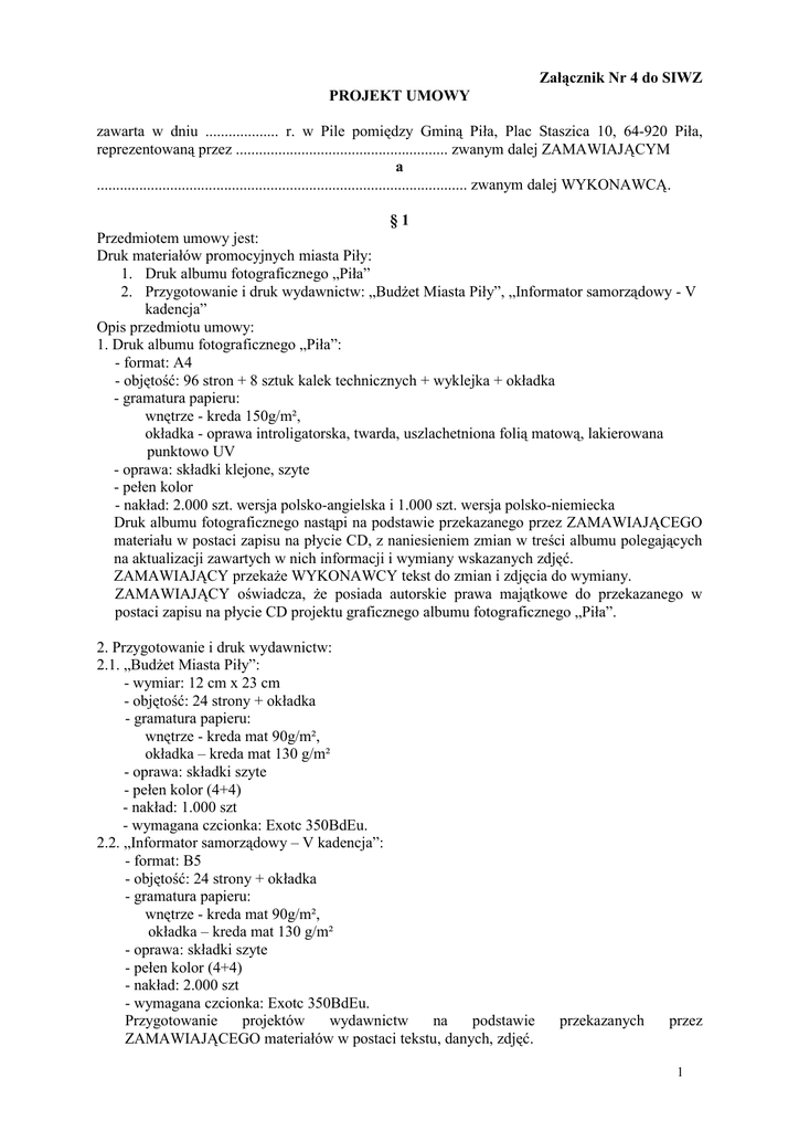 Załącznik Nr 4 do SIWZ PROJEKT UMOWY zawarta w dniu ................... r. w Pile pomiędzy Gminą Piła, Plac Staszica 10, 64-920 Piła, reprezentowaną przez ....................................................... zwanym dalej ZAMAWIAJĄCYM a ................................................................................................ zwanym dalej WYKONAWCĄ. §1 Przedmiotem umowy jest: Druk materiałów promocyjnych miasta Piły: 1. Druk albumu fotograficznego „Piła” 2. Przygotowanie i druk wydawnictw: „BudŜet Miasta Piły”, „Informator samorządowy - V kadencja” Opis przedmiotu umowy: 1. Druk albumu fotograficznego „Piła”: - format: A4 - objętość: 96 stron + 8 sztuk kalek technicznych + wyklejka + okładka - gramatura papieru: wnętrze - kreda 150g/m², okładka - oprawa introligatorska, twarda, uszlachetniona folią matową, lakierowana punktowo UV - oprawa: składki klejone, szyte - pełen kolor - nakład: 2.000 szt. wersja polsko-angielska i 1.000 szt. wersja polsko-niemiecka Druk albumu fotograficznego nastąpi na podstawie przekazanego przez ZAMAWIAJĄCEGO materiału w postaci zapisu na płycie CD, z naniesieniem zmian w treści albumu polegających na aktualizacji zawartych w nich informacji i wymiany wskazanych zdjęć. ZAMAWIAJĄCY przekaŜe WYKONAWCY tekst do zmian i zdjęcia do wymiany. ZAMAWIAJĄCY oświadcza, Ŝe posiada autorskie prawa majątkowe do przekazanego w postaci zapisu na płycie CD projektu graficznego albumu fotograficznego „Piła”. 2. Przygotowanie i druk wydawnictw: 2.1. „BudŜet Miasta Piły”: - wymiar: 12 cm x 23 cm - objętość: 24 strony + okładka - gramatura papieru: wnętrze - kreda mat 90g/m², okładka – kreda mat 130 g/m² - oprawa: składki szyte - pełen kolor (4+4) - nakład: 1.000 szt - wymagana czcionka: Exotc 350BdEu. 2.2. „Informator samorządowy – V kadencja”: - format: B5 - objętość: 24 strony + okładka - gramatura papieru: wnętrze - kreda mat 90g/m², okładka – kreda mat 130 g/m² - oprawa: składki szyte - pełen kolor (4+4) - nakład: 2.000 szt - wymagana czcionka: Exotc 350BdEu. Przygotowanie projektów wydawnictw na podstawie ZAMAWIAJĄCEGO materiałów w postaci tekstu, danych, zdjęć. przekazanych przez 1 Specyfikacja Istotnych Warunków Zamówienia oraz oferta WYKONAWCY stanowią załączniki do niniejszej umowy. §2 WYKONAWCA ponosi koszty: - dokonania korekty tekstu i opracowania tłumaczeń korekty wersji językowych albumu fotograficznego „Piła” - wymiany 6 zdjęć w albumie fotograficznym - opracowania projektu graficznego wydawnictwa „BudŜet Miasta Piły”, „Informator samorządowy - V kadencja” - wydruków próbnych, barwnych albumu fotograficznego i wydawnictw - pozyskania czcionki wymaganej przez ZAMAWIAJĄCEGO. §3 ZAMAWIAJĄCY przed oddaniem albumu fotograficznego i wydawnictw do druku zatwierdzi ostateczną wersję, dobór zdjęć, elementów graficznych i projekty graficzne. Zatwierdzenie wymaga formy pisemnej Naczelnika Wydziału Promocji i Rozwoju Urzędu Miasta Piły. §4 1. WYKONAWCA nie ma prawa powierzenia wykonania przedmiotu umowy osobom trzecim bez pisemnej zgody ZAMAWIAJĄCEGO. 2. ZAMAWIAJĄCY przekaŜe WYKONAWCY materiały niezbędne do wykonania przedmiotu zamówienia: 2.1. płyta CD z projektem albumu fotograficznego „Piła”, tekst i zdjęcia do przygotowania druku albumu fotograficznego „Piła” do dnia ............ 2010 r. 2.2. tekst, dane i zdjęcia do przygotowania wydawnictwa „BudŜet Miasta Piły” do dnia .............. 2010 r. 2.3. tekst, dane i zdjęcia do przygotowania wydawnictwa „Informator samorządowy – V kadencja” do dnia …................ 2010 r. §5 1. WYKONAWCA po wykonaniu przedmiotu umowy zobowiązany jest rozliczyć się z materiałów udostępnionych przez ZAMAWIAJĄCEGO. 2. WYKONAWCA po wykonaniu przedmiotu umowy przekaŜe ZAMAWIAJĄCEMU pełne materiały w postaci zapisu na płycie CD/DVD, w formie umoŜliwiającej dokonywanie dalszych zmian i dodruków. 3. WYKONAWCA oświadcza, Ŝe nie wykorzysta powierzonych materiałów do innych celów. §6 1. W momencie odbioru wydawnictw „BudŜet Miasta Piły”, „Informator samorządowy - V kadencja” przez ZAMAWIAJĄCEGO WYKONAWCA przenosi nieodpłatnie na ZAMAWIAJĄCEGO autorskie prawa majątkowe do wydawnictw w zakresie następujących pól eksploatacji: - utrwalanie i zwielokrotnianie – wytwarzanie określoną techniką, w tym techniką drukarską, reprograficzną, fotograficzną, zapis magnetyczny, cyfrowy; - wprowadzenie do obrotu; - rozpowszechnianie poprzez publiczne wystawienie, wyświetlenie, odtworzenie oraz nadawanie i reemitowanie - dokonywanie zmian polegających na aktualizacji zawartych w nich informacji, wymianie zdjęć, elementów graficznych, zmianie kompozycji. 2. Wykonawca przenosi autorskie prawa majątkowe do wydawnictw bez ograniczeń czasowych. 3. Przeniesienie autorskich praw majątkowych upowaŜnia Zamawiającego do korzystania z wydawnictw w całości jak i z poszczególnych ich fragmentów w zakresie ww. pól eksploatacji. 2 4. Wraz z przeniesieniem nieodpłatnie autorskich praw majątkowych Wykonawca przenosi na Zamawiającego nieodpłatnie oryginał wydawnictw. §7 WYKONAWCA oświadcza, Ŝe dzieło nie jest obciąŜone prawami osób WYKONAWCA oświadcza jednocześnie, Ŝe absolutnie praw takich nie narusza. trzecich. §8 Termin wykonania przedmiotu umowy określonego w § 1 strony ustalają następująco: 1. Druk albumu fotograficznego „Piła” na dzień 31 marca 2010 r. 2. Przygotowanie i druk wydawnictw: „BudŜet Miasta Piły, „Informator samorządowy – V kadencja” na dzień 17 maja 2010 r. §9 1. ZAMAWIAJĄCY otrzyma przedmiot umowy w zakresie § 8 ust. 1 w dniu 31.03.2010 r., w zakresie § 8 ust. 2 w dniu 17.05.2010 r. w siedzibie Urzędu Miasta Piły, Plac Staszica 10. 2. Osobą wskazaną do odbioru przedmiotu umowy jest Naczelnik Wydziału Promocji i Rozwoju Urzędu Miasta Piły. § 10 WYKONAWCA po wykon