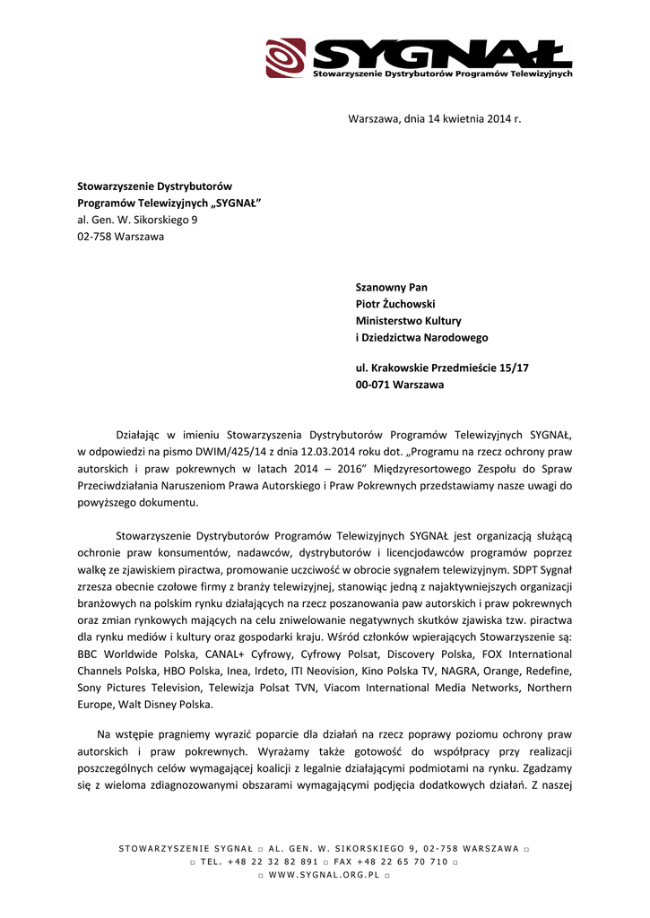 Warszawa, dnia 14 kwietnia 2014 r. Stowarzyszenie Dystrybutorów Programów Telewizyjnych „SYGNAŁ” al. Gen. W. Sikorskiego 9 02-758 Warszawa Szanowny Pan Piotr Żuchowski Ministerstwo Kultury i Dziedzictwa Narodowego ul. Krakowskie Przedmieście 15/17 00-071 Warszawa Działając w imieniu Stowarzyszenia Dystrybutorów Programów Telewizyjnych SYGNAŁ, w odpowiedzi na pismo DWIM/425/14 z dnia 12.03.2014 roku dot. „Programu na rzecz ochrony praw autorskich i praw pokrewnych w latach 2014 – 2016” Międzyresortowego Zespołu do Spraw Przeciwdziałania Naruszeniom Prawa Autorskiego i Praw Pokrewnych przedstawiamy nasze uwagi do powyższego dokumentu. Stowarzyszenie Dystrybutorów Programów Telewizyjnych SYGNAŁ jest organizacją służącą ochronie praw konsumentów, nadawców, dystrybutorów i licencjodawców programów poprzez walkę ze zjawiskiem piractwa, promowanie uczciwość w obrocie sygnałem telewizyjnym. SDPT Sygnał zrzesza obecnie czołowe firmy z branży telewizyjnej, stanowiąc jedną z najaktywniejszych organizacji branżowych na polskim rynku działających na rzecz poszanowania paw autorskich i praw pokrewnych oraz zmian rynkowych mających na celu zniwelowanie negatywnych skutków zjawiska tzw. piractwa dla rynku mediów i kultury oraz gospodarki kraju. Wśród członków wpierających Stowarzyszenie są: BBC Worldwide Polska, CANAL+ Cyfrowy, Cyfrowy Polsat, Discovery Polska, FOX International Channels Polska, HBO Polska, Inea, Irdeto, ITI Neovision, Kino Polska TV, NAGRA, Orange, Redefine, Sony Pictures Television, Telewizja Polsat TVN, Viacom International Media Networks, Northern Europe, Walt Disney Polska. Na wstępie pragniemy wyrazić poparcie dla działań na rzecz poprawy poziomu ochrony praw autorskich i praw pokrewnych. Wyrażamy także gotowość do współpracy przy realizacji poszczególnych celów wymagającej koalicji z legalnie działającymi podmiotami na rynku. Zgadzamy się z wieloma zdiagnozowanymi obszarami wymagającymi podjęcia dodatkowych działań. Z naszej STOWARZYSZENIE SYGNAŁ □ AL. GEN. W. SIKORSKIEGO 9, 02-758 WARSZAWA □ □ TEL. +48 22 32 82 891 □ FAX +48 22 65 70 710 □ □ WWW.SYGNAL.ORG.PL □ perspektywy główne problemy i wyzwania związane są ze wskazanymi przez MKiDN celami strategicznymi to: 1) Nieefektywny system postępowań przygotowawczych oraz sądowych dotyczących ochrony praw autorskich i praw pokrewnych (cel strategiczny 2) oraz brak współpracy międzyresortowej (cel strategiczny 1) Z uwagi na trudności związane z dochodzeniem roszczeń z tytułu naruszenia praw autorskich i praw pokrewnych w Internecie na drodze cywilnej, w praktyce podstawową ścieżką procedowania jest droga karna. Wśród głównych problemów związanych z dochodzeniem karnej ochrony prawnoautorskiej w Polsce, z jakimi spotykają się podmioty zrzeszone w Stowarzyszeniu SYGNAŁ oraz samo Stowarzyszenie reprezentujące interesy pokrzywdzonych członków, wymienić należy: przewlekłość postępowań, niechęć organów ścigania do wszczynania postępowań ściganych z urzędu, brak badania przez organy ścigania przesłanek z art. 116 ust 3 PrAut, Brak podejmowania czynności mających na celu ustalenie sprawcy lub wysokość szkody wyrządzonej pokrzywdzonym, niekorzystanie z instytucji międzynarodowej pomocy prawnej czy brak uwzględniania przychodów np. z SMS Premium w ramach dochodu uzyskiwanego z nielegalnego rozpowszechniania utworów chronionych prawem autorskim. 2) Brak współpracy międzynarodowej (cel strategiczny 6) Pomimo przyjęcia przez Ministra Sprawiedliwości 30 kwietnia 2012 roku rozporządzenia w sprawie sposobu realizacji zadań związanych ze współpracą powszechnych jednostek organizacyjnych prokuratury z organizacjami międzynarodowymi lub ponadnarodowymi działającymi na podstawie umów międzynarodowych, które sformalizowało współpracą prokuratury z właściwymi organizacjami międzynarodowymi w celu zwalczania przestępczości, przypadki takich działań w obszarze prawa autorskiego są jednak niezwykle rzadkie. Sam fakt konieczności nawiązania współpracy międzynarodowej np. w celu pozyskania informacji na temat sprawy, jest często pretekstem do umorzenia lub zawieszania postępowania wskazując na niemożność pozyskania takich danych, bez realnej próby ich zdobycia. Współpraca międzynarodowa jest koniecznym czynnikiem w świetle popularyzacji modeli biznesowych serwisów pirackich opartych na transgranicznej działalności, gdzie kraj prowadzenia działalności różni się od kraju powstania szkody czy kraju lokalizacji serwerów. Jedynie dzięki sprawnej współpracy międzynarodowej możliwe są skuteczne działania organów ścigania. 3) Niska świadomość i wrażliwość społeczna na temat szkodliwości zjawiska piractwa na rynek i wpływu na gospodarkę kraju, co w konsekwencji rodzi niepożądane skutki także dla konsumentów treści (cel strategiczny 5) Dla realizacji celu szczególne znaczenia ma aktywny udział organów administracji publicznej. W ramach podejmowanych działań niezbędna jest tu szeroka kampania społeczna oraz dyskusja z szerokim zaangażowaniem opinii publicznej. Niesłychanie ważne są działania edukacyjne skierowanie do uczniów. Uwzględniając dotychczasowe doświadczenia w tym zakresie, programy edukacyjne winny mieć STOWARZYSZENIE SYGNAŁ □ AL. GEN. W. SIKORSKIEGO 9, 02-758 WARSZAWA □ □ TEL. +48 22 32 82 891 □ FAX +48 22 65 70 710 □ □ WWW.SYGNAL.ORG.PL □ powszechny charakter. Dyskusja o poszanowaniu praw autorskich nie powinna ograniczać się do specjalistycznych zagadnieniach czy pracach naukowych, które ze swej natury mają ograniczone oddziaływanie. 4) Niskie wsparcie dla rozwoju legalnych modeli biznesowych związanych z dystrybucją cyfrową przedmiotów prawa autorskiego. Rynek legalnego cyfrowego obiegu treści jest wciąż w fazie rozwoju, a podmioty na tym rynku mierzyć się muszą z trudnościami związanym