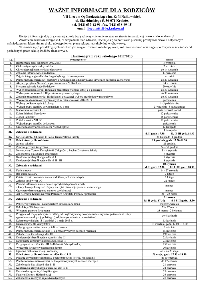 WAŻNE INFORMACJE DLA RODZICÓW VII Liceum Ogólnokształcące im. Zofii Nałkowskiej, ul. Skarbińskiego 5, 30-071 Kraków, tel. (012) 637-42-91, fax. (012) 638-69-15 email: [email protected] Bieżące informacje dotyczące naszej szkoły będą sukcesywnie umieszczane na stronie internetowej www.vii-lo.krakow.pl Zwolnienie lekarskie z zajęć w-f, ze względu na stan zdrowia, uzyskuje się na podstawie pisemnej prośby Rodziców z dołączonym zaświadczeniem lekarskim na druku udostępnionym przez sekretariat szkoły lub wychowawcę. W ramach zajęć pozalekcyjnych możliwe jest zorganizowanie kół olimpijskich, kół zainteresowań oraz zajęć sportowych w zależności od posiadanych przez szkołę środków finansowych. Harmonogram roku szkolnego 2012/2013 Przedsięwzięcie Lp. 1. 2. 3. 4. 5. 6. 7. 8. 9. 10. 11. 12. 13. 14. 15. 16. 17. 18. 19. 20. Rozpoczęcie roku szkolnego 2012/2013 Giełda używanych podręczników Okres adaptacji uczniów klas pierwszych Zebrania informacyjne z rodzicami Zajęcia integracyjne dla klas I wg odrębnego harmonogramu Poinformowanie uczniów i rodziców o wymaganiach edukacyjnych i kryteriach oceniania zachowania Akcja „Sprzątanie Świata”, w porozumieniu z V Dzielnicą Plenarne zebranie Rady Rodziców Wybór przez uczniów kl. III tematu prezentacji w części ustnej z j. polskiego Wybór przez uczniów kl. III języka obcego nowożytnego Złożenie przez uczniów kl. III deklaracji dotyczącej wyboru przedmiotów maturalnych Wycieczka dla uczniów wyróżnionych w roku szkolnym 2012/2013 Wybory do Samorządu Szkolnego Wyjazd grupy uczniów do Gimnazjum w Bonn Ślubowanie uczniów kl. I Dzień Edukacji Narodowej „Dzień Papieski” Zbiórka krwi w VII LO Wyjazd grupy uczniów do Lwowa Uroczystości związane z Dniem Niepodległości 21. Zebrania z rodzicami 22. 23. 24. 25. 26. 27. 28. 29. Święto Szkoły, Jubileusz 11-lecia, Dzień Patrona Szkoły Dzień otwarty dla rodziców Jasełka szkolne Zimowa przerwa świąteczna Noworoczny Turniej Koszykówki Chłopców o Puchar Dyrektora Szkoły Zakończenie klasyfikacji śródrocznej Konferencja klasyfikacyjna dla kl. I Konferencja klasyfikacyjna dla kl. II i III 30. Zebrania z rodzicami 31. 32. 33. 34. 36. 37. Ferie zimowe Bal studniówkowy Ostatni termin dokonania zmian w deklaracjach maturalnych Zbiórka krwi w VII LO Podanie informacji o materiałach i przyborach pomocniczych, z których mogą korzystać zdający w części pisemnej egzaminu maturalnego Ogłoszenie harmonogramu matur w części ustnej XII Kiermasz Książki na rzecz Polskiego Komitetu Pomocy Społecznej 38. Zebrania z rodzicami 39. 40. 41. Pobyt grupy uczniów i nauczycieli z Gimnazjum w Bonn Rekolekcje Wielkopostne Wiosenna przerwa świąteczna Przyjęcie od zdających wykazu bibliografii wykorzystanej do opracowania wybranego tematu na ustny egzamin maturalny z j. polskiego (podpisanego imieniem i nazwiskiem) Dzień pracy dla klas I i II za dzień 31 maja 2013 r. Dzień otwarty dla kandydatów Pobyt grupy uczniów i nauczycieli ze Lwowa Poinformowanie uczniów klas III o przewidywanych ocenach rocznych Zakończenie klasyfikacji klas III Konferencja klasyfikacyjna uczniów klas III Ewentualne egzaminy klasyfikacyjne klas III Pielgrzymka uczniów klas III do Kalwarii Zebrzydowskiej Wręczenie świadectw ukończenia liceum Egzamin maturalny w sesji wiosennej Dzień otwarty dla rodziców uczniów klas I i II Podanie do wiadomości zestawu podręczników na kolejny rok szkolny Poinformowanie uczniów klas I i II o przewidywanych ocenach rocznych Zakończenie klasyfikacji klas I i II Konferencja klasyfikacyjna uczniów klas I i II Ewentualne egzaminy klasyfikacyjne Festiwal Kultury Siódemkowej Zakończenie rocznych zajęć dydaktycznych 35. 42. 43. 44. 45. 46. 47. 48. 49. 50. 51. 52. 53. 54. 55. 56. 57. 58. 59. 60. Termin 3 września 7 września do 14 września 13 września wrzesień do 20 września 14 wrzesień 20 września do 30 września do 30 września do 30 września październik 1 - 5 października 27 września- 5 października październik/listopad 12 października 16 października 19 października październik 12 listopada 15 listopada kl. II godz. 17.30; kl. I i III godz.18.30 30 listopada -1 grudnia 13 grudnia, godz. 17.30-18.30 21 grudnia 24 – 31 grudnia 3 – 4 stycznia 4 stycznia 7 stycznia 8 stycznia 10 stycznia kl. II godz. 17.30; kl. I i III godz. 18.30 14 - 27 stycznia 2 lutego 7 lutego 22 lutego marzec marzec 21 – 22 marca 21 marca kl. II godz. 17.30; kl. I i III godz. 18.30 marzec/kwiecień 25 - 27 marca 28 marca - 2 kwietnia do 4 kwietnia 13 kwietnia 13 kwietnia, godz. 12.00 - 15.00 kwiecień 15 kwietnia 19 kwietnia 22 kwietnia 23 kwietnia 25 kwietnia 26 kwietnia od 7 do 28 maja 28 maja, godz. 17.30 – 18.30 do 15 czerwca do 17 czerwca 21 czerwca 24 czerwca 25 czerwca 26 czerwca 28 czerwca