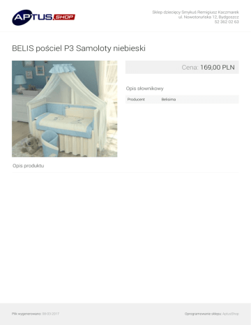 Sklep dziecięcy Smykuś Remigiusz Kaczmarek ul. Nowotoruńska 12, Bydgoszcz 52 362 02 63 BELIS pościel P3 Samoloty niebieski Cena: 169,00 PLN Opis słownikowy Producent Belisima Opis produktu Plik wygenerowano: 08-03-2017 Powered by TCPDF (www.tcpdf.org) Oprogramowanie sklepu: AptusShop