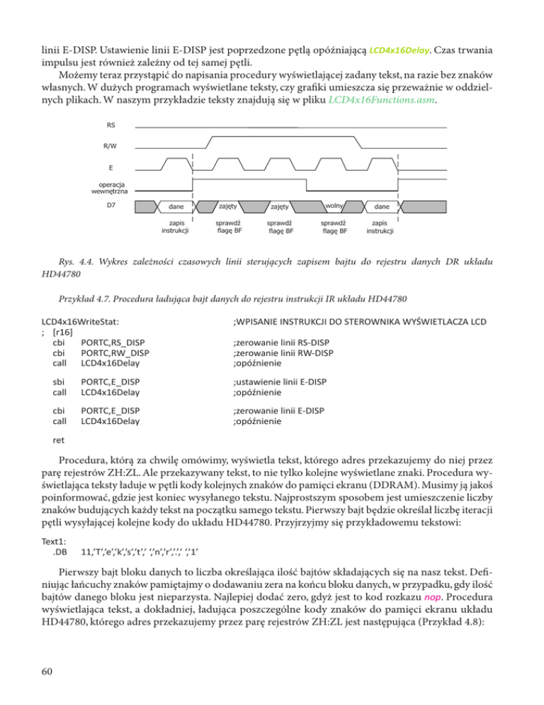 linii E-DISP. Ustawienie linii E-DISP jest poprzedzone pętlą opóźniającą LCD4x16Delay. Czas trwania impulsu jest również zależny od tej samej pętli. Możemy teraz przystąpić do napisania procedury wyświetlającej zadany tekst, na razie bez znaków własnych. W dużych programach wyświetlane teksty, czy grafiki umieszcza się przeważnie w oddzielnych plikach. W naszym przykładzie teksty znajdują się w pliku LCD4x16Functions.asm. RS R/W E operacja wewnętrzna D7 dane zajęty zajęty wolny dane zapis instrukcji sprawdź flagę BF sprawdź flagę BF sprawdź flagę BF zapis instrukcji Rys. 4.4. Wykres zależności czasowych linii sterujących zapisem bajtu do rejestru danych DR układu HD44780 Przykład 4.7. Procedura ładująca bajt danych do rejestru instrukcji IR układu HD44780 LCD4x16WriteStat: ; [r16] cbi PORTC,RS_DISP cbi PORTC,RW_DISP call LCD4x16Delay ;WPISANIE INSTRUKCJI DO STEROWNIKA WYŚWIETLACZA LCD sbi call PORTC,E_DISP LCD4x16Delay ;ustawienie linii E-DISP ;opóźnienie cbi call PORTC,E_DISP LCD4x16Delay ;zerowanie linii E-DISP ;opóźnienie ;zerowanie linii RS-DISP ;zerowanie linii RW-DISP ;opóźnienie ret Procedura, którą za chwilę omówimy, wyświetla tekst, którego adres przekazujemy do niej przez parę rejestrów ZH:ZL. Ale przekazywany tekst, to nie tylko kolejne wyświetlane znaki. Procedura wyświetlająca teksty ładuje w pętli kody kolejnych znaków do pamięci ekranu (DDRAM). Musimy ją jakoś poinformować, gdzie jest koniec wysyłanego tekstu. Najprostszym sposobem jest umieszczenie liczby znaków budujących każdy tekst na początku samego tekstu. Pierwszy bajt będzie określał liczbę iteracji pętli wysyłającej kolejne kody do układu HD44780. Przyjrzyjmy się przykładowemu tekstowi: Text1: .DB 11,’T’,’e’,’k’,’s’,’t’,’ ‘,’n’,’r’,’.’,’ ‘,’1’ Pierwszy bajt bloku danych to liczba określająca ilość bajtów składających się na nasz tekst. Definiując łańcuchy znaków pamiętajmy o dodawaniu zera na końcu bloku danych, w przypadku, gdy ilość bajtów danego bloku jest nieparzysta. Najlepiej dodać zero, gdyż jest to kod rozkazu nop. Procedura wyświetlająca tekst, a dokładniej, ładująca poszczególne kody znaków do pamięci ekranu układu HD44780, którego adres przekazujemy przez parę rejestrów ZH:ZL jest następująca (Przykład 4.8): 60