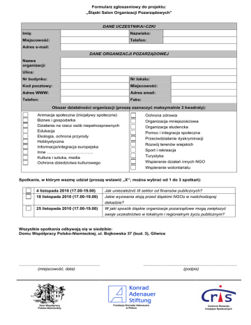 Formularz zgłoszeniowy do projektu: „Śląski Salon Organizacji Pozarządowych” DANE UCZESTNIKA/-CZKI Imię: Nazwisko: Miejscowość: Telefon: Adres e-mail: DANE ORGANIZACJI POZARZĄDOWEJ Nazwa organizacji: Ulica: Nr budynku: Nr lokalu: Kod pocztowy: Miejscowość: Adres WWW: Adres email: Telefon: Faks: Obszar działalności organizacji (proszę zaznaczyć maksymalnie 3 kwadraty): Animacja społeczna (inicjatywy społeczne) Biznes i gospodarka Działania na rzecz osób niepełnosprawnych Edukacja Ekologia, ochrona przyrody Hobbystyczna Informacja/integracja europejska Inne …………………………… Kultura i sztuka, media Ochrona dziedzictwa kulturowego Ochrona zdrowia Organizacja mniejszościowa Organizacja studencka Pomoc i integracja społeczna Przeciwdziałanie dyskryminacji Rozwój terenów wiejskich Sport i rekreacja Turystyka Wspieranie działań innych NGO Wspieranie wolontariatu Spotkanie, w którym wezmę udział (proszę wstawić „X”; można wybrać od 1 do 3 spotkań): 4 listopada 2010 (17.00-19.00) Jak uniezależnić III sektor od finansów publicznych? 18 listopada 2010 (17.00-19.00) Jakie wyzwania stoją przed śląskimi NGOs w nadchodzącej dekadzie? 25 listopada 2010 (17.00-19.00) W jaki sposób śląskie organizacje pozarządowe mogą zwiększyć swoje uczestnictwo w lokalnym i regionalnym życiu publicznym? Wszystkie spotkania odbywają się w siedzibie: Domu Współpracy Polsko-Niemieckiej, ul. Bojkowska 37 (bud. 3), Gliwice ..................................................................... (miejscowość, data) Dom Współpracy Polsko-Niemieckiej ................................................................................ (podpis) Fundacja Konrada Adenauera w Polsce Centrum Rozwoju Inicjatyw Społecznych