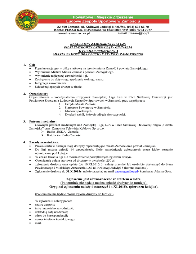 REGULAMIN ZAMOJSKIEJ LIGI LZS PIŁKI SIATKOWEJ DZIEWCZĄT - GIMNAZJA O PUCHAR PREZYDENTA MIASTA ZAMOŚĆ ORAZ PUCHAR STAROSY ZAMOJSKIEGO 1. Cel: Popularyzacja gry w piłkę siatkową na terenie miasta Zamość i powiatu Zamojskiego. Wyłonienie Mistrza Miasta Zamość i powiatu Zamojskiego. Wyłonienie najlepszej zawodniczki ligi. Zachęcenie do aktywnego spędzenie wolnego czasu. Integracja zawodniczek. Udział najlepszych drużyn w finale. 2. Organizator: Organizatorem – koordynatorem rozgrywek Zamojskiej Ligi LZS w Piłce Siatkowej Dziewcząt jest Powiatowe Zrzeszenie Ludowych Zespołów Sportowych w Zamościu przy współpracy: 1. Urzędu Miasta Zamość; 2. Starostwo Powiatowe w Zamościu; 3. Klubów sportowych; 4. Dyrekcji szkół, których odbędą się rozgrywki. 3. Patronat medialny: Głównym patronat medialnym nad Zamojską Ligą LZS w Piłce Siatkowej Dziewcząt objęła „Gazeta Zamojska” oraz Zamojska Telewizja Kablowa Sp. z o.o. Radio „ESKA” Zamość. Katolickie Radio Zamość. 4. Zasady uczestnictwa: Prawo startu w turnieju mają drużyny reprezentujące miasto Zamość oraz powiat Zamojski. Do ligi można zgłosić 14 zawodniczek. Ilość zawodniczek zgłoszonych przez kluby zostanie odnotowane po I kolejce. W czasie trwania ligi nie można zmienić początkowych zgłoszeń drużyn. Obowiązuje opłata startowa od drużyny w wysokości 250 zł. zgłoszenie drużyny oraz opłatę (do 10.XI.2015r.) należy przesłać lub osobiście dostarczyć do biura Powiatowego i Miejskiego Zrzeszenia LZS ul. Królowej Jadwigi 8 (korona stadionu). Zgłoszenie drużyny do 31.X.2015r. należy przesłać na mail [email protected] komisarza Adama Gaca. Zgłoszenie jest równoznaczne ze startem w lidze. (Po terminie nie będzie można zgłosić drużyny do turnieju). Oryginał zgłoszenia należy dostarczyć 14.XI.2015r. (pierwsza kolejka). (Po terminie nie będzie można zgłosić drużyny do turnieju) W zgłoszeniu należy podać: nazwę zespołu; imię i nazwisko zawodniczki; dokładną datę urodzenia; adres do korespondencji; numer telefonu kontaktowego. mail. Odpowiedzialni za ligę: Komisarz ligi: - Adam Gaca tel. 606 703 349 V-ce Przewodniczący Rady Powiatowej i Miejskiej LZS w Zamościu: - Krzysztof Pszenniak tel. 667 711 117 5. System rozgrywek. liga rozgrywana będzie systemem „każdy z każdym” z finałem przy 10 drużynach; mecze sędziują sędziowie zgodnie z przepisami PZPS. 6. Zasady klasyfikacji: Ocena wyników we wszystkich spotkaniach jest następująca: za wygrany mecz 2-0 zespół otrzymuje 3 (trzy) punkty, za wygrany mecz 2-1 zespół otrzymuje 2 (dwa) punkt, za mecz przegrany 1-2 zespół otrzymuje 1 (jeden) punktów, za mecz przegrany 0-2 zespół otrzymuje 0 (zero) punktów, za mecz oddany walkowerem zespołowi zostanie odjęty 1 (jeden) punkt. Zespół, który odda w rozgrywkach 3 (trzy) walkowery zostaje automatycznie wycofany z rozgrywek. O kolejności miejsc w tabeli rozgrywek decydują zdobyte duże punkty. Zespół, który zdobył większą ilość punktów zajmuje wyższe miejsce w tabeli rozgrywek. W przypadku uzyskania przez dwa lub więcej zespołów równej ilości dużych punktów o kolejności miejsc w tabeli rozgrywek decydują kolejno: stosunek pomiędzy ogólną liczbą zdobytych i straconych setów we wszystkich rozegranych spotkaniach, stosunek pomiędzy ogólną liczbą zdobytych i straconych małych punktów we wszystkich rozegranych setach w spotkaniach, wynik bezpośredniego spotkania. Za korzystniejszy uznawany jest zawsze ten ze stosunków, który jest liczbowo większy. 7. Nagrody: Trzy pierwsze drużyny otrzymają okolicznościowe medale. Za miejsca I-VI w finale zostaną wręczone puchary, medale oraz nagrody rzeczowe. Wszystkie zespoły otrzymają pamiątkowe dyplomy. Nagrodzony będzie również Najlepsza Zawodniczka Zamojskiej Ligi Siatkówki Kobiet, oraz najmłodsza i najstarsza zawodniczka ligi. 8. Inne postanowienia: każda zawodniczka jest zobowiązana do zapoznania się z regulaminem; każdy zespół musi posiadać strój sportowy oraz zmienione obuwie; osoby przebywające na hali sportowej mają obowiązek zmiany obuwia na sportowy; do rozgrzewki drużyny muszą posiadać własne piłki; zawodniczki przygotowują się do spotkań poza wydzielonymi boiskami; przed meczem drużyna ma prawo do 10 minutowej rozgrzewki na boisku; za rzeczy zgubione podczas zawodów organizator nie odpowiada; organizatorzy zastrzegają sobie prawo do dokonywania zmian oraz ostatecznej interpretacji regulaminu i zasad gry; organizator zastrzega sobie prawo interpretacji wszystkich kwestii spornych; rozgrywki Zamojskiej Ligi LZS w Piłce Siatkowej są ubezpieczone. Serdecznie Zapraszamy Organizatorzy