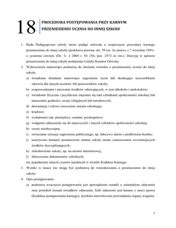 18 PROCEDURA POSTĘPOWANIA PRZY KARNYM PRZENIESIENIU UCZNIA DO INNEJ SZKOŁY 1. Rada Pedagogiczna szkoły może podjąć uchwałę o rozpoczęcie procedury karnego przeniesienia do innej szkoły (podstawa prawna: art. 39 ust. 2a ustawy z 7 września 1991r. o systemie oświaty (Dz. U. z 2004 r. Nr 256, poz. 2572 ze zm.). Decyzję w sprawie przeniesienia do innej szkoły podejmuje Łódzki Kurator Oświaty. 2. Wykroczenia stanowiące podstawę do złożenia wniosku o przeniesienie ucznia do innej szkoły: a) świadome działanie stanowiące zagrożenie życia lub skutkujące uszczerbkiem zdrowia dla innych uczniów lub pracowników szkoły; b) rozprowadzanie i używanie środków odurzających, w tym alkoholu i narkotyków; c) świadome fizyczne i psychiczne znęcanie się nad członkami społeczności szkolnej lub naruszanie godności, uczuć religijnych lub narodowych; d) dewastacja i celowe niszczenie mienia szkolnego; e) kradzież; f) wyłudzanie (np. pieniędzy), szantaż, przekupstwo; g) wulgarne odnoszenie się do nauczycieli i innych członków społeczności szkolnej; h) czyny nieobyczajne; i) stwarzanie sytuacji zagrożenia publicznego, np. fałszywy alarm o podłożeniu bomby; j) notoryczne łamanie postanowień statutu szkoły mimo zastosowania wcześniejszych środków dyscyplinujących; k) zniesławienie szkoły, np. na stronie internetowej; l) fałszowanie dokumentów szkolnych; m) popełnienie innych czynów karalnych w świetle Kodeksu Karnego. 3. Wyniki w nauce nie mogą być podstawą do wnioskowania o przeniesienie do innej szkoły. 4. Opis postępowania: a) podstawą wszczęcia postępowania jest sporządzenie notatki o zaistniałym zdarzeniu oraz protokół zeznań świadków zdarzenia. Jeśli zdarzenie jest karane z mocy prawa (Kodeksu postępowania karnego), dyrektor niezwłocznie powiadamia organy ścigania. 1 b) dyrektor szkoły, po otrzymaniu informacji i kwalifikacji danego czynu, zwołuje posiedzenie rady pedagogicznej. c) uczeń ma prawo wskazać swoich rzeczników obrony. Rzecznikami ucznia mogą być wychowawca klasy, szkolny pedagog, rzecznik praw ucznia. Uczeń może się również zwrócić o opinię do samorządu uczniowskiego. d) wychowawca ma obowiązek przedstawić radzie pedagogicznej pełną analizę postępowania ucznia jako członka społeczności szkolnej. Podczas przedstawiania analizy, wychowawca klasy zobowiązany jest zachować obiektywność. Wychowawca klasy informuje radę pedagogiczną o zastosowanych dotychczas środkach wychowawczych i dyscyplinujących, zastosowanych karach, rozmowach ostrzegawczych, ewentualnej pomocy psychologiczno-pedagogicznej itp. e) rada pedagogiczna w głosowaniu tajnym, po wnikliwym wysłuchaniu stron, podejmuje uchwałę dotyczącą danej sprawy. rada pedagogiczna powierza wykonanie uchwały dyrektorowi szkoły. f) dyrektor szkoły informuje samorząd uczniowski o decyzji rady pedagogicznej celem uzyskania opinii. Brak opinii samorządu w terminie 7 dni od zawiadomienia nie wstrzymuje wykonania uchwały rady pedagogicznej. g) dyrektor kieruje sprawę do Łódzkiego Kuratora Oświaty. h) decyzję o przeniesieniu ucznia odbierają i podpisują rodzice lub prawni opiekunowie. i) uczniowi przysługuje prawo do odwołania się od decyzji do organu wskazanego w pouczeniu zawartym w decyzji w terminie 14 dni od jej doręczenia. j) w trakcie całego postępowania odwoławczego uczeń ma prawo uczęszczać na zajęcia do czasu otrzymania ostatecznej decyzji, chyba że decyzji tej nadano rygor natychmiastowej wykonalności. Rygor natychmiastowej wykonalności obowiązuje w sytuacjach wynikających z art. 108 Kodeksu postępowania administracyjnego. 2