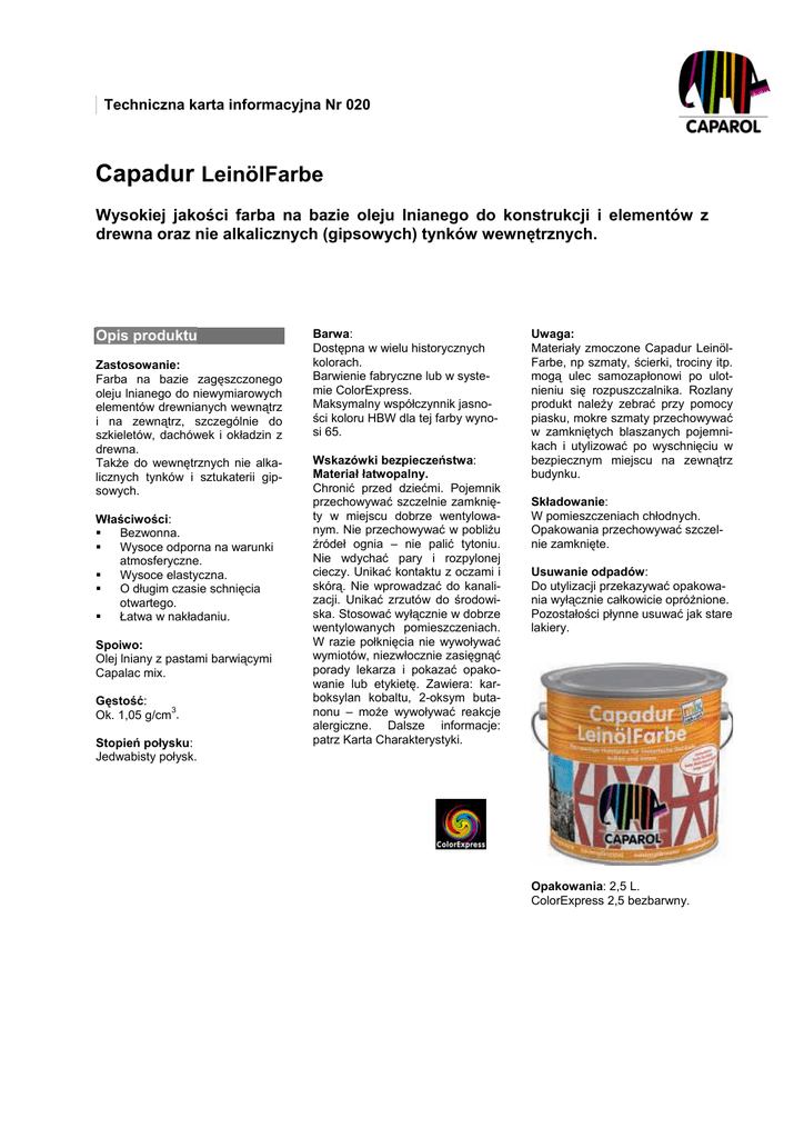 Techniczna karta informacyjna Nr 020 Capadur LeinölFarbe Wysokiej jakości farba na bazie oleju lnianego do konstrukcji i elementów z drewna oraz nie alkalicznych (gipsowych) tynków wewnętrznych. Opis produktu Zastosowanie: Farba na bazie zagęszczonego oleju lnianego do niewymiarowych elementów drewnianych wewnątrz i na zewnątrz, szczególnie do szkieletów, dachówek i okładzin z drewna. Także do wewnętrznych nie alkalicznych tynków i sztukaterii gipsowych. Właściwości: Bezwonna. Wysoce odporna na warunki atmosferyczne. Wysoce elastyczna. O długim czasie schnięcia otwartego. Łatwa w nakładaniu. Spoiwo: Olej lniany z pastami barwiącymi Capalac mix. Gęstość: 3 Ok. 1,05 g/cm . Stopień połysku: Jedwabisty połysk. Barwa: Dostępna w wielu historycznych kolorach. Barwienie fabryczne lub w systemie ColorExpress. Maksymalny współczynnik jasności koloru HBW dla tej farby wynosi 65. Wskazówki bezpieczeństwa: Materiał łatwopalny. Chronić przed dziećmi. Pojemnik przechowywać szczelnie zamknięty w miejscu dobrze wentylowanym. Nie przechowywać w pobliżu źródeł ognia – nie palić tytoniu. Nie wdychać pary i rozpylonej cieczy. Unikać kontaktu z oczami i skórą. Nie wprowadzać do kanalizacji. Unikać zrzutów do środowiska. Stosować wyłącznie w dobrze wentylowanych pomieszczeniach. W razie połknięcia nie wywoływać wymiotów, niezwłocznie zasięgnąć porady lekarza i pokazać opakowanie lub etykietę. Zawiera: karboksylan kobaltu, 2-oksym butanonu – może wywoływać reakcje alergiczne. Dalsze informacje: patrz Karta Charakterystyki. Uwaga: Materiały zmoczone Capadur LeinölFarbe, np szmaty, ścierki, trociny itp. mogą ulec samozapłonowi po ulotnieniu się rozpuszczalnika. Rozlany produkt należy zebrać przy pomocy piasku, mokre szmaty przechowywać w zamkniętych blaszanych pojemnikach i utylizować po wyschnięciu w bezpiecznym miejscu na zewnątrz budynku. Składowanie: W pomieszczeniach chłodnych. Opakowania przechowywać szczelnie zamknięte. Usuwanie odpadów: Do utylizacji przekazywać opakowania wyłącznie całkowicie opróżnione. Pozostałości płynne usuwać jak stare lakiery. Opakowania: 2,5 L. ColorExpress 2,5 bezbarwny. Sposób użycia Odpowiednie podłoża: Niewymiarowe elementy drewniane takie jak fasady drewniane, dachówki, szkielety drewniane. Nie alkaliczne tynki grupy PIV / PV (gipsowe / wapienno-gipsowe) i sztukaterie wewnątrz. Podłoże musi być czyste, nośne, suche i wolne od substancji mogących utrudniać przyczepność. Wilgotność drewna nie może przekraczać średnio 12% dla drewna liściastego i 15% dla drewna iglastego. Przygotowanie podłoża: - nowe elementy drewniane Gładkie powierzchnie drewniane przeszlifować zgodnie z kierunkiem włókien, oczyścić, usunąć wychodzące składniki drewna np. żywice, itp. Złagodzić ostre krawędzie. - stare, nie powlekane elementy drewniane Zszarzałe, zniszczone warstwy wierzchnie zeszlifować aż do zdrowej, nośnej warstwy drewna. Dokładnie oczyścić. Złagodzić ostre krawędzie. - tynki / sztukaterie Pylące, piaszczące i/lub kredujące powierzchnie gruntować środkiem CaparolPutzfestiger. - stare powłoki Całkowicie usunąć. Nakładanie: Dokładnie rozmieszać przed użyciem. Farbę Capadur LeinölFarbe nakładać wzdłuż włókien i dobrze rozprowadzić. Farbę nakładać cienką warstwą i zbierać nadmiar, inaczej mogą pojawić się plamy. W razie konieczności rozcieńczyć środkiem Caparol AF-Verdünner. Średnie zużycie na 2 warstwy: 2 Ok. 100 – 120 ml/m na gładkiej powierzchni. Podane wartości są wartościami orientacyjnymi mogącymi się różnić zależnie od podłoża i jego chłonności. Dokładne wartości ustalić można wyłącznie w praktyce poprzez wymalowanie próbne. Czyszczenie narzędzi: Po użyciu narzędzia czyścić benzyną lakową. Doradztwo techniczne W wypadku pytań lub wątpliwości prosimy o kontakt z naszym Działem Technicznym. Chętnie udzielimy Państwu szczegółowych informacji związanych z konkretnym zastosowaniem. Tel. (22) 544 20 40 Fax (22) 544 20 41 [email protected] Temperatura obróbki: +10°C minimalna temperatura podłoża, otoczenia i materiału. Czas schnięcia: Czas schnięcia produktów na bazie oleju lnianego jest dłuższy w porównaniu z produktami na bazie żywic sztucznych. W temp. +20°C i względnej wilgotności powietrza 65% warstwa nadaje się do powtórnego malowania po 24 godz. W niższych temperaturach i przy wyższej wilgotności powietrza czas ten ulega wydłużeniu. W czasie wysychania powłoki końcowej, co w zależności od warunków obiektowych może trwać do 4 tygodni, należy chronić wysychającą powierzchnię przed uszkodzeniami mechanicznymi. Układ warstw: Podłoże Zastosowanie Przygotowanie podłoża Drewno nie powlekane wewnątrz przeszlifować Capadur LeinölFarbe baza transparentna* zewnątrz przeszlifować Capalac HolzImprägniergrund Stare nośne powłoki z lakierów alkidowych lub olejnych. wewnątrz / zewnątrz Stare powłoki z farb dysperwewnątrz syjnych przeszlifować / wyługować Stare powłoki usunąć, powierzchnię oczyścić Stare powłoki usunąć, powierzchnię oczyścić Stare powłoki usunąć, powierzchnię oczyścić Impregnacja - Gruntowanie Warstwa wierzchnia Capadur LeinölFarbe Capadur LeinölFarbe Capadur LeinölFarbe baza transparentna* Capalac zewnątrz HolzImprägniergrund Nie alkaliczne Capadur Tynki / sztukaterie wewnątrz LeinölFarbe baza transparentna* * W zależności od chłonności podłoża rozcieńczyć dodając 30 – 50 % rozcieńczalnika Caparol AF-Verdünner. Techniczna karta informacyjna Nr 020. Stan: luty 2006 Niniejsza karta informacyjna została sporządzona na bazie najnowszych osiągnięć techniki i naszych doświadczeń. Ze względu na różnorodność możliwych podłoży i warunków wykonawstwa każdorazowy Kupujący / Użytkownik jest zobowiązany sprawdzić na własną odpowiedzialność przydatność nasz