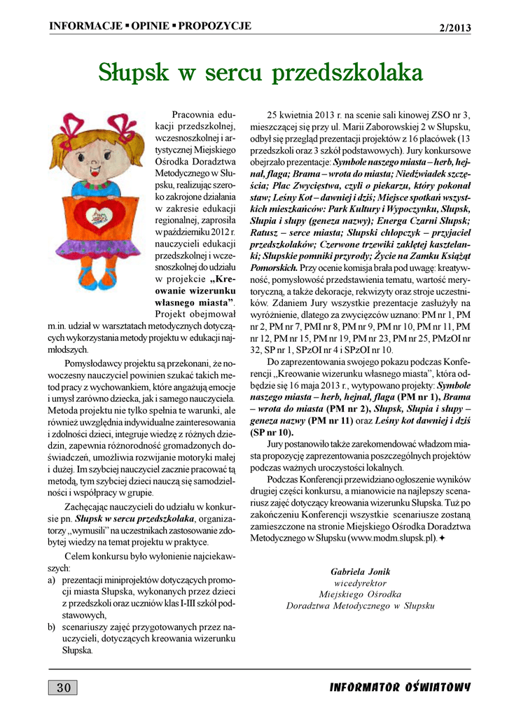 INFORMACJE § OPINIE § PROPOZYCJE 2/2013 S³upsk w sercu przedszkolaka Pracownia edukacji przedszkolnej, wczesnoszkolnej i artystycznej Miejskiego Orodka Doradztwa Metodycznego w S³upsku, realizuj¹c szeroko zakrojone dzia³ania w zakresie edukacji regionalnej, zaprosi³a w padzierniku 2012 r. nauczycieli edukacji przedszkolnej i wczesnoszkolnej do udzia³u w projekcie Kreowanie wizerunku w³asnego miasta. Projekt obejmowa³ m.in. udzia³ w warsztatach metodycznych dotycz¹cych wykorzystania metody projektu w edukacji najm³odszych. Pomys³odawcy projektu s¹ przekonani, ¿e nowoczesny nauczyciel powinien szukaæ takich metod pracy z wychowankiem, które anga¿uj¹ emocje i umys³ zarówno dziecka, jak i samego nauczyciela. Metoda projektu nie tylko spe³nia te warunki, ale równie¿ uwzglêdnia indywidualne zainteresowania i zdolnoci dzieci, integruje wiedzê z ró¿nych dziedzin, zapewnia ró¿norodnoæ gromadzonych dowiadczeñ, umo¿liwia rozwijanie motoryki ma³ej i du¿ej. Im szybciej nauczyciel zacznie pracowaæ t¹ metod¹, tym szybciej dzieci naucz¹ siê samodzielnoci i wspó³pracy w grupie. Zachêcaj¹c nauczycieli do udzia³u w konkursie pn. S³upsk w sercu przedszkolaka, organizatorzy wymusili na uczestnikach zastosowanie zdobytej wiedzy na temat projektu w praktyce. Celem konkursu by³o wy³onienie najciekawszych: a) prezentacji miniprojektów dotycz¹cych promocji miasta S³upska, wykonanych przez dzieci z przedszkoli oraz uczniów klas I-III szkó³ podstawowych, b) scenariuszy zajêæ przygotowanych przez nauczycieli, dotycz¹cych kreowania wizerunku S³upska. 30 25 kwietnia 2013 r. na scenie sali kinowej ZSO nr 3, mieszcz¹cej siê przy ul. Marii Zaborowskiej 2 w S³upsku, odby³ siê przegl¹d prezentacji projektów z 16 placówek (13 przedszkoli oraz 3 szkó³ podstawowych). Jury konkursowe obejrza³o prezentacje: Symbole naszego miasta herb, hejna³, flaga; Brama wrota do miasta; Niedwiadek szczêcia; Plac Zwyciêstwa, czyli o piekarzu, który pokona³ staw; Leny Kot dawniej i dzi; Miejsce spotkañ wszystkich mieszkañców: Park Kultury i Wypoczynku, S³upsk, S³upia i s³upy (geneza nazwy); Energa Czarni S³upsk; Ratusz serce miasta; S³upski ch³opczyk przyjaciel przedszkolaków; Czerwone trzewiki zaklêtej kasztelanki; S³upskie pomniki przyrody; ¯ycie na Zamku Ksi¹¿¹t Pomorskich. Przy ocenie komisja bra³a pod uwagê: kreatywnoæ, pomys³owoæ przedstawienia tematu, wartoæ merytoryczn¹, a tak¿e dekoracje, rekwizyty oraz stroje uczestników. Zdaniem Jury wszystkie prezentacje zas³u¿y³y na wyró¿nienie, dlatego za zwyciêzców uznano: PM nr 1, PM nr 2, PM nr 7, PMI nr 8, PM nr 9, PM nr 10, PM nr 11, PM nr 12, PM nr 15, PM nr 19, PM nr 23, PM nr 25, PMzOI nr 32, SP nr 1, SPzOI nr 4 i SPzOI nr 10. Do zaprezentowania swojego pokazu podczas Konferencji Kreowanie wizerunku w³asnego miasta, która odbêdzie siê 16 maja 2013 r., wytypowano projekty: Symbole naszego miasta herb, hejna³, flaga (PM nr 1), Brama wrota do miasta (PM nr 2), S³upsk, S³upia i s³upy geneza nazwy (PM nr 11) oraz Leny kot dawniej i dzi (SP nr 10). Jury postanowi³o tak¿e zarekomendowaæ w³adzom miasta propozycjê zaprezentowania poszczególnych projektów podczas wa¿nych uroczystoci lokalnych. Podczas Konferencji przewidziano og³oszenie wyników drugiej czêci konkursu, a mianowicie na najlepszy scenariusz zajêæ dotycz¹cy kreowania wizerunku S³upska. Tu¿ po zakoñczeniu Konferencji wszystkie scenariusze zostan¹ zamieszczone na stronie Miejskiego Orodka Doradztwa Metodycznego w S³upsku (www.modm.slupsk.pl).ö Gabriela Jonik wicedyrektor Miejskiego Orodka Doradztwa Metodycznego w S³upsku INFORMATOR OSWIATOWY