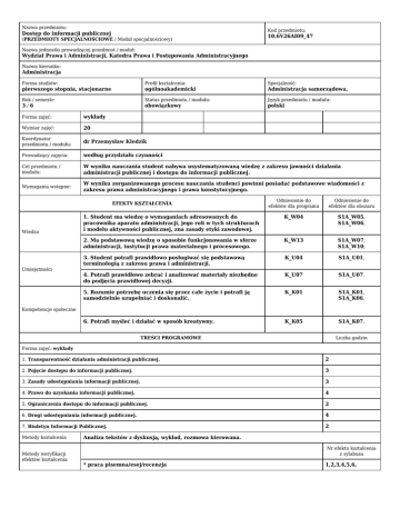 Nazwa przedmiotu: Kod przedmiotu: Dostęp do informacji publicznej (PRZEDMIOTY SPECJALNOŚCIOWE / Moduł specjalnościowy) 10.6V26AI09_47 Nazwa jednostki prowadzącej przedmiot / moduł: Wydział Prawa i Administracji, Katedra Prawa i Postępowania Administracyjnego Nazwa kierunku: Administracja Forma studiów: Profil kształcenia: Specjalność: pierwszego stopnia, stacjonarne ogólnoakademicki Administracja samorządowa, Rok / semestr: 3/6 Status przedmiotu / modułu: Język przedmiotu / modułu: obowiązkowy polski Forma zajęć: wykłady Wymiar zajęć: 20 Koordynator przedmiotu / modułu: dr Przemysław Kledzik Prowadzący zajęcia: według przydziału czynności Cel przedmiotu / modułu: W wyniku nauczania student nabywa usystematyzowaną wiedzę z zakresu jawności działania administracji publicznej i dostępu do informacji publicznej. Wymagania wstępne: W wyniku zorganizowanego procesu nauczania studenci powinni posiadać podstawowe wiadomości z zakresu prawa administracyjnego i prawa konstytucyjnego. Odniesienie do efektów dla programu Odniesienie do efektów dla obszaru 1. Student ma wiedzę o wymaganiach adresowanych do pracownika aparatu administracji, jego roli w tych strukturach i modelu aktywności publicznej, zna zasady etyki zawodowej. K_W04 S1A_W05, S1A_W06, 2. Ma podstawową wiedzę o sposobie funkcjonowania w sferze administracji, instytucji prawa materialnego i procesowego. K_W13 S1A_W07, S1A_W10, 3. Student potrafi prawidłowo posługiwać się podstawową terminologią z zakresu prawa i administracji. K_U04 S1A_U01, 4. Potrafi prawidłowo zebrać i analizować materiały niezbędne do podjęcia prawidłowej decyzji. K_U07 S1A_U07, 5. Rozumie potrzebę uczenia się przez całe życie i potrafi ją samodzielnie uzupełniać i doskonalić. K_K01 S1A_K01, S1A_K06, 6. Potrafi myśleć i działać w sposób kreatywny. K_K05 S1A_K07, EFEKTY KSZTAŁCENIA Wiedza Umiejętności Kompetencje społeczne TREŚCI PROGRAMOWE Liczba godzin Forma zajęć: wykłady 1. Transparentność działania administracji publicznej. 2 2. Pojęcie dostępu do informacji publicznej. 3 3. Zasady udostępniania informacji publicznej. 3 4. Prawo do uzyskania informacji publicznej. 4 5. Ograniczenia dostępu do informacji publicznej. 2 6. Drogi udostępniania informacji publicznej. 4 7. Biuletyn Informacji Publicznej. 2 Metody kształcenia Metody weryfikacji efektów kształcenia Analiza tekstów z dyskusją, wykład, rozmowa kierowana. Nr efektu kształcenia z sylabusa * praca pisemna/esej/recenzja 1,2,3,4,5,6, Forma i warunki zaliczenia Zaliczenie z oceną. Pisemna praca zaliczeniowa, ocena z pracy jest oceną końcową. Warunki zaliczenia: każde pytanie oceniane jest oddzielnie, za każde pytanie można otrzymać od 0 pkt do 1 pkt. Stosownie do liczby pytań oraz uzyskanej na podstawie udzielonych odpowiedzi sumy punktów warunki otrzymania poszczególnych ocen końcowych przedstawiają się następująco: - ocena dostateczna - od 50% maksymalnej liczby punktów, - ocena dostateczna plus - od 65% maksymalnej liczby punktów, - ocena dobra - od 75% maksymalnej liczby punktów, - ocena dobra plus - od 85% maksymalnej liczby punktów, - ocena bardzo dobra - od 90% maksymalnej liczby punktów. Literatura podstawowa Kamińska I., Rozbicka – Ostrowska M. (2012): Ustawa o dostępie do informacji publicznej. Komentarz. LexisNexis Bidziński M., Chmaj M., Szustakiewicz P. (2010): Ustawa o dostępie do informacji publicznej. Komentarz. C.H. BECK Literatura uzupełniająca Zaremba M. (2009): Prawo dostępu do informacji publicznej. Zagadnienia praktyczne. Difin Aleksandrowicz T. (2008): Komentarz do ustawy o dostępie do informacji publicznej. LexisNexis NAKŁAD PRACY STUDENTA: Liczba godzin Zajęcia dydaktyczne 20 Udział w konsultacjach 6 Zdawanie egzaminu lub/i zaliczenia 1 Studiowanie literatury 10 Przygotowanie projektu / eseju / itp. 5 Przygotowanie się do egzaminu lub/i zaliczenia 8 ŁĄCZNY nakład pracy studenta w godz. 50 Liczba punktów ECTS 2