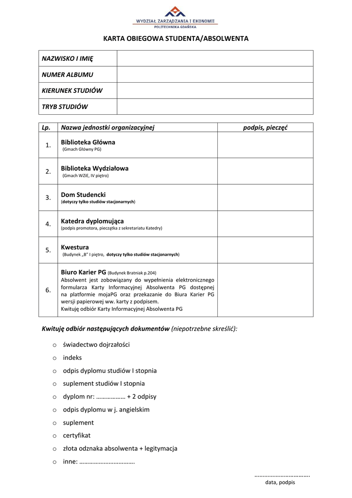 KARTA OBIEGOWA STUDENTA/ABSOLWENTA NAZWISKO I IMIĘ NUMER ALBUMU KIERUNEK STUDIÓW TRYB STUDIÓW Lp. Nazwa jednostki organizacyjnej 1. Biblioteka Główna 2. Biblioteka Wydziałowa 3. Dom Studencki 4. Katedra dyplomująca 5. Kwestura podpis, pieczęć (Gmach Główny PG) (Gmach WZiE, IV piętro) (dotyczy tylko studiów stacjonarnych) (podpis promotora, pieczątka z sekretariatu Katedry) (Budynek „B” I piętro, dotyczy tylko studiów stacjonarnych) Biuro Karier PG (Budynek Bratniak p.204) 6. Absolwent jest zobowiązany do wypełnienia elektronicznego formularza Karty Informacyjnej Absolwenta PG dostępnej na platformie mojaPG oraz przekazanie do Biura Karier PG wersji papierowej ww. karty z podpisem. Kwituję odbiór Karty Informacyjnej Absolwenta PG Kwituję odbiór następujących dokumentów (niepotrzebne skreślić): o świadectwo dojrzałości o indeks o odpis dyplomu studiów I stopnia o suplement studiów I stopnia o dyplom nr: ……………… + 2 odpisy o odpis dyplomu w j. angielskim o suplement o certyfikat o złota odznaka absolwenta + legitymacja o inne: ……………………………. ……………………………. data, podpis