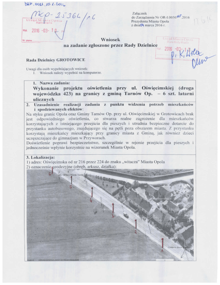 Zalacznik doZarzadzenia NrOR-1.0050 4 "^^ Prezydenta Miasta Opola z dniaQ^ marca 2016 r. Wniosek na zadanie zgloszone przez Rady Dzielnice * 2016 -03-J.i Rada Dzielnicy GROTOWICE Uwagi dla osob wypebiiajqcych wniosek: I . Wniosek nalezy wypelnic na komputerze. 1. \ a / « a zadania: Wykonanie projektu oswietlenia przy ul. Oswi^cimskiej (droga wojewodzka 423) na granicy z » m i n a Tarnow Op. - 6 szt. latarni ulicznych __^_ 2. Uzasadnienie realizacji zadania z punktu widzenia potrzeb mieszkarico\ i spodziewanych efektow: Na styku granic Opola oraz Gminy Tarnow Op. przy ul. Oswi^cimskiej w Grotowicach brak jest odpowiedniego oswietlenia, co stwarza realne zagrozenie dla mieszkancow korzystaja^cych z istnieja_cego przejscia dla pieszych i utrudnia bczpieczne dotarcie do przystanku autobusowego, znajduj^cego si^ na p^tli poza obszarem miasta. Z przystanku korzystaja^ mieszkahcy mieszkaja^cy przy granicy miasta z Gmina^, jak rowniez dzieci ucz?szczaja_ce do gimnazjum w Przyworach. Doswietlenie poprawi bezpieczehstwo, szczegolnie w rejonie przejscia dla pieszych i jednoczesnie wplynie korzystnie na wizerunek Miasta Opola. 3. Lokalizacja: 1) adres: Oswi^cimska od nr 216 przez 224 do znaku ,,witacza" Miasta Opola 2) oznaczenieigeodezyjne (obr^b, arkusz, dzialka): 4. Informacje dotycz^ce wlasnosci gruntu/obicktu: 1) wlascicicl: Gmina Tarnow Opolski 2) zarza^dca: Zarzqd Drog Wojewodzkich 5. Wartosc szacunkowa kosztow zadania (brutto): 5.000,00 6. Opinia (uzgodnienie) wydzialu merytorycznego: O ^i-E* MOZr ZOXT*\C Kiu ; . /I odarki 'awadzki 7. Podpis: va&tak raewodnicz^cyZfDzielnicy GI podpis Przewodnicz^cego Zarz^du 8. Potvvierdzenie zlozenia wniosku: