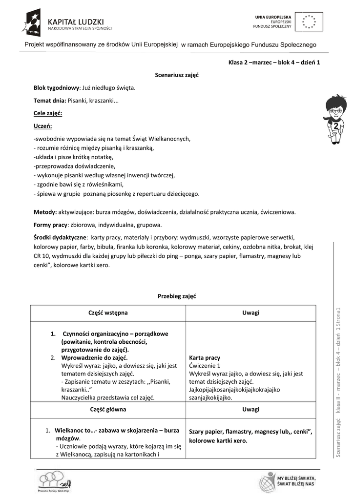 Klasa 2 –marzec – blok 4 – dzień 1 Scenariusz zajęć Blok tygodniowy: Już niedługo święta. Temat dnia: Pisanki, kraszanki... Cele zajęć: Uczeń: -swobodnie wypowiada się na temat Świąt Wielkanocnych, - rozumie różnicę między pisanką i kraszanką, -układa i pisze krótką notatkę, -przeprowadza doświadczenie, - wykonuje pisanki według własnej inwencji twórczej, - zgodnie bawi się z rówieśnikami, - śpiewa w grupie poznaną piosenkę z repertuaru dziecięcego. Metody: aktywizujące: burza mózgów, doświadczenia, działalność praktyczna ucznia, ćwiczeniowa. Formy pracy: zbiorowa, indywidualna, grupowa. Środki dydaktyczne: karty pracy, materiały i przybory: wydmuszki, wzorzyste papierowe serwetki, kolorowy papier, farby, bibuła, firanka lub koronka, kolorowy materiał, cekiny, ozdobna nitka, brokat, klej CR 10, wydmuszki dla każdej grupy lub piłeczki do ping – ponga, szary papier, flamastry, magnesy lub cenki”, kolorowe kartki xero. Część wstępna Czynności organizacyjno – porządkowe (powitanie, kontrola obecności, przygotowanie do zajęć). 2. Wprowadzenie do zajęć. Wykreśl wyraz: jajko, a dowiesz się, jaki jest tematem dzisiejszych zajęć. - Zapisanie tematu w zeszytach: ,,Pisanki, kraszanki..” Nauczycielka przedstawia cel zajęć. Uwagi 1. Część główna 1. Wielkanoc to…- zabawa w skojarzenia – burza mózgów. - Uczniowie podają wyrazy, które kojarzą im się z Wielkanocą, zapisują na kartonikach i Karta pracy Ćwiczenie 1 Wykreśl wyraz jajko, a dowiesz się, jaki jest temat dzisiejszych zajęć. Jajkopijajkosanjajkokijajkokrajajko szanjajkokijajko. Uwagi Szary papier, flamastry, magnesy lub,, cenki”, kolorowe kartki xero. Scenariusz zajęć klasa II - marzec – blok 4 – dzień 1 Strona1 Przebieg zajęć 3. Tradycje świąt Wielkanocnych – swobodne wypowiedzi dzieci w oparciu o tekst Liczmanka i własne doświadczenia. - Uczniowie swobodnie wypowiadają się na temat Świąt Wielkanocnych. 4. Zredagowanie i zapisanie krótkiej notatki do zeszytu w oparciu o tekst Liczmanka i doświadczenia dzieci. - Uczniowie w grupach redagują tekst będący odpowiedzią na pytania: -Co jest najważniejszym symbolem Świąt Wielkanocnych?/jajko/ - Za co uważano jajko od najdawniejszych czasów?/za symbol życia/ - Czym było jajko według ludowych wierzeń? / lekarstwem na choroby, chroniło przed pożarem, pomagało zdobyć wybraną pannę, 1 Aleksandra Michałowska - ,,Sto wierszy na każdą okazję” ,Siedmioróg, Wrocław 2010 Scenariusz zajęć klasa II - marzec – blok 4 – dzień 1 Strona2 umieszczają na plakatach/praca w grupach/ - Liderzy grup odczytują skojarzenia. 2. Ciekawostka Liczmanka. Czy wiecie, że.. ,,Święta wielkanocne, to obok Świąt Bożego Narodzenia najważniejsze święta wszystkich chrześcijan. Wielkanoc, to inaczej Uroczystość Zmartwychwstania Pańskiego – święto upamiętniające zmartwychwstanie Jezusa Chrystusa. Wielkim tygodniem nazywamy tydzień pomiędzy Niedzielą Palmową, a Wielkanocą; w tych dniach wspominamy ostatnie dni życia Jezusa. Niedzielę Palmową świętujemy na pamiątkę wjazdu Jezusa na osiołku do Jerozolimy. Ludzie witali Go radośnie, rzucając przed Nim gałązki palmowe. Na tę pamiątkę dziś, w Niedzielę Palmową, w kościele święcimy palmy uplecione z bazi, kwiatów, kłosów i zielonych gałązek. W Wielki Czwartek wspominamy ostatnią wieczerzę, którą Jezus spożywał razem ze swoimi uczniami. W Wielki Piątek przeżywamy śmierć Jezusa na krzyżu. W Wielką Sobotę idziemy do kościoła poświęcić pokarmy, w tym jajka, które są symbolem życia. Modlimy się także przy symbolicznym grobie Jezusa. W Niedzielę Wielkanocną z radością świętujemy Zmartwychwstanie Jezusa Chrystusa.”1 zapewniało urodzaj/. - Zapisują tekst w zeszytach. 6. Różnica między pisanką, a kraszanką – układanie zdań z rozsypanki wyrazowej. - Na kartach pracy podpisują kraszanki i pisanki. - Układają zdania z podanymi wyrazami i zapisują je w zeszycie. 7. Doświadczenie Liczmanka – zatopione jajko. -Czy jajko pływa lepiej w wodzie słonej, czy z kranu? Potrzebne będą: - surowe jajko -sól kuchenna - łyżka - słoik napełniony wodą Sposób postępowania: -Włóż jajko do wody i pozwól mu opaść na dno. -Wsyp łyżką sól do słoika i ostrożnie mieszaj, aż się rozpuści. Co się stanie? W wodzie z kranu jajko opadnie na dno słoika i tam pozostanie. Jeśli jednak rozpuścisz sól w wodzie, jajko uniesie się do góry i będzie pływać na powierzchni. Dlaczego? Jajko ma większą gęstość niż woda z kranu, jest ,,cięższe” i dlatego tonie. Gdy wsypiemy do wody sól, otrzymujemy słoną wodą mającą większą gęstość niż jajko, które pozornie staje się ,,lżejsze” i zaczyna pływać. 8. Zadanko Liczmanka Kasia przez dwa dni ozdabiała po 3 pisanki, a Wojtek przez 3 dni ozdobił po 2 pisanki. Które dziecko ozdobiło więcej pisanek? 9. Sprawdzanie mnożenia za pomocą dzieleniagrafy i tabelki funkcyjne - Wspólne rozwiązywanie zadań. - Uzupełnianie grafów i tabelek funkcyjnych. / zadania typu: Graf przykład 15:3 = kwadracik , bo kwadracik x 3= 15 Tabelka typu: pisanka Pisanka :3 Karta pracy Ćwiczenie 1 Pokoloruj te obrazki, które są związane ze Świętami Wielkanocnymi. Karta pracy Ćwiczenie 2 Ułóż zdania z rozsypanki wyrazowej, a dowiesz się, jaka jest różnica między pisanką, a kraszanką. /Kraszanką nazywamy jajko pomalowane na jeden kolor. Pisanką nazywamy jajko ozdobione wzorkami pisanymi woskiem/. Ćwiczenie 3. Podpisz obrazki. Ćwiczenie 4 Ułóż zdania z wyrazami: kraszanki, pisanki. Scenariusz zajęć klasa II - marzec – blok 4 – dzień 1 Strona3 5. Pomylone święta – karta pracy – Uczniowie kolorują te ilustracje, które są związane ze Świętami Wielkanocnymi. 21 15 9 3 10. Nauka piosenki ,,Pisanki, pisanki”2. ,,Pisanki, pisanki..” słowa K. Różecka Pisanki, pisanki, jajka m