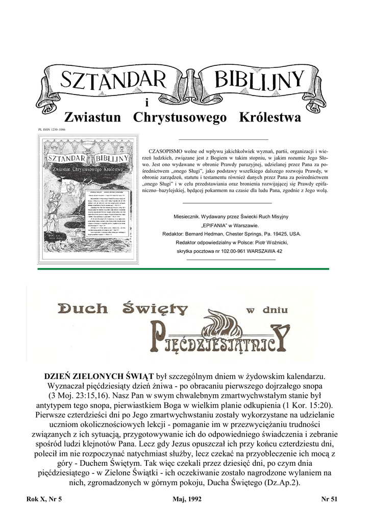 i Zwiastun Chrystusowego Królestwa PL ISSN 1230–1086 CZASOPISMO wolne od wpływu jakichkolwiek wyznań, partii, organizacji i wierzeń ludzkich, zwia˛zane jest z Bogiem w takim stopniu, w jakim rozumie Jego Słowo. Jest ono wydawane w obronie Prawdy paruzyjnej, udzielanej przez Pana za pośrednictwem „onego Sługi”, jako podstawy wszelkiego dalszego rozwoju Prawdy, w obronie zarza˛dzeń, statutu i testamentu również danych przez Pana za pośrednictwem „onego Sługi” i w celu przedstawiania oraz bronienia rozwijaja˛cej sie˛ Prawdy epifaniczno–bazylejskiej, be˛da˛cej pokarmem na czasie dla ludu Pana, zgodnie z Jego wola˛. Miesiecznik. Wydawany przez Świecki Ruch Misyjny „EPIFANIA” w Warszawie. Redaktor: Bernard Hedman, Chester Springs, Pa. 19425, USA. Redaktor odpowiedzialny w Polsce: Piotr Woźnicki, skrytka pocztowa nr 102.00-961 WARSZAWA 42 DZIEŃ ZIELONYCH ŚWIĄT był szczególnym dniem w żydowskim kalendarzu. Wyznaczał pięćdziesiąty dzień żniwa - po obracaniu pierwszego dojrzałego snopa (3 Moj. 23:15,16). Nasz Pan w swym chwalebnym zmartwychwstałym stanie był antytypem tego snopa, pierwiastkiem Boga w wielkim planie odkupienia (1 Kor. 15:20). Pierwsze czterdzieści dni po Jego zmartwychwstaniu zostały wykorzystane na udzielanie uczniom okolicznościowych lekcji - pomaganie im w przezwyciężaniu trudności związanych z ich sytuacją, przygotowywanie ich do odpowiedniego świadczenia i zebranie spośród ludzi klejnotów Pana. Lecz gdy Jezus opuszczał ich przy końcu czterdziestu dni, polecił im nie rozpoczynać natychmiast służby, lecz czekać na przyobleczenie ich mocą z góry - Duchem Świętym. Tak więc czekali przez dziesięć dni, po czym dnia pięćdziesiątego - w Zielone Świątki - ich oczekiwanie zostało nagrodzone wylaniem na nich, zgromadzonych w górnym pokoju, Ducha Świętego (Dz.Ap.2). Rok X, Nr 5 Maj, 1992 Nr 51 34 Sztandar Biblijny Pomimo tego w okresie tych dziesięciu dni załatwili oni jedną sprawę, lecz nie miała ona Pańskiego upoważnienia i nigdy nie została przez Niego zaakceptowana. Dotyczyła rzucenia losów w celu wybrania następcy Judasza (Dz.Ap.1:15-26). Ponieważ losowanie dotyczyło tylko dwóch osób, oczywistym było, że jedna z nich musi być w ten sposób wybrana. Pan jednak nigdy tego nie uznał i nic więcej o Macieju, którego wybrali, nie słyszeliśmy. W odpowiednim czasie Bóg na to miejsce powołał św. Pawła - „w niczym nie podlejszego, niż wielcy Apostołowie” (2 Kor. 11:5). Apostoł ów oznajmia, że gdy nasz Pan wstąpił do nieba, stanął przed obliczem Boga za nami - swym Kościołem, wszystkimi tymi, którzy mieli sprostać wymogom i warunkom uczniostwa (Żyd.9:24). Nie stawił się za światem, lecz jedynie za nami. Umiłował świat, umarł za niego i będzie go jeszcze błogosławił, lecz błogosławienie świata musi zaczekać aż wypełni się najpierw Boski program dotyczący Wybrańców. Nie wiemy ile czasu nasz Pan spędził udając się przed Niebiański Tron i ile z owych dziesięciu dni spędził tam przed daniem Ducha Świętego; ze słów Apostoła wiemy jednak, że Duch Święty zesłany na uczniów oczekujących w górnym pokoju był dla nich dowodem na to, że dzieło Jezusa zadowoliło Ojca, że Ojciec dał Mu tego Ducha Świętego dla Jego Kościoła i że Jezus go „wylał” (Dz.Ap.2:33). Wydarzenia tamtego dnia Zielonych Świąt były bardzo cenne dla ówczesnego Kościoła, lecz od tamtego czasu pozostają równie cenne dla wszystkich członków Ciała Pańskiego. Pismo Święte podaje, że w okresie wysokiego powołania wszyscy przyjmowani do Boskiej rodziny mieli być spładzani z Ducha Świętego; to właśnie spłodzenie w dniu Zielonych Świąt stało się udziałem oczekujących w górnym pokoju. Od tego czasu byli synami Bożymi, a „jeśli dziećmi, tedy i dziedzicami, dziedzicami wprawdzie Bożymi, a współdziedzicami Chrystusowymi” - ich Pana (Rzym.8:17). Podobnie jest z tymi, którzy od zesłania Ducha Świętego wchodzą w Ciało Maj, 1992 Chrystusowe. Nie otrzymywali oni (z wyjątkiem pierwszych pogan, którzy w domu Korneliusza zostali bezpośrednio przyjęci do Ciała Chrystusa - Dz.Ap. 10:44) szczególnych manifestacji Boskiej mocy, takich jak rozdzielone języki, które zstąpiły na uczniów w dniu Zielonych Świąt. Otrzymywali jednak od Boga tego samego Ducha Świętego, którego otrzymali pierwsi uczniowie. Jezus i Jego Kościół pokazani są w obrazie wielkiego Kapłana Jezus jako Głowa tego Kapłana, a Apostołowie jako pierwsi członkowie Ciała, pod zwierzchnictwem Głowy. Wszyscy członkowie Kościoła Chrystusowego od tamtego czasu są poszczególnymi członkami tego samego Ciała, tego samego Kościoła. Duch Święty zstąpił na Jezusa, Głowę Kościoła, w sposób dostrzegalny na zewnątrz po to, by upewnić nas, że został przyjęty przez Ojca. Potem Duch Święty manifestacyjnie zstąpił w dniu Zielonych Świąt na uczniów, by upewnić ich, że zostali przyjęci jako członkowie tego samego Ciała. Podobna zewnętrzna manifestacja miała miejsce przy przyjmowaniu Korneliusza, pierwszego nawróconego poganina. Było to konieczne dlatego, że poganie byli odrzuceni i nie przyjmowani przez Boga nawet jako słudzy; tak więc bez jednoznacznego dowodu Boskiej łaski, wierzącym z Żydów nigdy nie przyszłoby na myśl, że poganie mogliby być przyjęci do takiego samego wysokiego stanu synów Bożych. Lecz od zesłania Ducha Świętego nie ma potrzeby, by każdy członek tego Ciała otrzymywał zewnętrzną manifestację, ponieważ wylanie Boskich błogosławieństw w dniu Zielonych Świąt dotyczyło Kościoła jako całości. W wieku Ewangelii, w miarę jak poszczególne jednostki wchodziły do Kościoła Chrystusowego przez pełne poświęcenie swoich serc dla pełnienia woli Pana i z zupełną ufnością w dzieło Jezusa, otrzymywały tego Ducha i uznawane były za członków Ciała tego Kościoła, choć nie