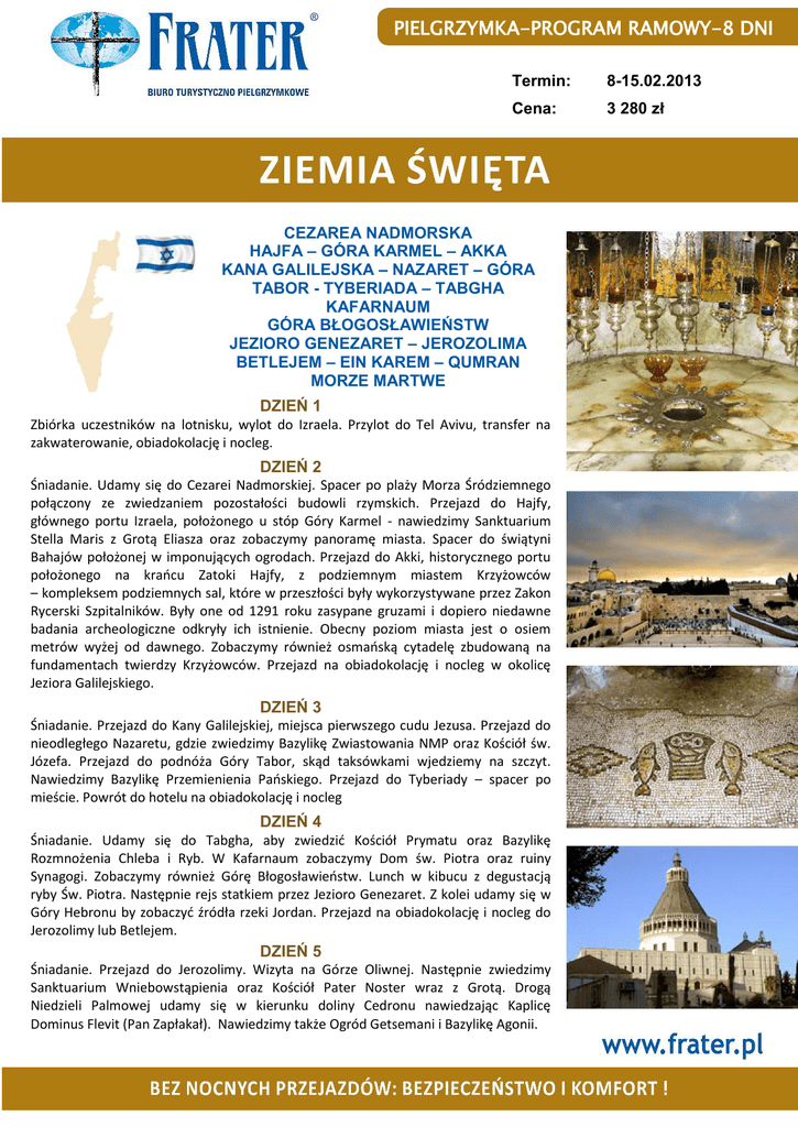 PIELGRZYMKA-PROGRAM RAMOWY-8 DNI Termin: 8-15.02.2013 Cena: 3 280 zł CEZAREA NADMORSKA HAJFA – GÓRA KARMEL – AKKA KANA GALILEJSKA – NAZARET – GÓRA TABOR - TYBERIADA – TABGHA KAFARNAUM GÓRA BŁOGOSŁAWIEŃSTW JEZIORO GENEZARET – JEROZOLIMA BETLEJEM – EIN KAREM – QUMRAN MORZE MARTWE DZIEŃ 1 Zbiórka uczestników na lotnisku, wylot do Izraela. Przylot do Tel Avivu, transfer na zakwaterowanie, obiadokolację i nocleg. DZIEŃ 2 Śniadanie. Udamy się do Cezarei Nadmorskiej. Spacer po plaży Morza Śródziemnego połączony ze zwiedzaniem pozostałości budowli rzymskich. Przejazd do Hajfy, głównego portu Izraela, położonego u stóp Góry Karmel - nawiedzimy Sanktuarium Stella Maris z Grotą Eliasza oraz zobaczymy panoramę miasta. Spacer do świątyni Bahajów położonej w imponujących ogrodach. Przejazd do Akki, historycznego portu położonego na krańcu Zatoki Hajfy, z podziemnym miastem Krzyżowców – kompleksem podziemnych sal, które w przeszłości były wykorzystywane przez Zakon Rycerski Szpitalników. Były one od 1291 roku zasypane gruzami i dopiero niedawne badania archeologiczne odkryły ich istnienie. Obecny poziom miasta jest o osiem metrów wyżej od dawnego. Zobaczymy również osmańską cytadelę zbudowaną na fundamentach twierdzy Krzyżowców. Przejazd na obiadokolację i nocleg w okolicę Jeziora Galilejskiego. DZIEŃ 3 Śniadanie. Przejazd do Kany Galilejskiej, miejsca pierwszego cudu Jezusa. Przejazd do nieodległego Nazaretu, gdzie zwiedzimy Bazylikę Zwiastowania NMP oraz Kościół św. Józefa. Przejazd do podnóża Góry Tabor, skąd taksówkami wjedziemy na szczyt. Nawiedzimy Bazylikę Przemienienia Pańskiego. Przejazd do Tyberiady – spacer po mieście. Powrót do hotelu na obiadokolację i nocleg DZIEŃ 4 Śniadanie. Udamy się do Tabgha, aby zwiedzić Kościół Prymatu oraz Bazylikę Rozmnożenia Chleba i Ryb. W Kafarnaum zobaczymy Dom św. Piotra oraz ruiny Synagogi. Zobaczymy również Górę Błogosławieństw. Lunch w kibucu z degustacją ryby Św. Piotra. Następnie rejs statkiem przez Jezioro Genezaret. Z kolei udamy się w Góry Hebronu by zobaczyć źródła rzeki Jordan. Przejazd na obiadokolację i nocleg do Jerozolimy lub Betlejem. DZIEŃ 5 Śniadanie. Przejazd do Jerozolimy. Wizyta na Górze Oliwnej. Następnie zwiedzimy Sanktuarium Wniebowstąpienia oraz Kościół Pater Noster wraz z Grotą. Drogą Niedzieli Palmowej udamy się w kierunku doliny Cedronu nawiedzając Kaplicę Dominus Flevit (Pan Zapłakał). Nawiedzimy także Ogród Getsemani i Bazylikę Agonii. PIELGRZYMKA-PROGRAM RAMOWY-8 DNI Termin: 8-15.02.2013 Cena: 3 280 zł Kolejnym miejscem naszych odwiedzin będzie Ściana Płaczu. Ponadto udamy się na Górę Syjon by zwiedzić kościół Zaśnięcia NMP, Wieczernik oraz kościół św. Piotra „In Gallicantu”. Powrót na obiadokolację i nocleg. DZIEŃ 6 Śniadanie, po którym udamy się ulicą Via Dolorosa na Drogę Krzyżową rozpoczynającą się w Kaplicy Biczowania. Stacjami Drogi Krzyżowej dotrzemy do Bazyliki Grobu Pańskiego. Dalsze zwiedzanie Starego Miasta rozpoczniemy od Bramy św. Szczepana skąd udamy się do Kościoła św. Anny i Sadzawki Betesda. Odwiedzimy miejsce pamięci ofiar holocaustu Yad Vashem i obejrzymy stojący na wprost Knesetu symbol Izraela - siedmioramienną Menorę. Powrót na obiadokolację i nocleg. DZIEŃ 7 Śniadanie, po którym udamy się do Betlejem na Pole Pasterzy by stanąć w miejscu, w którym pastuszkowie otrzymali dobrą nowinę. W Betlejem nawiedzimy Bazylikę Narodzenia Pańskiego, Kościół Św. Katarzyny oraz Grotę Św. Hieronima i Grotę Mleczną. Przejazd do Ein Karem – miejsca urodzenia św. Jana Chrzciciela. Następnie udamy się do Qumran – starożytnej osady Esseńczyków położonej na Pustyni Judzkiej, gdzie odkryto słynne zwoje znad Morza Martwego zawierające m.in. księgi ze Starego Testamentu. Pobyt nad Morzem Martwym – możliwość kąpieli. Powrót na obiadokolację i nocleg. DZIEŃ 8 Po śniadaniu transfer na lotnisko, odprawa. Wylot do Polski, przylot zakończenie pielgrzymki. • przelot samolotem na trasie Polska - Izrael - Polska wraz z opłatami lotniskowymi • przejazd luksusowym autokarem • 7 noclegów w hotelach ***, pokoje 2-3 os. z łazienkami, małżeństwa – pokoje 2 os. • 7 śniadań, • 7 obiadokolacji • wjazd taksówkami na górę Tabor, rejs statkiem po Jeziorze Genezaret • opiekę i informację turystyczną pilota • opiekę duchową kapłana • ubezpieczenie KL + Assistance wraz z KL chorób przewlekłych do 10 000 € i NNW do 1300 € • na bilety wstępów, opłaty wjazdowe, napiwki i inne wydatki związane z realizacją wyjazdu należy posiadać po 120 USD, płatne pilotowi i nie podlegające rozliczeniu; • cena nie zawiera transferu autokarowego tam i z powrotem w Polsce ( 100 zł – 140 zł ) • zapisy: wpłata 1000 zł , dopłata 45 dni przed wyjazdem; • dokument niezbędny do wyjazdu: paszport bez pieczątek Syrii, Libanu, Libii oraz Iranu; • program jest ramowy i może ulec drobnym zmianom;