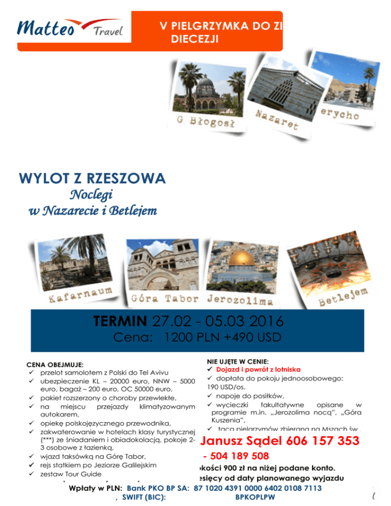 V PIELGRZYMKA DO ZIEMI ŚWIĘTEJ DIECEZJI RZESZOWSKIEJ WYLOT Z RZESZOWA Noclegi w Nazarecie i Betlejem TERMIN 27.02 - 05.03 2016 Cena: 1200 PLN +490 USD NIE UJĘTE W CENIE: CENA OBEJMUJE: Dojazd i powrót z lotniska przelot samolotem z Polski do Tel Avivu dopłata do pokoju jednoosobowego: ubezpieczenie KL – 20000 euro, NNW – 5000 190 USD/os. euro, bagaż – 200 euro, OC 50000 euro, napoje do posiłków, pakiet rozszerzony o choroby przewlekłe, wycieczki fakultatywne opisane w na miejscu przejazdy klimatyzowanym programie m.in. „Jerozolima nocą”, „Góra autokarem, Kuszenia”, opiekę polskojęzycznego przewodnika, taca pielgrzymów zbierana na Mszach św., zakwaterowanie w hotelach klasy turystycznej Ubezpieczenie od kosztów rezygnacji – 3% (***) ze śniadaniem i obiadokolacją, pokoje 2ceny pielgrzymki tj. ok. 92 zł/os 3 osobowe z łazienką, 135 189 USD - 508 bilety wstępów do zwiedzanych wjazd taksówką na Górę lubTabor, Matteo Travel -504 obiektów oraz zwyczajowe napiwki: rejs statkiempo pozapisaniu Jeziorze Galilejskim Zaliczka się na listę w wysokości 900 zł na niżej podane konto. oddzielnie płatne u przewodnika lub osoby Biuro Podróży Matteo Travel, zestaw Tour Guide tel. +48 504 189 508 lub +48 604 570 550, pn.-sob. 9:00–17:00 koordynującej wyjazd po przylocie Paszport musi być ważny minimum 6 miesięcy od daty planowanego wyjazdu do e-mail: [email protected], www.matteotravel.pl Izraela opłata obligatoryjna, Wpłaty w PLN: Bank PKO BP SA: 87 1020 4391- 0000 6402 0108 7113 RYBA ŚW. Piotra z sałatkami, Zgłoszenia przyjmuje: Ks. dr Janusz Sądel 606 157 353 , SWIFT (BIC): BPKOPLPW PIELGRZYMKA DO ZIEMI ŚWIĘTEJ \ Dzień 1, 27.02, sb POLSKA – TEL AVIV Zbiórka uczestników na lotnisku w Rzeszowie. Odprawa bagażowo – paszportowa. Przylot do Tel Avivu, spotkanie z przewodnikiem i przejazd do Betlejem, zakwaterowanie, obiadokolacja i nocleg. Dzień 2, 24.01, ndz EIN KAREM–YAD VASHEM–G. SYJON Śniadanie. Przejazd do Ein Karem (kościół Nawiedzenia św. Elżbiety i Narodzenia św. Jana Chrzciciela). Muzeum Holokaustu: Yad Vaszem. Knesset i Menora przed Parlamentem. Następnie Góra Syjon w Jerozolimie – Bazylika Zaśnięcia Najświętszej Maryi Panny, Wieczernik oraz grób króla Dawida. Pole Pasterzy - gdzie aniołowie obwieścili pasterzom narodzenie Chrystusa. Obiadokolacja i nocleg w Betlejem. Dzień 3, 25.01, pn G. OLIWNA - BETLEJEM Śniadanie. Następnie wjazd na Górę Oliwną – Betfage, dla chętnych Kopuła Wniebowstąpienia (ok. 1,5 USD/os), panoramiczny widok na Wzgórze Świątynne oraz mury Starego Miasta. Zwiedzanie kościoła Pater Noster - Ojcze Nasz, Kościół Dominus Flevit (Pan zapłakał), Ogród Oliwny – Getsemani i Bazylika Męki Pańskiej, kościół grobu Maryi oraz Grota Snu Apostołów. Przejście do Kościoła In Galicantu. Zwiedzanie Betlejem Bazylika Narodzenia Pana Jezusa. Kościół ten powstał w miejscu narodzenia Jezusa i jest najstarszym czynnym kościołem na świecie, Grota Mleczna, Grota św. Hieronima w kościele św. Katarzyny. Obiadokolacja i nocleg w Betlejem. Dla chętnych zwiedzanie „Jerozolimy nocą” (ok. 25 USD/os). Dzień 4, 26.01, wt WADI QELT - JERYCHO KACAR EL JAHUD – MORZE MARTWE - QUMRAN – BETANIA Śniadanie. Przejazd obok klasztoru Teodozjusza do kanionu Wadi Qelt (panorama na Pustynię Judzką oraz klasztor św. Jerzego), Jerycho (najstarsze miasto świata) - krótki postój pod Qarantal - Góra Kuszenia Jezusa oraz zdjęcia pod drzewem Sykomora i przy źródle Elizeusza. Panorama na ruiny Starego Jerycha (wykopaliska sprzed 11 tys. lat). Klasztor na Górze Kuszenia. Dla chętnych możliwość wjazdu na Górę Kuszenia kolejką linową do Klasztoru Kuszenia (15 USD/os). Przejazd do Kacar El Jahud – prawdziwego miejsca chrztu Pana Jezusa. Odnowienie chrztu św. dla Pielgrzymów w rzece Jordan. Plażowanie i kąpiel w Morzu Martwym na prywatnej plaży (największa depresja Biuro Podróży Matteo Travel, tel. +48 504 189 508 lub +48 604 570 550, pn.-sob. 9:00–17:00 e-mail: [email protected], www.matteotravel.pl na świecie – 417 m ppm). Następnie Qumran – panorama na groty, gdzie znaleziono słynne zwoje Pisma Świętego. Betania – kościół i grobowiec Łazarza. Obiadokolacja i nocleg w Betlejem. Dzień 5, 27.01, śr JEROZOLIMA: DROGA KRZYŻOWA Śniadanie. Wyjazd do Jerozolimy. Przejście przez bramę Św. Szczepana, Kościół św. Anny i sadzawka Betesda, Klasztor Biczowania. Droga Krzyżowa (nabożeństwo) od miejsca skazania Jezusa - Via Dolorosa - do Golgoty i Bazyliki Grobu Pańskiego. Czas na osobistą modlitwę. Przejście przez Dzielnicę Żydowską (Cardo i Synagoga Hurva) do Kotel Maarawi (Ściana Płaczu). Obiadokolacja i nocleg w Betlejem. Dzień 6, 28.01, czw CEZAREA - HAJFA - KANA – NAZARET Śniadanie. Przejazd do Hajfy: kościół Stella Maris, klasztor Karmelitański, panorama na ogrody Bahajskie i zatokę Hajfa. Po drodze Cezarea Nadmorska – widok na amfiteatr i ruiny zamku Krzyżowców oraz akwedukt z czasów rzymskich. Przejazd do Kany Galilejskiej, gdzie Jezus przemienił wodę w wino: dla chętnych możliwość odnowienia przyrzeczeń małżeńskich oraz zakupu wina. Zwiedzanie Nazaretu: Bazylika Zwiastowania i dom św. Józefa, gdzie mieszkała Święta Rodzina. Obiadokolacja i nocleg w Nazarecie. Dzień 7, 29.01, pt TABHA - G. BŁOGOSŁAWIEŃSTW – KAFARNAUM - G. TABOR Śniadanie. Przejazd w okolice Jeziora Galilejskiego: Góra Błogosławieństw, Tabha miejsce cudownego rozmnożenia ryb i chleba oraz miejsce prymatu Piotra, Kafarnaum: Dom Piotra i stara synagoga, rejs po Jeziorze Galilejskim. Następnie wjazd taksówkami wieloosobowymi (tzw szerut taxi) na górę Tabor. Obiadokolacja i nocleg w Nazarecie. Dzień 8, 30.01, sb TLV - ODLOT Wczesne śniadanie w postaci ciastek, kawy i herbaty. Przejazd na lotnisko i odlot do kraju. Przylot do Polski i zakończenie pielgrzymki. Spotkania organizacyjne w kościele pw. Chrystusa Króla 