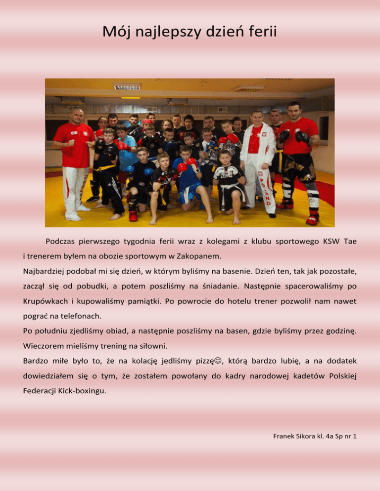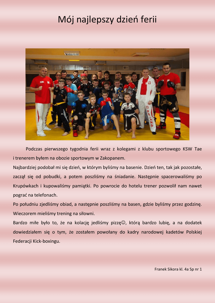Mój najlepszy dzień ferii Podczas pierwszego tygodnia ferii wraz z kolegami z klubu sportowego KSW Tae i trenerem byłem na obozie sportowym w Zakopanem. Najbardziej podobał mi się dzień, w którym byliśmy na basenie. Dzień ten, tak jak pozostałe, zaczął się od pobudki, a potem poszliśmy na śniadanie. Następnie spacerowaliśmy po Krupówkach i kupowaliśmy pamiątki. Po powrocie do hotelu trener pozwolił nam nawet pograć na telefonach. Po południu zjedliśmy obiad, a następnie poszliśmy na basen, gdzie byliśmy przez godzinę. Wieczorem mieliśmy trening na siłowni. Bardzo miłe było to, że na kolację jedliśmy pizzę, którą bardzo lubię, a na dodatek dowiedziałem się o tym, że zostałem powołany do kadry narodowej kadetów Polskiej Federacji Kick-boxingu. Franek Sikora kl. 4a Sp nr 1