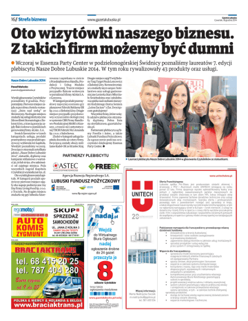 16// Strefa biznesu Gazeta Lubuska Czwartek, 18 grudnia 2014 www.gazetalubuska.pl Oto wizytówki naszego biznesu. Z takich firm możemy być dumni A Wczoraj w Essenza Party Center w podzielonogórskiej Świdnicy poznaliśmy laureatów 7. edycji plebiscytu Nasze Dobre Lubuskie 2014. W tym roku rywalizowały 43 produkty oraz usługi. Paweł Wańczko [email protected] WynikigłosowaniaCzytelników poznaliśmy 8 grudnia. Przypomnijmy. Pierwsze miejsce zajęła zupa rybna z hotelu-restauracji „Dom nad rzeką” ze Skwierzyny. Na drugim miejscu znalazłysię usługi dentystyczne ZdrowiDent Stomatologia z Zielonej Góry, a trzecią pozycję zajęły flaki wołowe w pomidorach gorzowskiej firmy AGAin. S.A. Swoich faworytów w trzech kategoriach: usługa, produkt przemysłowyorazproduktspożywczy wybierała też kapituła. Werdykt poznaliśmy wczoraj. Zwycięzcyotrzymalicertyfikaty jakości „Nasze Dobre Lubuskie 2014”, statuetki, dyplomy oraz kampanie reklamowe o wartości30,20lub10tys.złwzależności od zajętego miejsca. Pula wszystkich nagród (kapituła iCzytelnicy)wyniosła240tys.zł. Oto wyniki głosowania kapituły. W kategorii produkt spożywczy pierwsze miejsce zajęły eko napoje probiotyczne Joy Day firmy Living Food Sp. z o.o. z Trzciela. Na drugim miejscu znalazła się gęś lubuska fasze- rowana i zapiekana w cieście z Przedsiębiorstwa Handlu, Produkcji i Usług Madaks z Przytocznej. Trzecie miejsce przypadło flakom wołowym w pomidorach firmy AGAin S.A. z Gorzowa. Wkategorii produkt przemysłowy najwyżej oceniono gry planszowe Fabryki Reklamy IBI Sp. z o.o. z Zielonej Góry. Drugie miejsce przypadło przydomowej oczyszczalni ekologicznej w systemie CBR Firmy Handlowo-Produkcyjnej MARO z Krzeszyc, a trzecie nici antystatycznej THOR Fabryki Nici Amanda Sp. z o.o. z Sulechowa. Z kolei w kategorii usługa kapituła doceniła aż cztery firmy. Zwycięzcą zostały obozy militarne Kadet-OK ze Strzelec Kraj. Drugie miejsce zajął Twój Zielony Targ Target Paula Lencewicz z Zielonej Góry. Na trzecim miejscu znalazły się ex aequo: hotelarstwo oraz usługi gastronomiczne Leniwka Stary Młyn koło Świebodzina oraz całodobowa opieka nad osobami starszymi Rodzinnego Domu Seniora „Leśne Zacisze” z Żar. Zwycięzcom gratulujemy! Wszystkie firmy, które wzięły udział w plebiscycie otrzymały dyplomy. Pełna lista na strefabiznesu.gazetalubuska.pl. Partnerami plebiscytu są firmy FreeEn i Astec, a także Lubuski Fundusz Pożyczkowy. Za ugoszczenie podczas uroczystości dziękujemy Essenza Party Center. a FOT. MARIUSZ KAPAŁA NaszeDobreLubuskie2014 PARTNERZY PLEBISCYTU b Laureaci plebiscytu Nasze Dobre Lubuskie 2014 w głosowaniu Czytelników ze statuetkami. REKLAMA REKLAMA Z014013601A REKLAMA Z014012264B Z064000696D