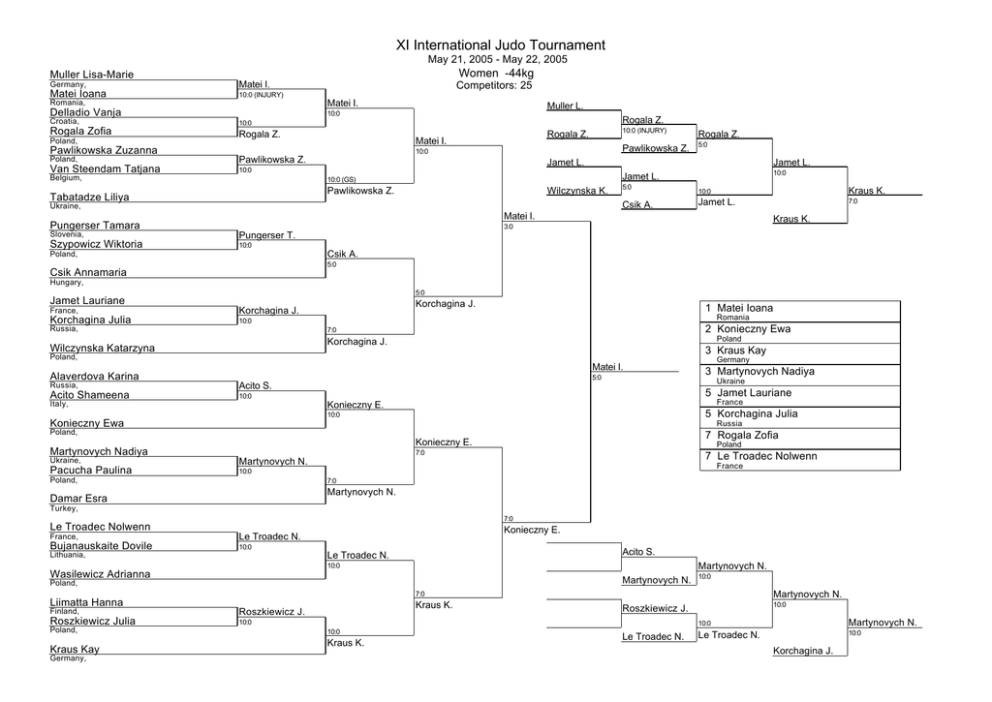 XI International Judo Tournament May 21, 2005 - May 22, 2005 Women -44kg Muller Lisa-Marie Germany, Matei I. Matei Ioana 10:0 (INJURY) Matei I. Romania, Delladio Vanja Croatia, Rogala Zofia Poland, Pawlikowska Zuzanna Competitors: 25 Muller L. 10:0 Rogala Z. 10:0 Rogala Z. Rogala Z. Matei I. 10:0 Poland, Pawlikowska Z. Van Steendam Tatjana 10:0 Belgium, Rogala Z. Pawlikowska Z. 5:0 Jamet L. Jamet L. 10:0 Jamet L. 10:0 (GS) Pawlikowska Z. Tabatadze Liliya 10:0 (INJURY) Wilczynska K. 5:0 Csik A. Ukraine, 10:0 Kraus K. Jamet L. 7:0 Matei I. Pungerser Tamara Slovenia, Szypowicz Wiktoria Kraus K. 3:0 Pungerser T. 10:0 Csik A. Poland, 5:0 Csik Annamaria Hungary, 5:0 Jamet Lauriane France, Korchagina J. Korchagina Julia 10:0 Russia, Korchagina J. 1 Matei Ioana Romania 2 Konieczny Ewa 7:0 Poland Korchagina J. Wilczynska Katarzyna 3 Kraus Kay Poland, Matei I. Alaverdova Karina 5:0 Russia, Acito S. Acito Shameena 10:0 Italy, Ukraine 5 Jamet Lauriane France Konieczny E. 5 Korchagina Julia 10:0 Konieczny Ewa Russia Poland, 7 Rogala Zofia Konieczny E. Martynovych Nadiya Ukraine, Pacucha Paulina Germany 3 Martynovych Nadiya Poland 7:0 7 Le Troadec Nolwenn Martynovych N. France 10:0 Poland, 7:0 Martynovych N. Damar Esra Turkey, 7:0 Le Troadec Nolwenn France, Le Troadec N. Bujanauskaite Dovile 10:0 Konieczny E. Acito S. Le Troadec N. Lithuania, Martynovych N. 10:0 Wasilewicz Adrianna Martynovych N. Poland, 10:0 Martynovych N. 7:0 Liimatta Hanna Finland, Roszkiewicz J. Roszkiewicz Julia 10:0 Poland, Kraus Kay Germany, Kraus K. 10:0 Kraus K. 10:0 Roszkiewicz J. Le Troadec N. 10:0 Martynovych N. Le Troadec N. 10:0 Korchagina J.